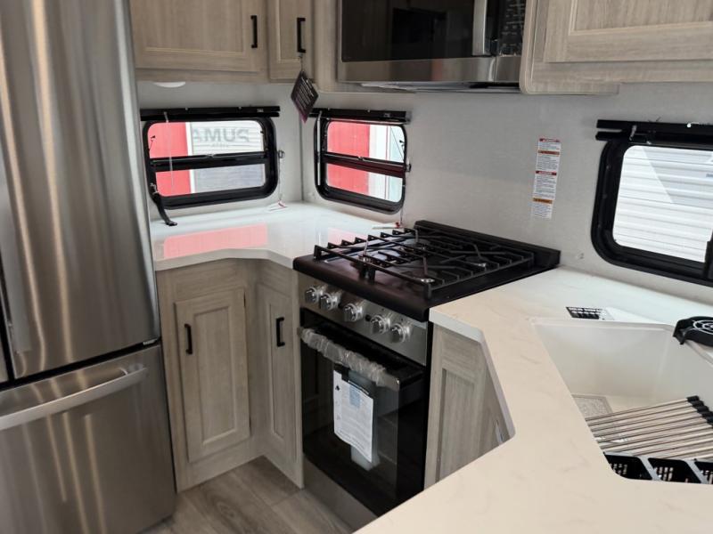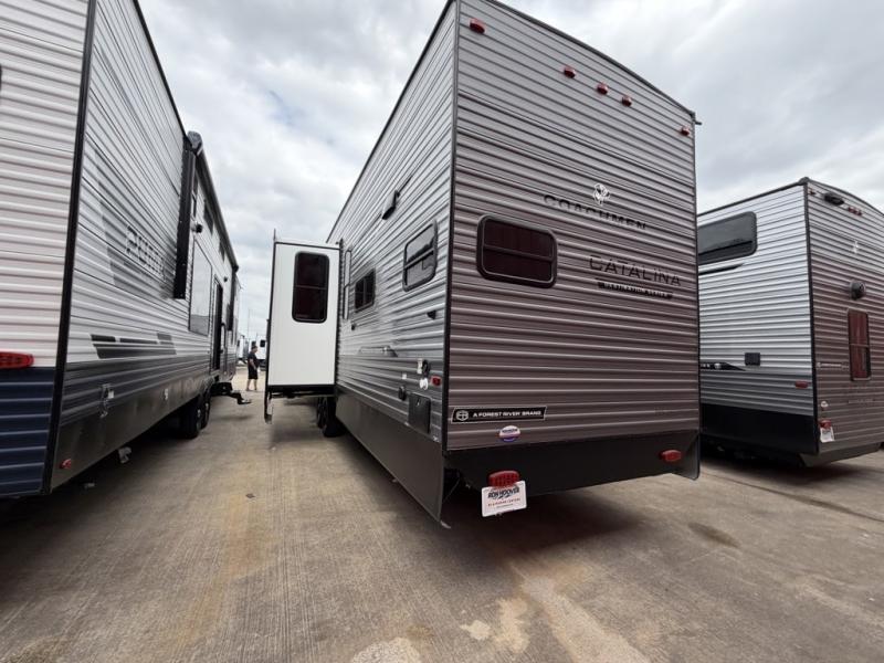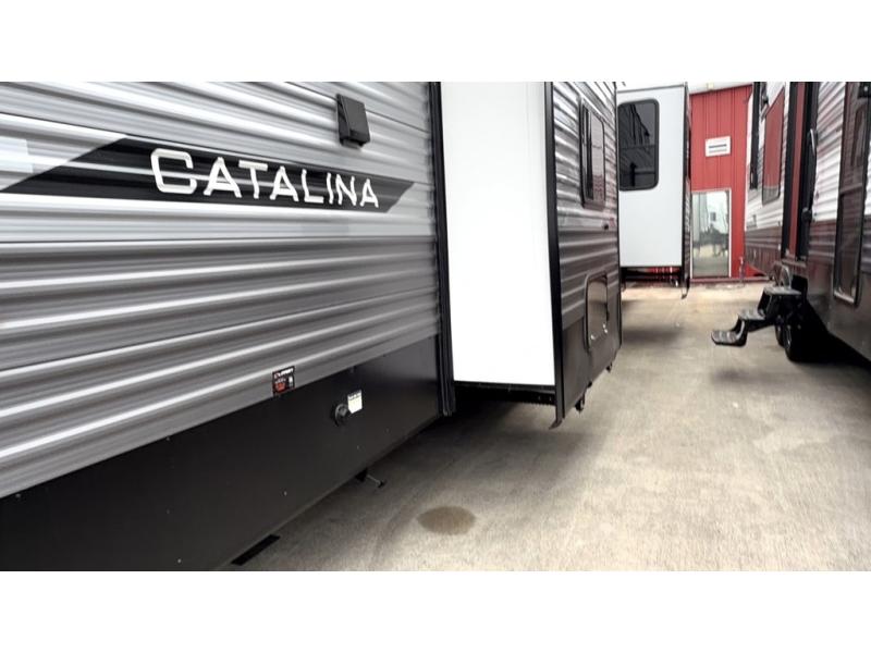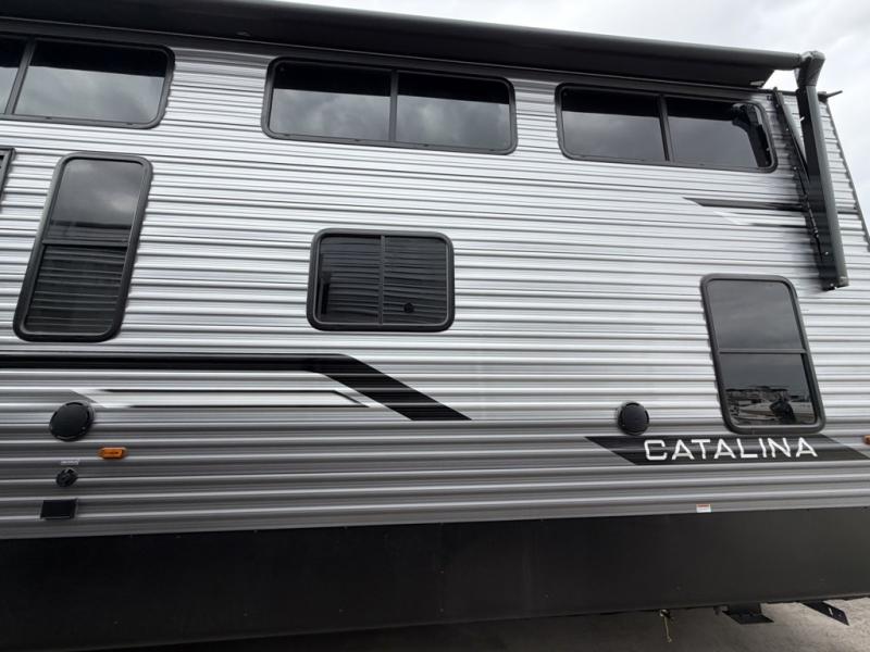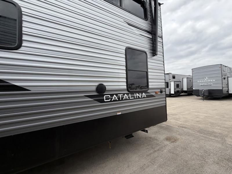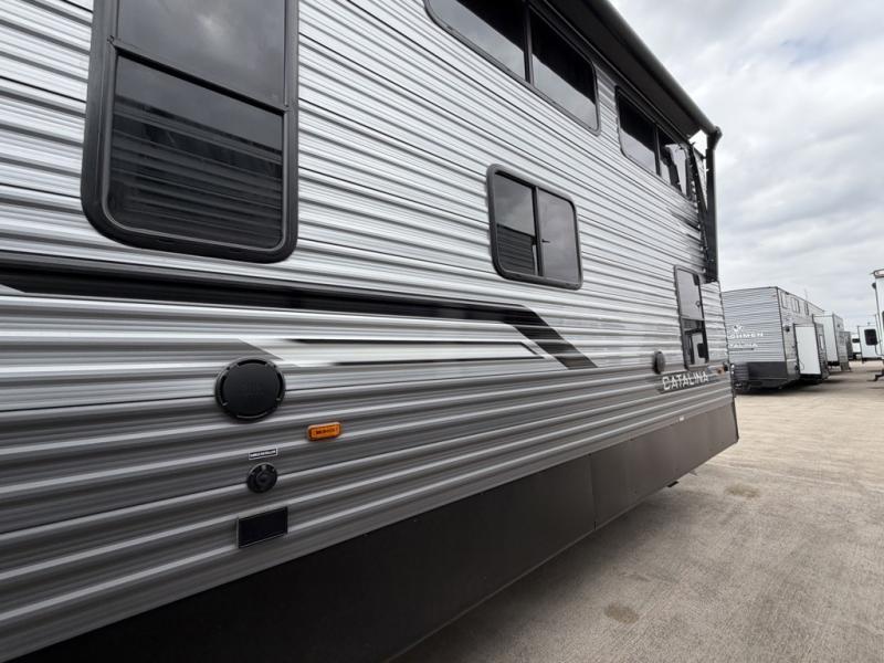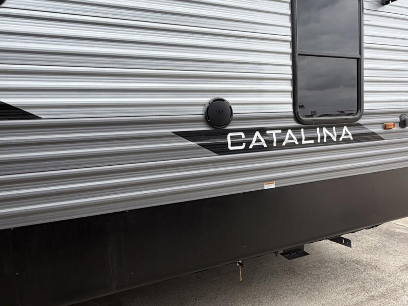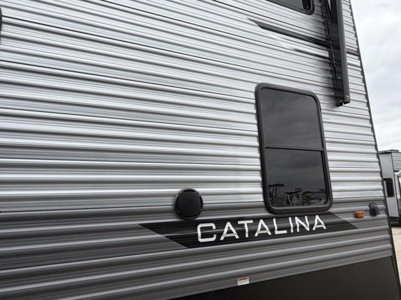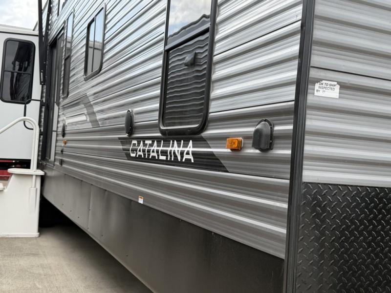 With any Catalina Destination trailer by Coachmen, you will enjoy comfortable extended stays wherever you decide to set up camp! The full length frame outriggers add strength to each unit, along with a seamless Alpha Roof membrane and Norco electromagnetic, powder coated chassis. You will love the open views provided by the residential-style sliding glass patio door, plus there are GE appliances, woodplank linoleum flooring, and hard valance window treatments to make your space feel more like home. Head outside to find a convenient "Leash Link" quick hookup D-ring for your furry friends, premium JBL exterior speakers, flush mount baggage doors for your gear, and the list of amenities goes on!