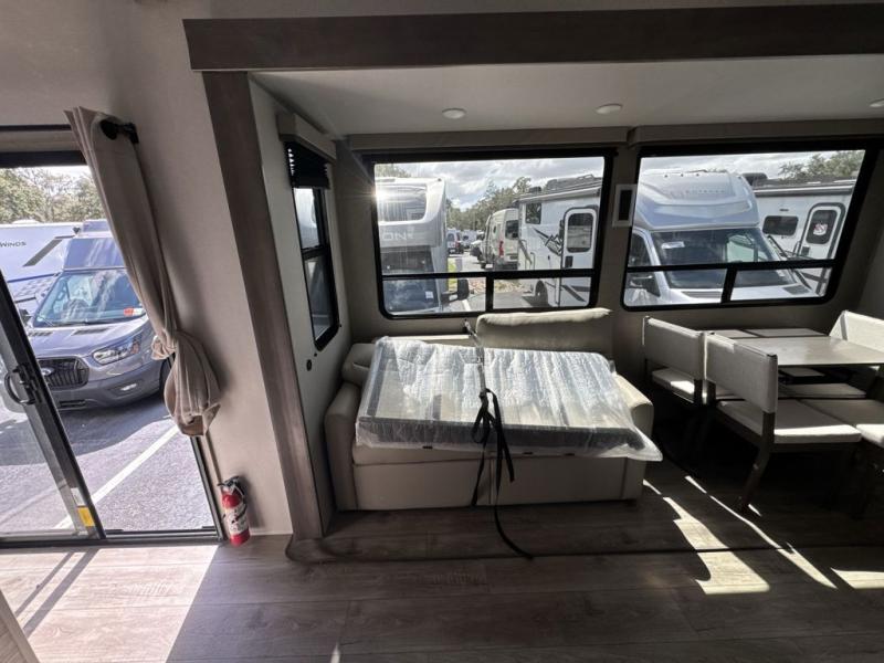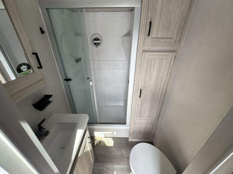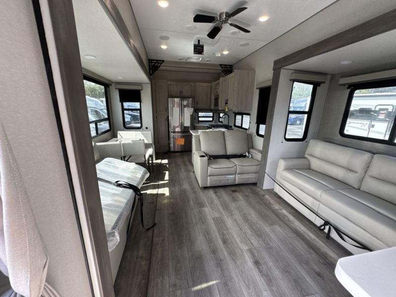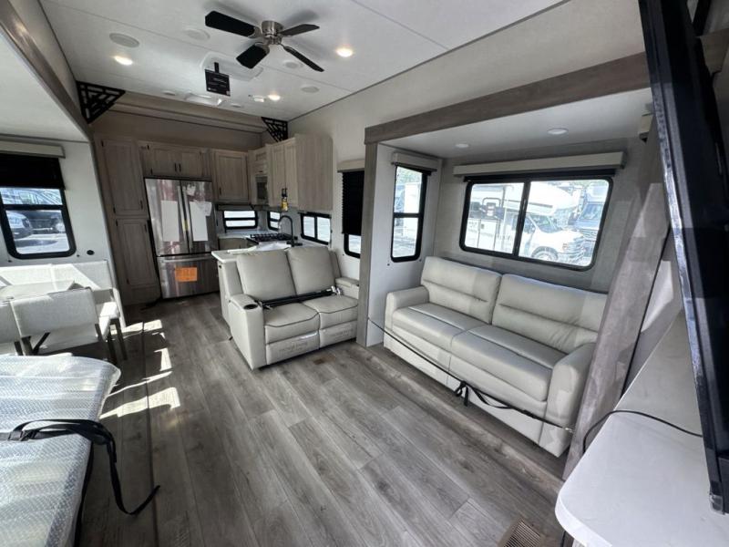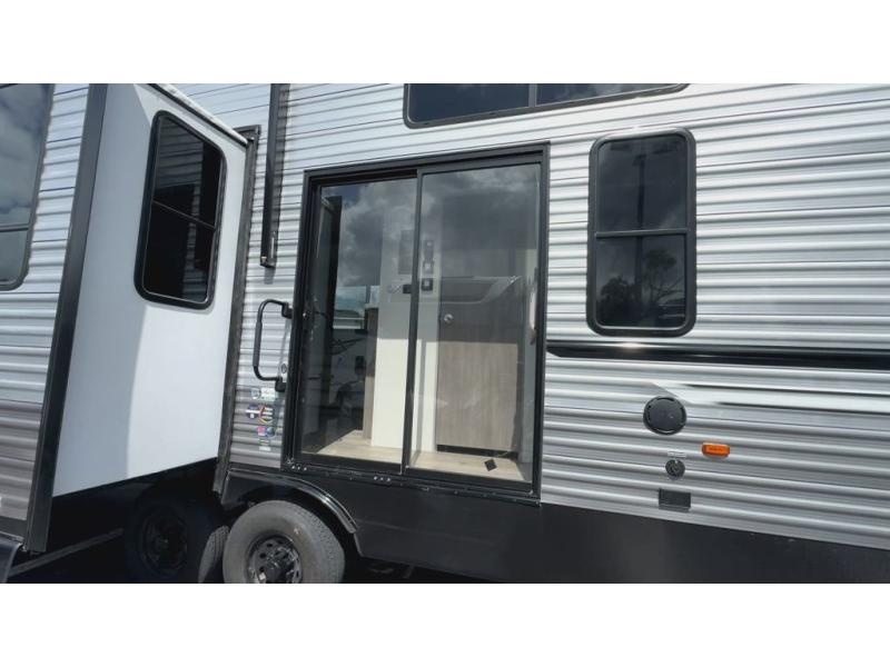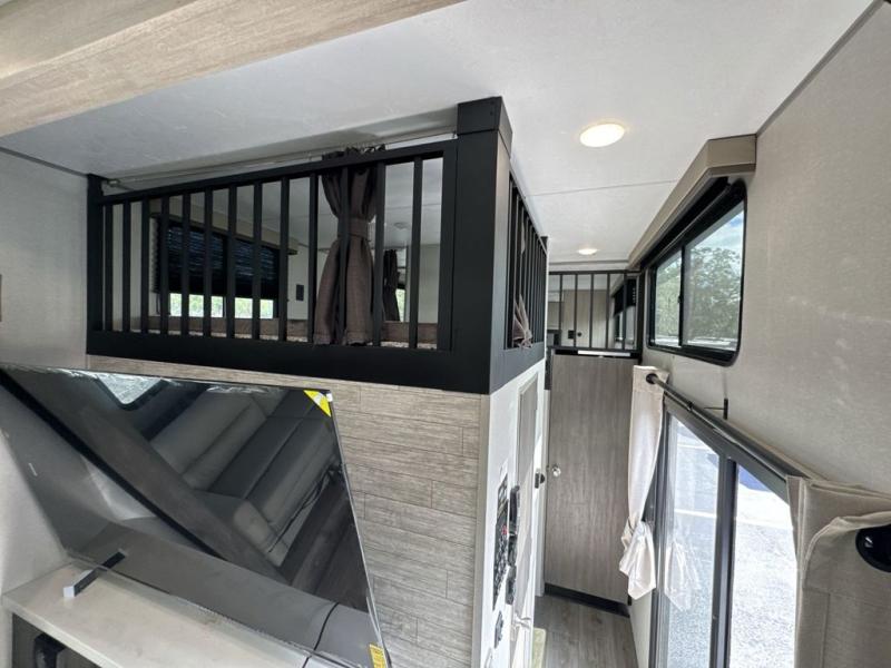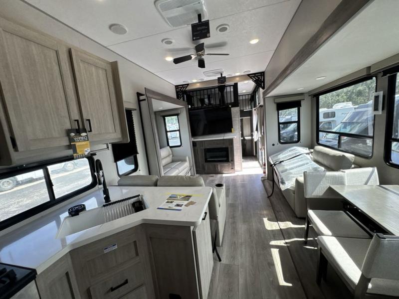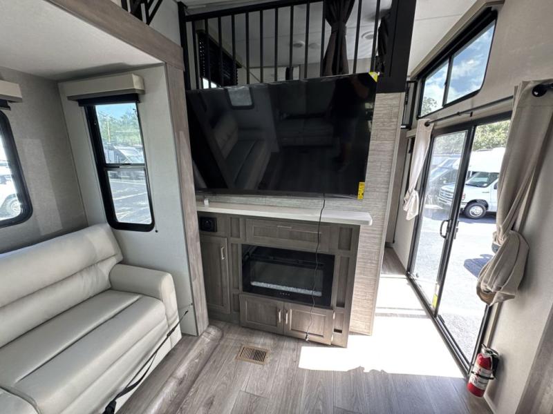 If you want to get out of the house without missing the comfort, you will love this destination trailer! Feel at home the moment you step in through the patio door and head to the open living area with double slide-outs making room for tons of seating areas to enjoy quality time by the fireplace with your guests. You will fall in love with the residential style kitchen featuring a 4 burner range, french door refrigerator, pantry, and much more to make your favorite recipes on the go. There is no such thing as too many guests when you have a loft that has two queen beds and a 28 x 64 bunk matt to rest. In the main floor you will have a master bedroom all to yourself that has its own private bath offering comfort and convenience at only a few steps away from your king bed.