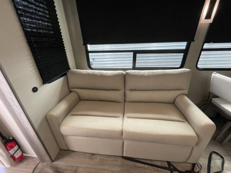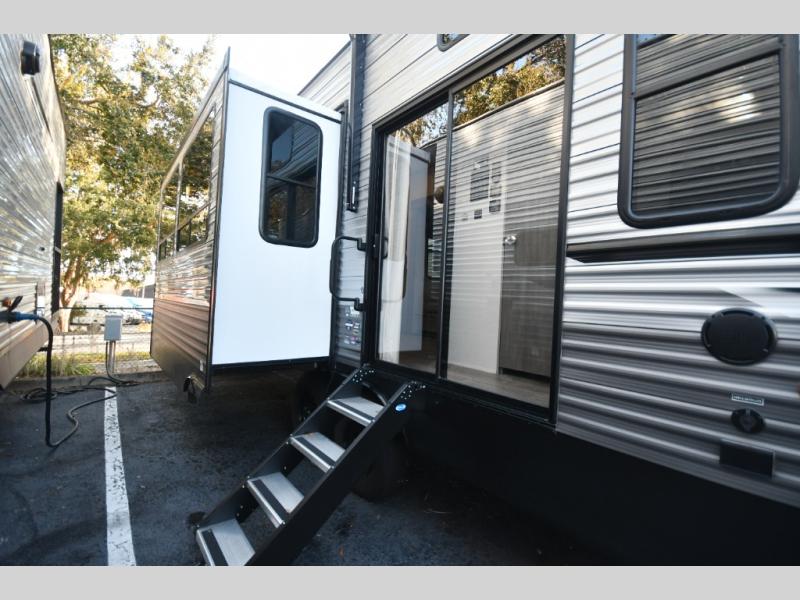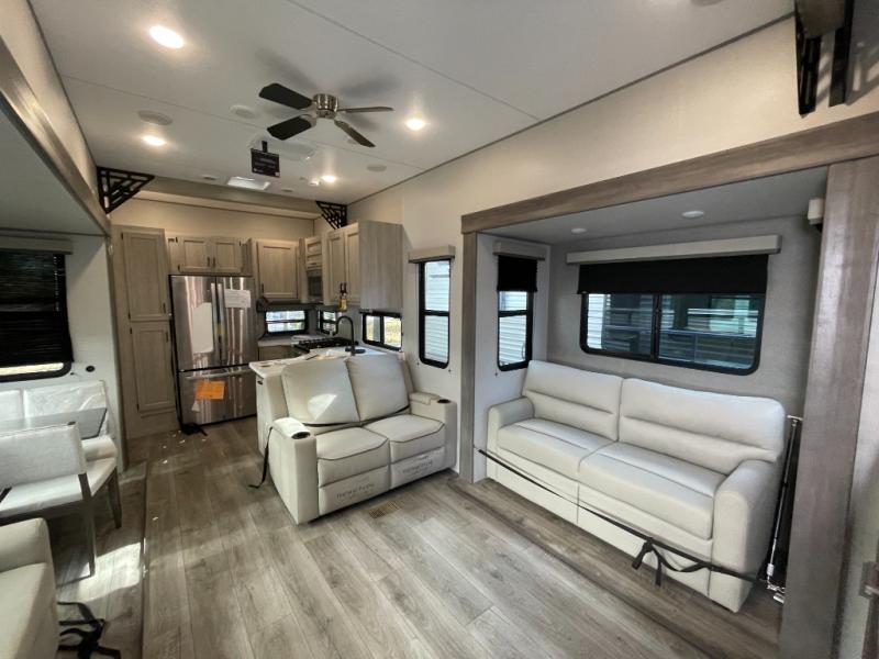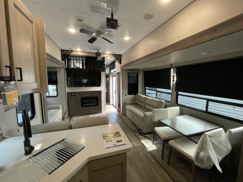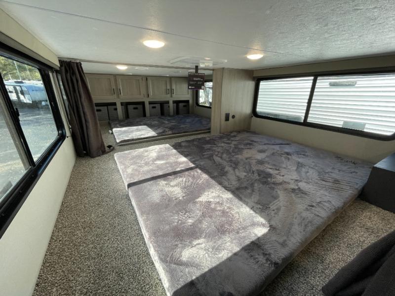 If you want to get out of the house without missing the comfort, you will love this destination trailer! Feel at home the moment you step in through the patio door and head to the open living area with double slide-outs making room for tons of seating areas to enjoy quality time by the fireplace with your guests. You will fall in love with the residential style kitchen featuring a 4 burner range, french door refrigerator, pantry, and much more to make your favorite recipes on the go. There is no such thing as too many guests when you have a loft that has two queen beds and a 28 x 64 bunk matt to rest. In the main floor you will have a master bedroom all to yourself that has its own private bath offering comfort and convenience at only a few steps away from your king bed.