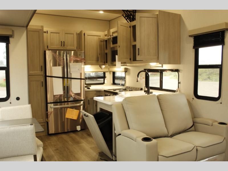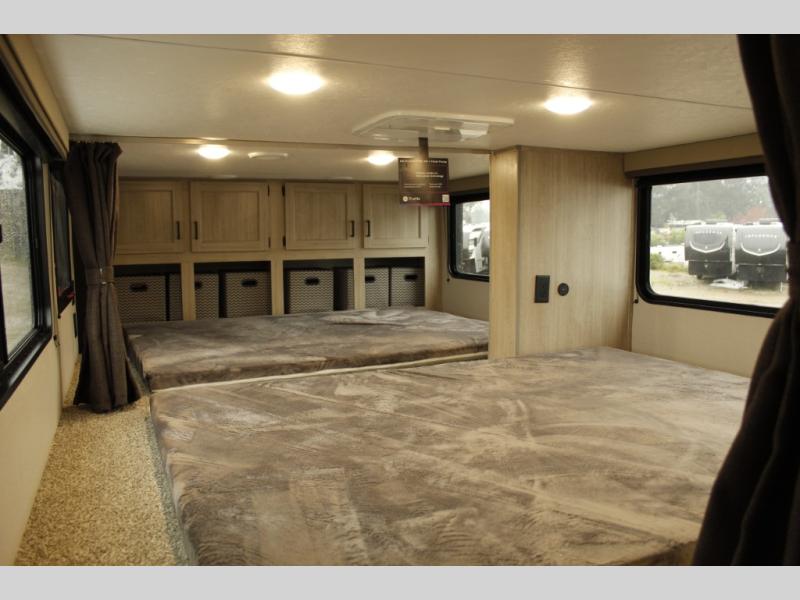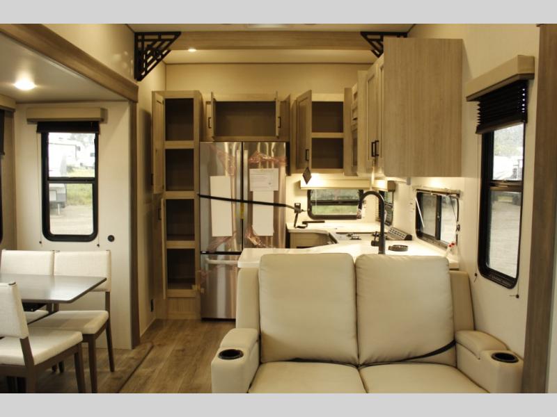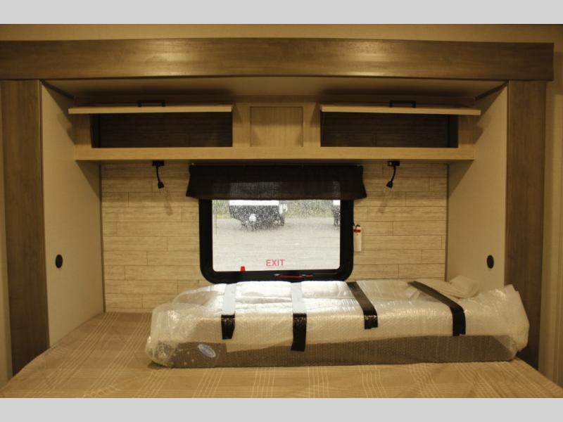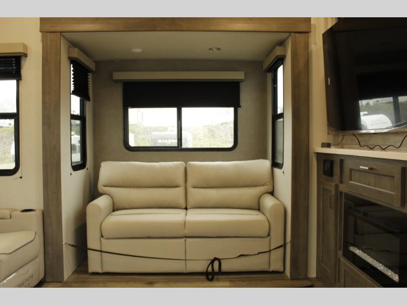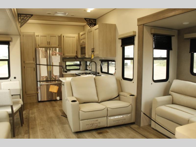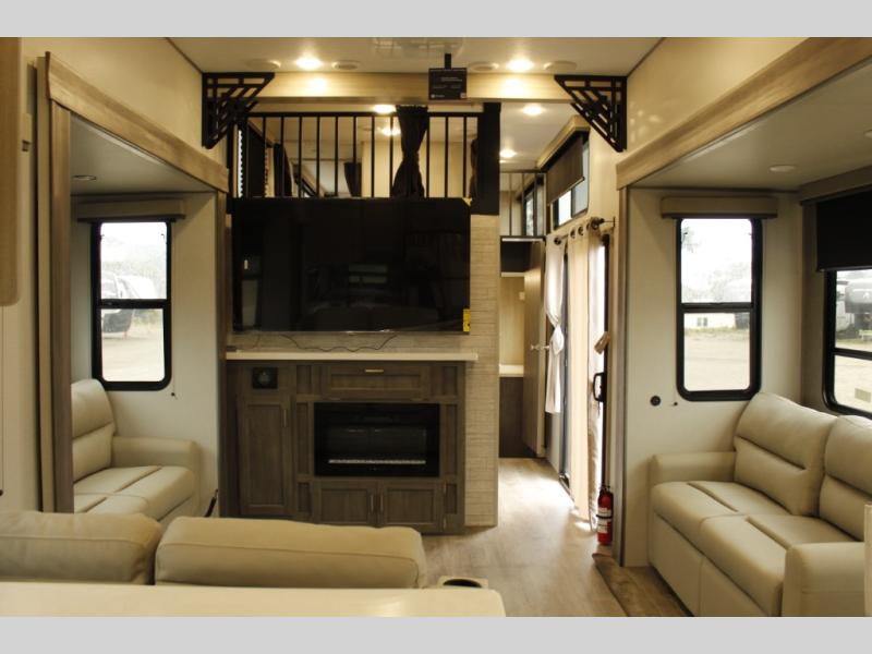 If you want to get out of the house without missing the comfort, you will love this destination trailer! Feel at home the moment you step in through the patio door and head to the open living area with double slide-outs making room for tons of seating areas to enjoy quality time by the fireplace with your guests. You will fall in love with the residential style kitchen featuring a 4 burner range, french door refrigerator, pantry, and much more to make your favorite recipes on the go. There is no such thing as too many guests when you have a loft that has two queen beds and a 28 x 64 bunk matt to rest. In the main floor you will have a master bedroom all to yourself that has its own private bath offering comfort and convenience at only a few steps away from your king bed.