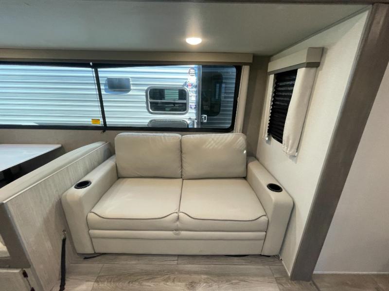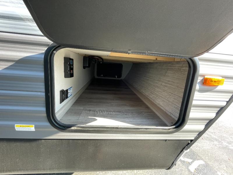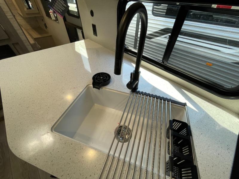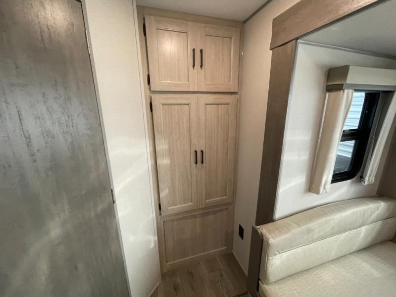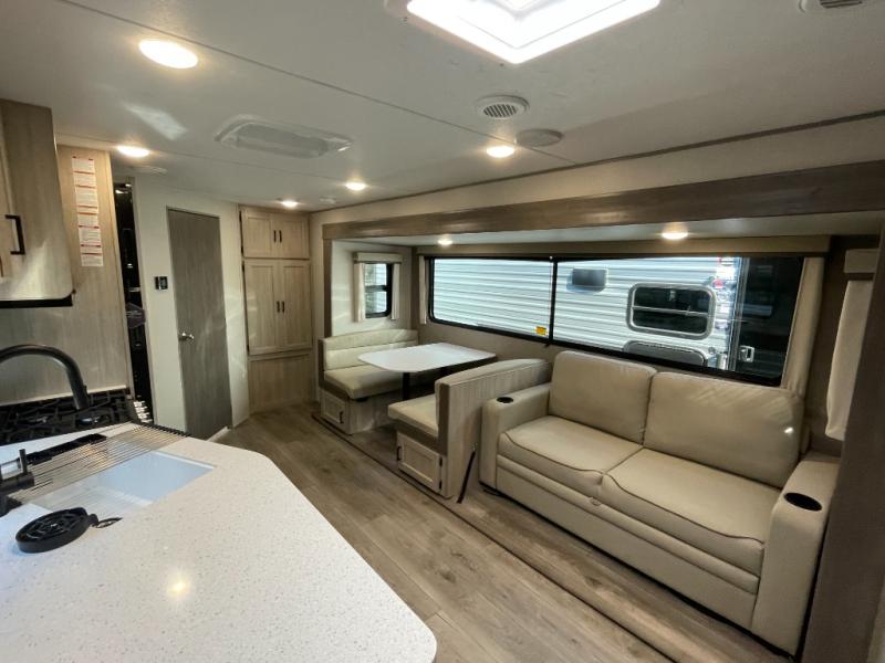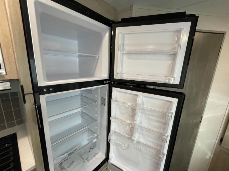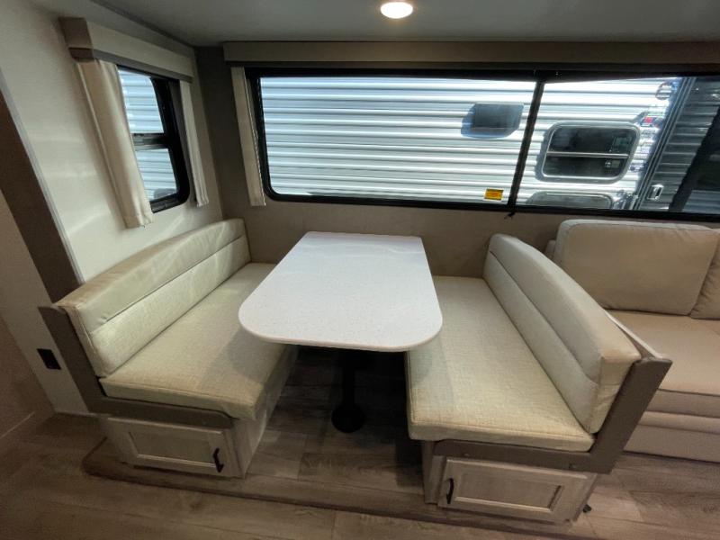 This half-ton friendly trailer is easy to pull and park and is spacious thanks to the large slide out in the main living and kitchen area! You can dine at the booth dinette or choose the free-standing dinette option, and the trundle sofa offers drink holders for your drink when you're relaxing. The rear corner offers a full bathroom and a large wardrobe/pantry for the storage you need. The galley kitchen offers full amenities plus a breakfast bar where you can set out fresh fruit and cereal. And the 15' awning provides protection from the elements plus has the choice of multiple LED colors with the use of the remote.