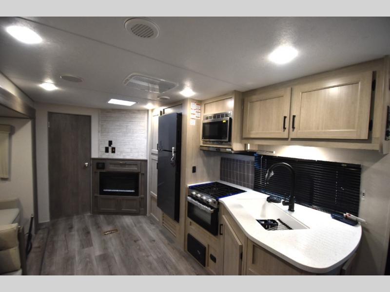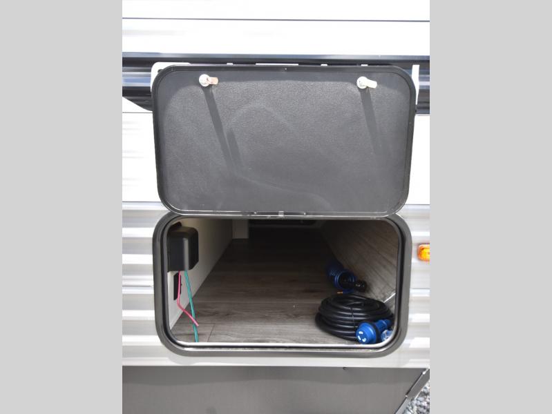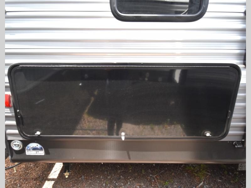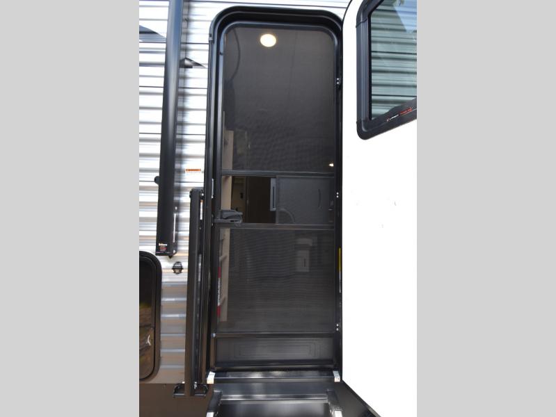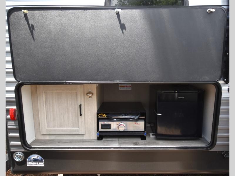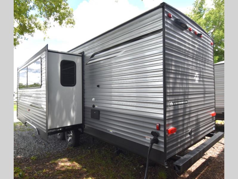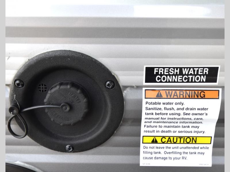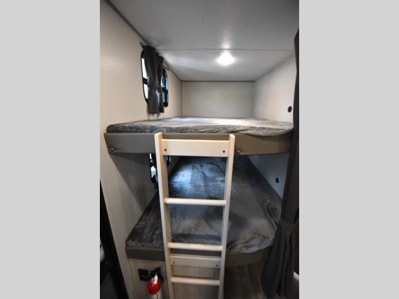 When you enjoy camping with your own accommodations and space for the whole crew, hitch this trailer up and head to the campgrounds! After loading everything easily thanks to the dual entry doors and all the interior and exterior storage, you will have no worries that you left anything behind. The electric awning is easy to set up, like the large slide out, and the awning offers multicolor LED lights to choose from by using the remote. When you are outside the cook might like to make a meal using the outside camper kitchen. The interior kitchen offers full amenities including a pantry, and everyone can enjoy the angled entertainment center. There are double-size bunks with a ladder for the kids and a walk-around queen bed for the owner to sleep on, plus furniture in the living area that doubles as additional sleeping space!