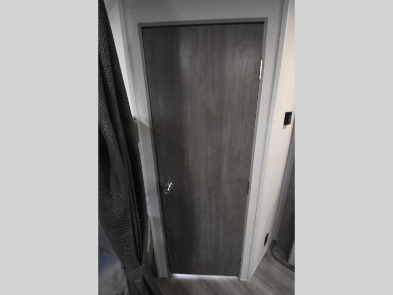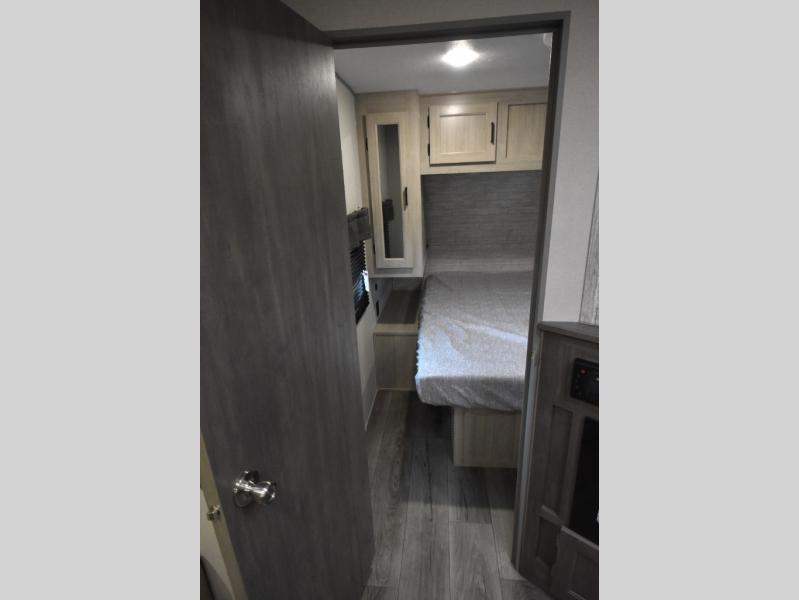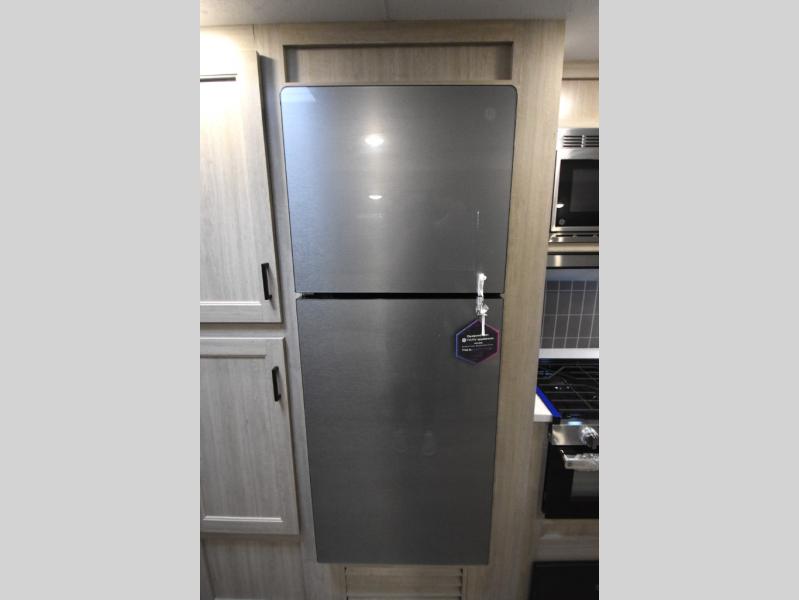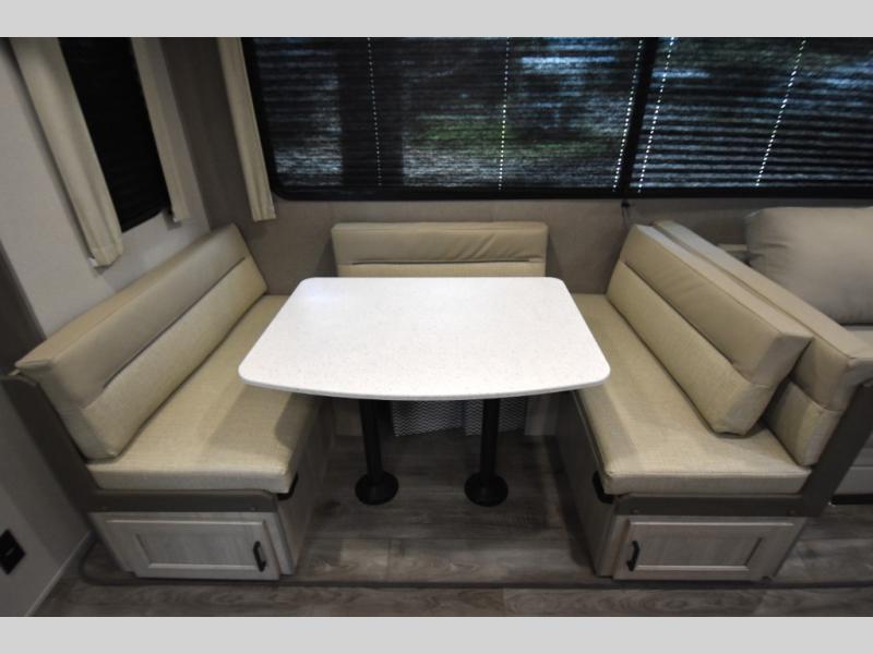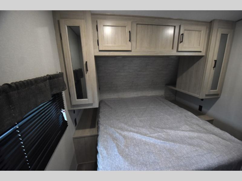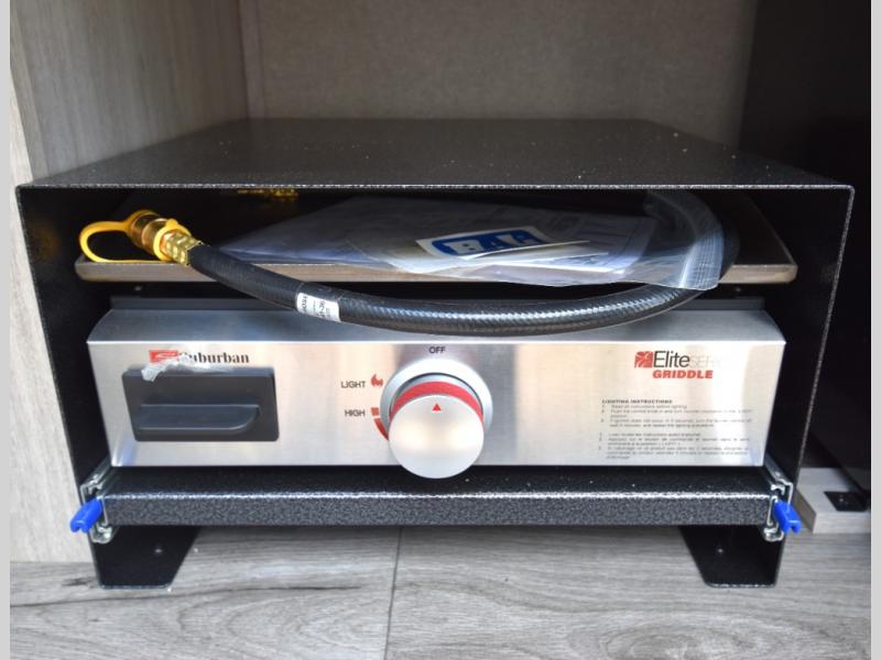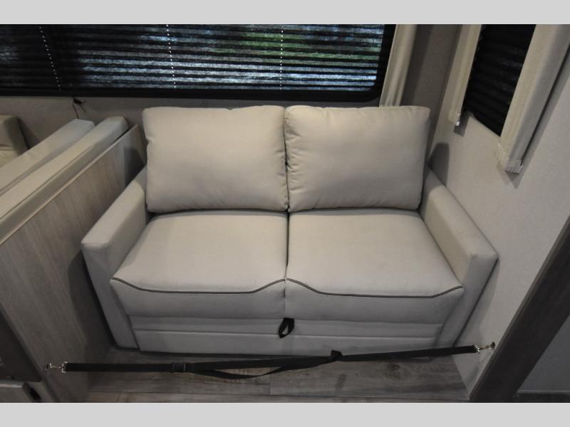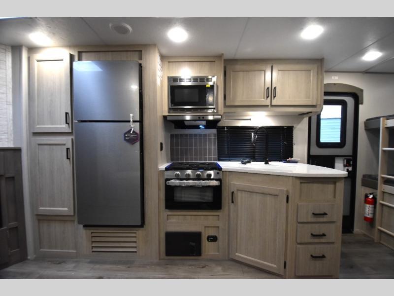 When you enjoy camping with your own accommodations and space for the whole crew, hitch this trailer up and head to the campgrounds! After loading everything easily thanks to the dual entry doors and all the interior and exterior storage, you will have no worries that you left anything behind. The electric awning is easy to set up, like the large slide out, and the awning offers multicolor LED lights to choose from by using the remote. When you are outside the cook might like to make a meal using the outside camper kitchen. The interior kitchen offers full amenities including a pantry, and everyone can enjoy the angled entertainment center. There are double-size bunks with a ladder for the kids and a walk-around queen bed for the owner to sleep on, plus furniture in the living area that doubles as additional sleeping space!