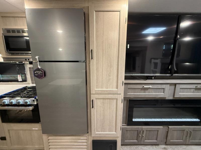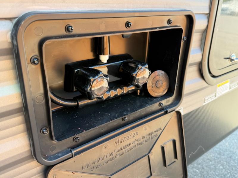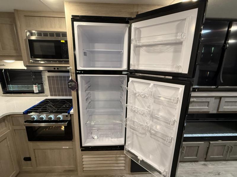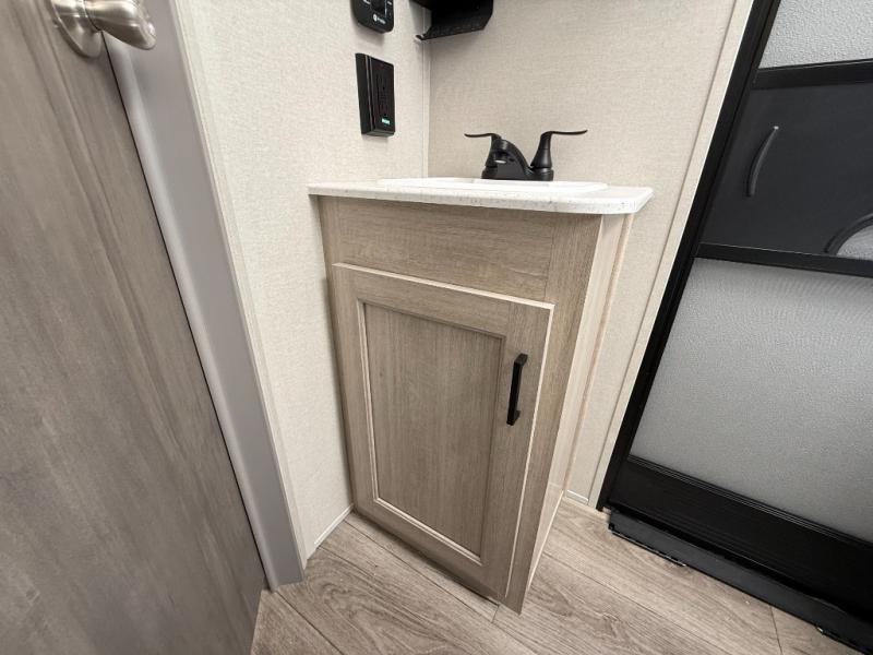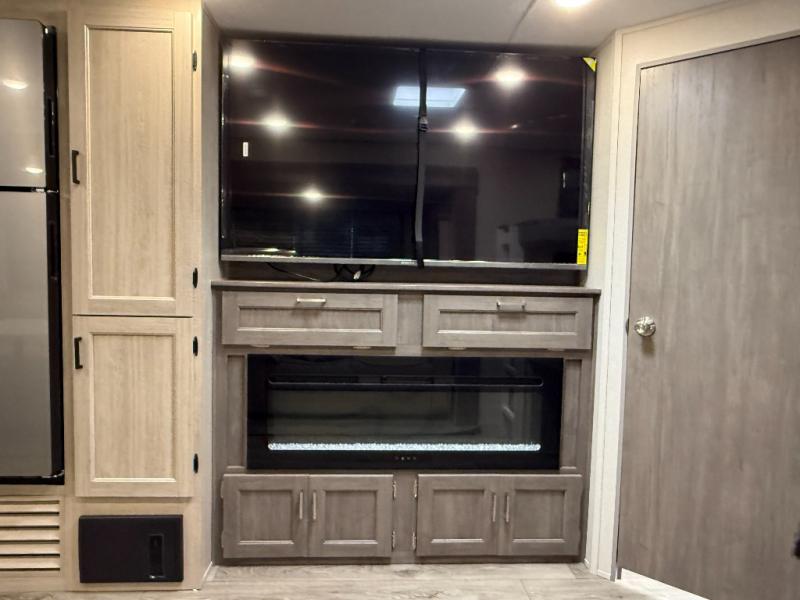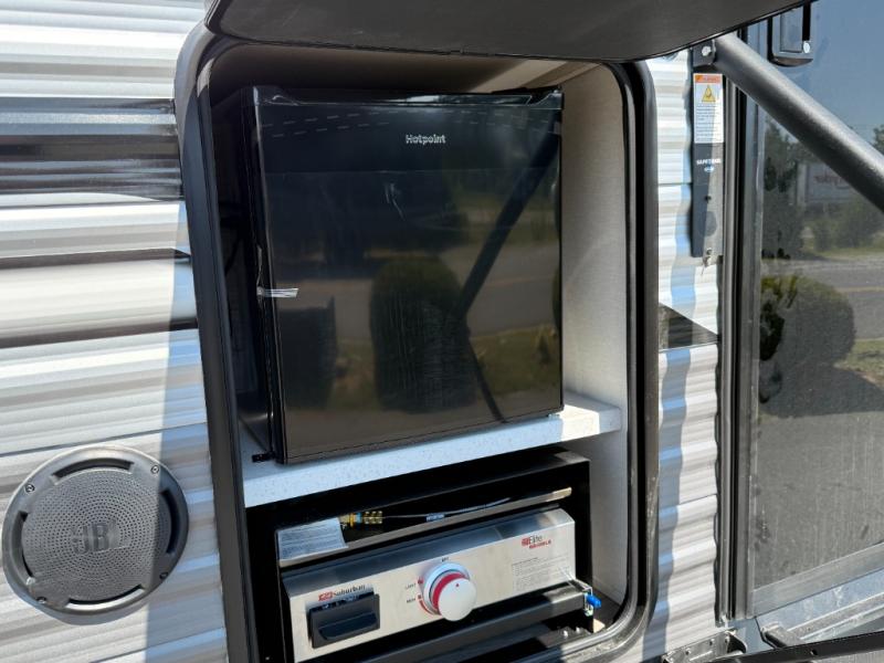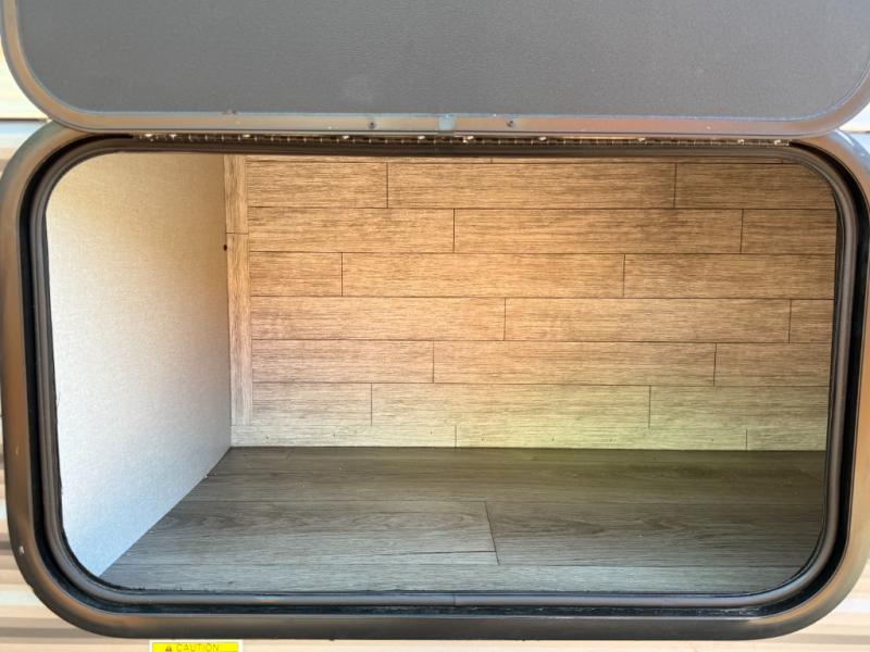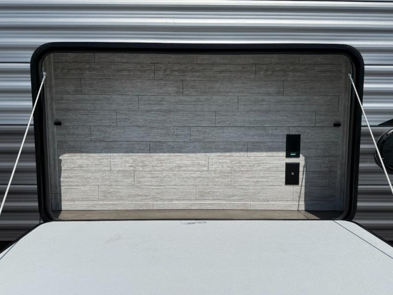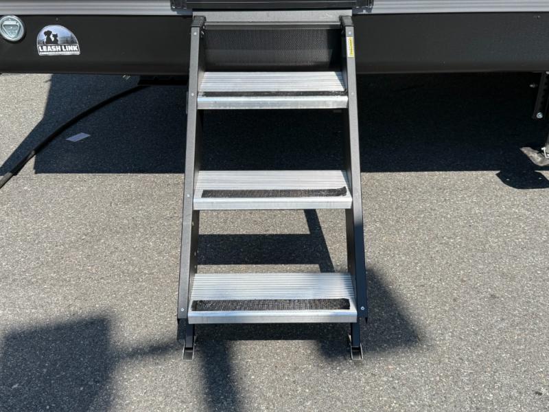 Electric awning with multicolor LED strip, electric tongue jack, black tank flush, LP tank quick-connect, flip-down cargo rack(optional)—built for convenience