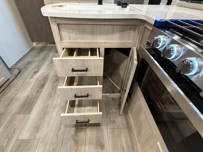 Exterior camp kitchen or kitchen + storage (floorplan dependent), rear-view camera prep, solar prep wiring, MORryde solid steps, and more