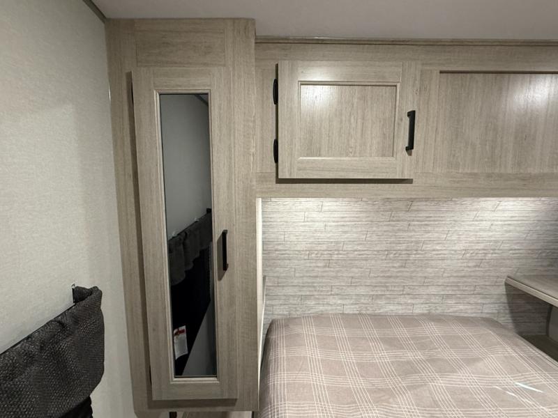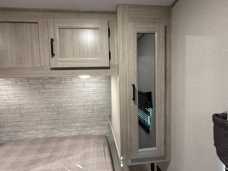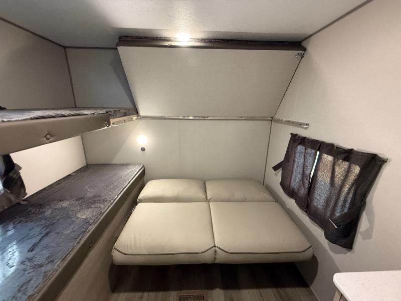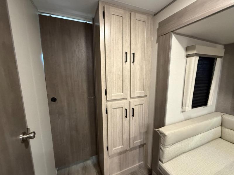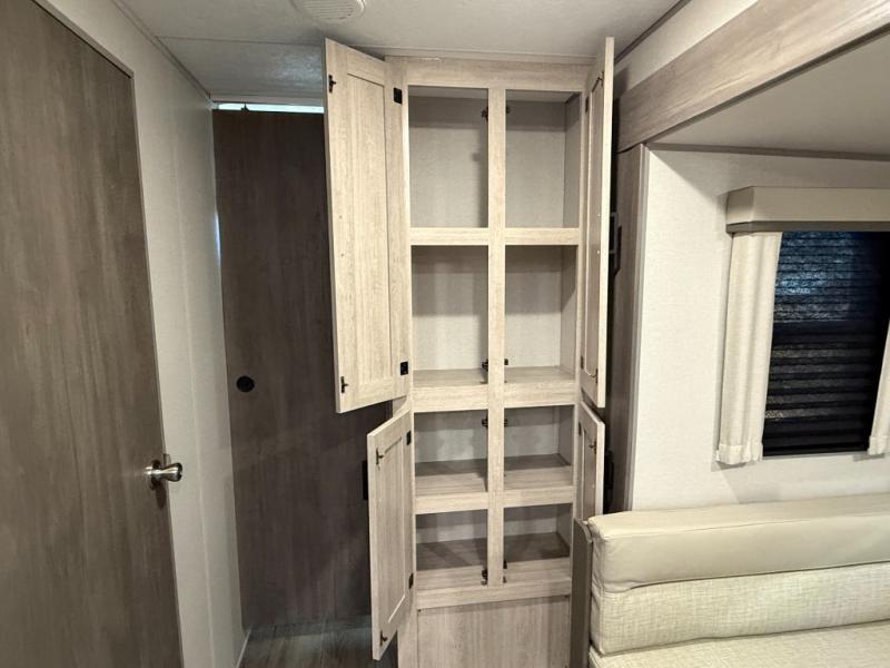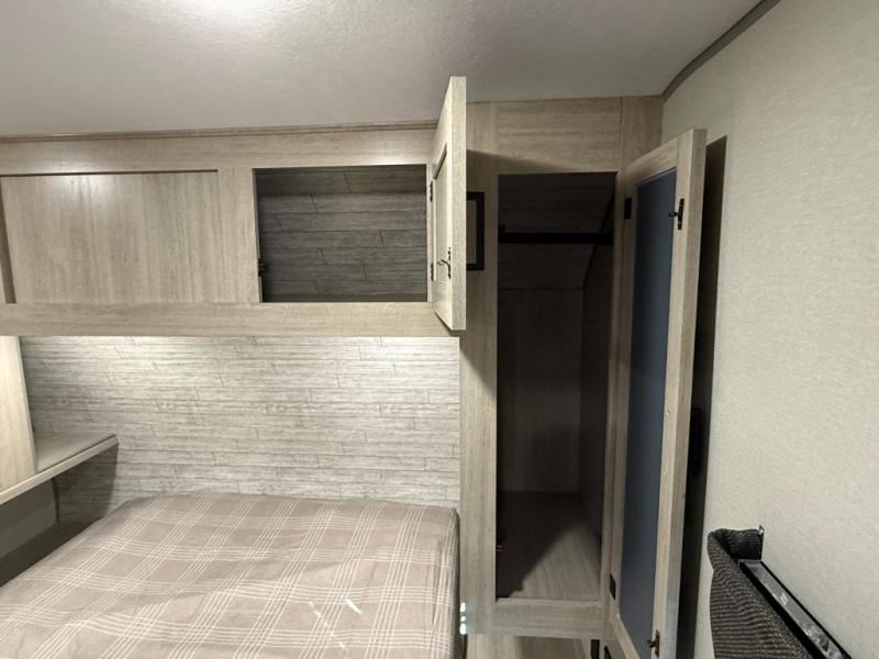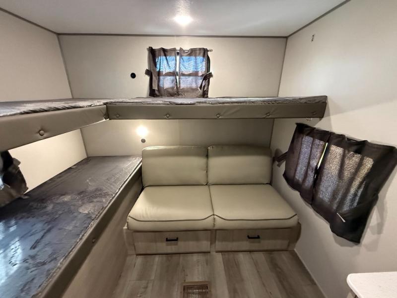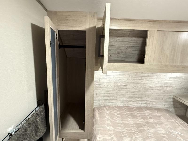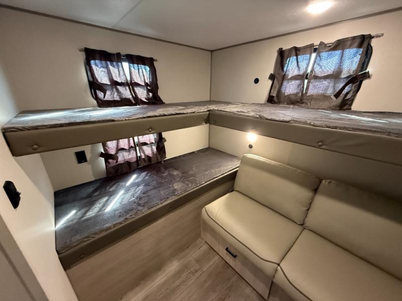 Private bunkhouse at the rear: accommodates multiple bunk beds + a jackknife sofa with storage, wardrobe and dresser, with a solid slider door for privacy.
