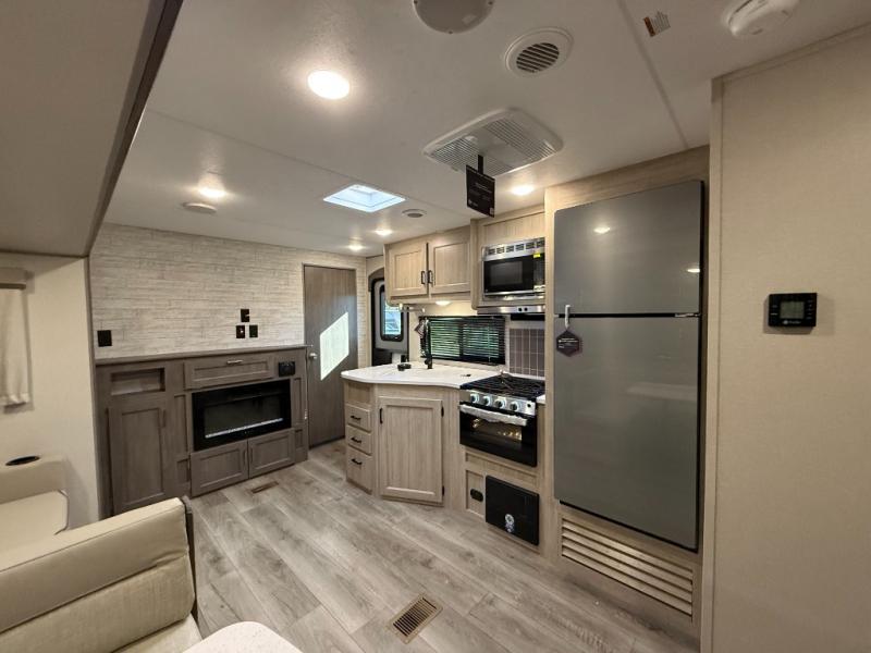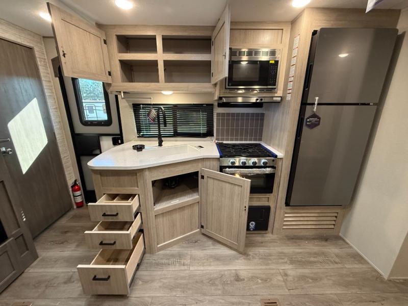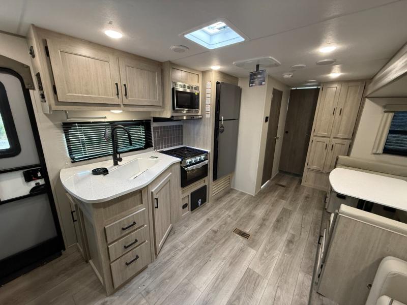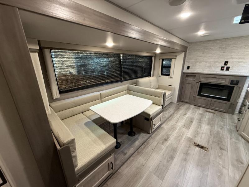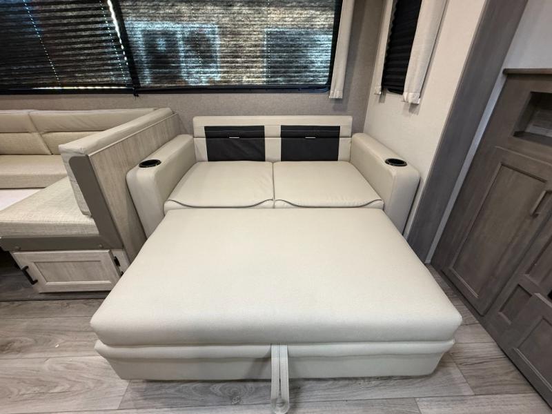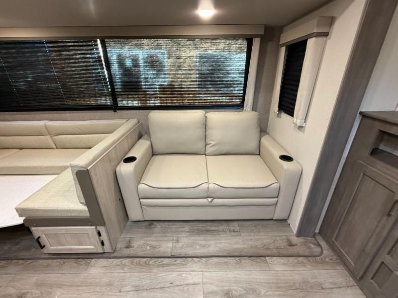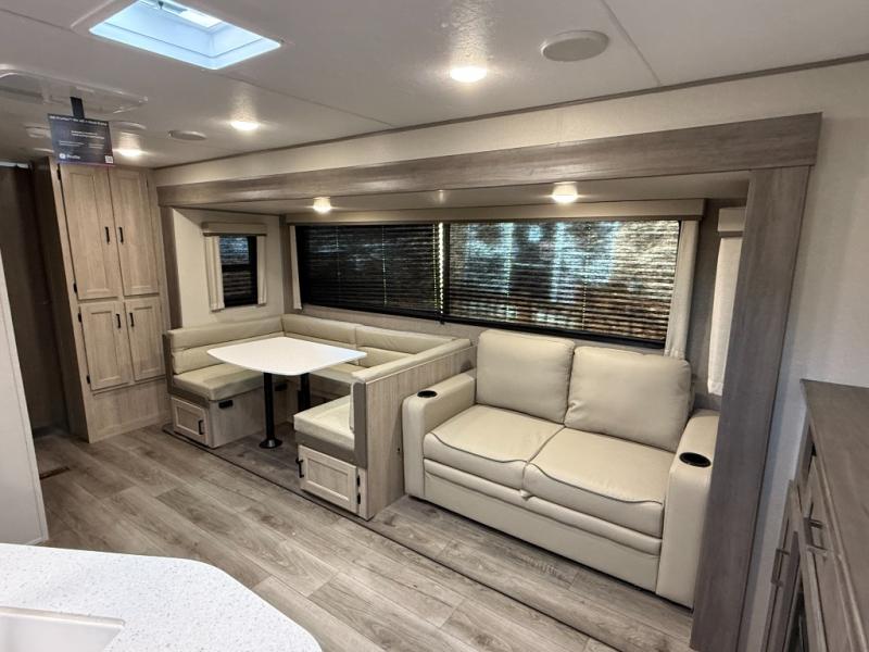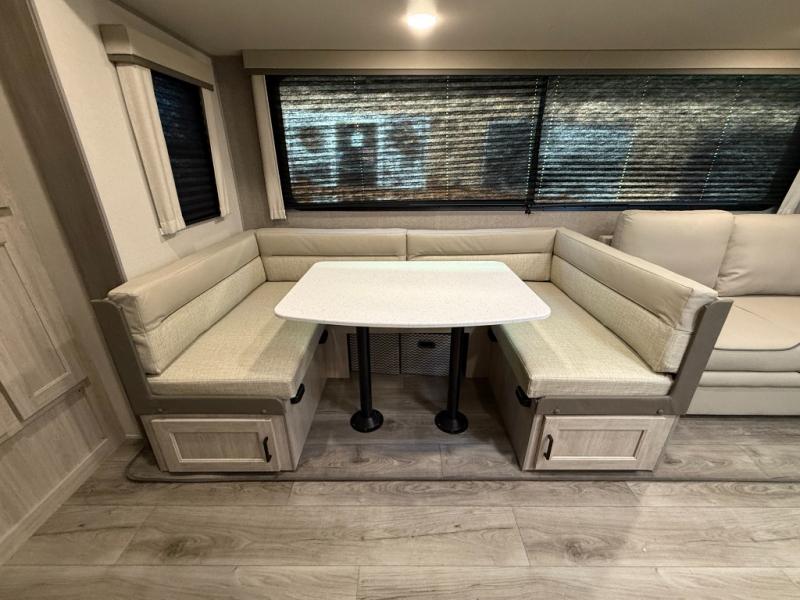 Main living/kitchen area: features a U-shaped dinette (slide-out) which offers abundant seating and can convert to sleeping space.