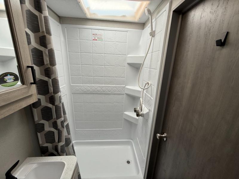 Bathroom: Porcelain toilet, ABS tub/shower surround with shelves, skylight above tub/shower.