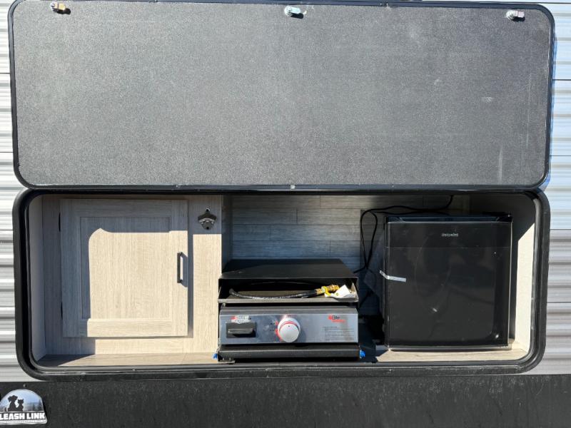 Outdoor camp kitchen: External kitchen module includes mini refrigerator, pull-out griddle cooktop, storage cabinet and sprayer hose.