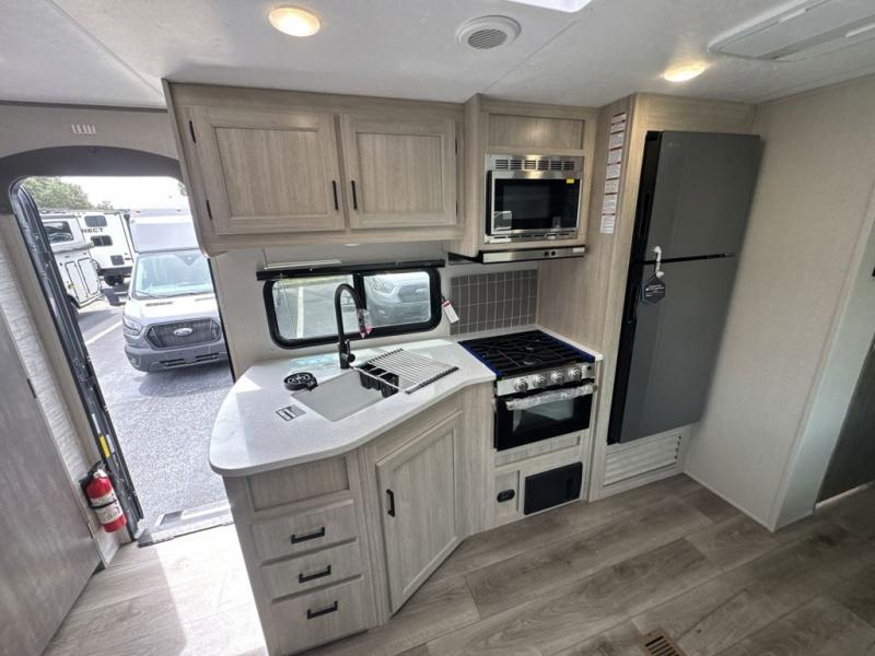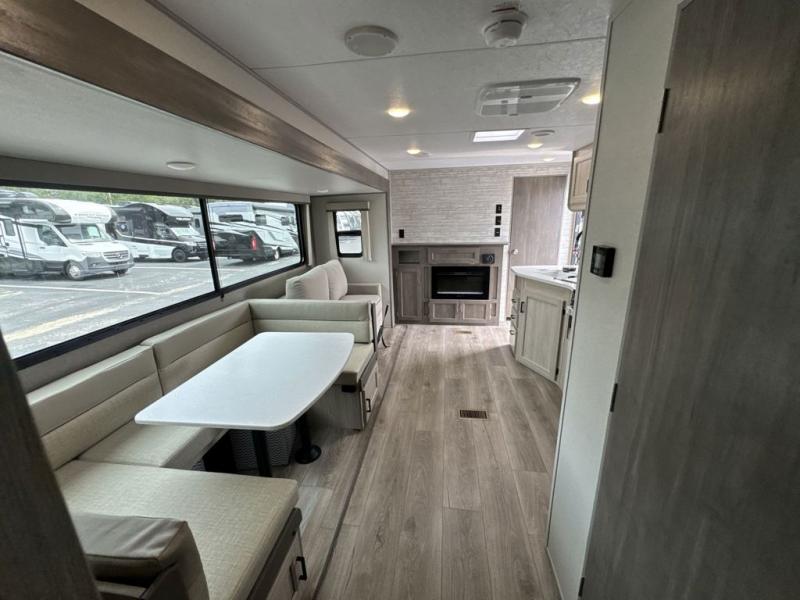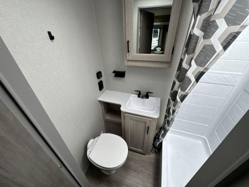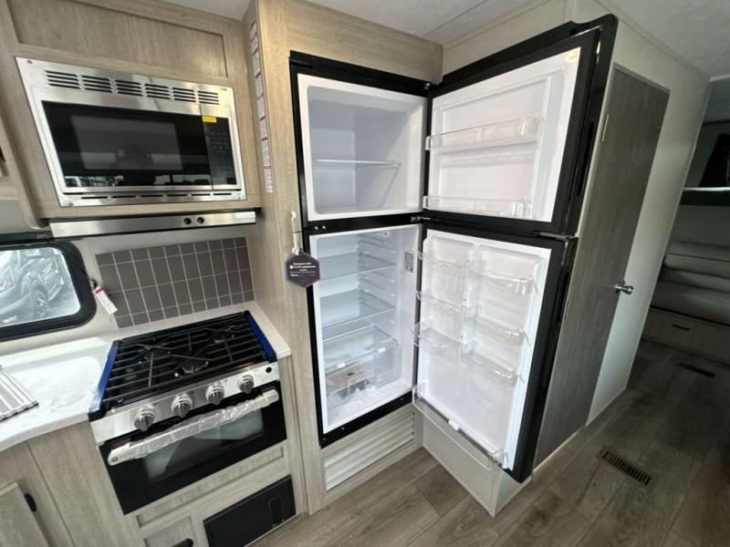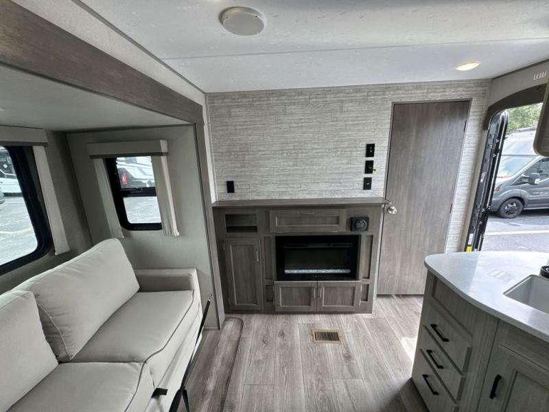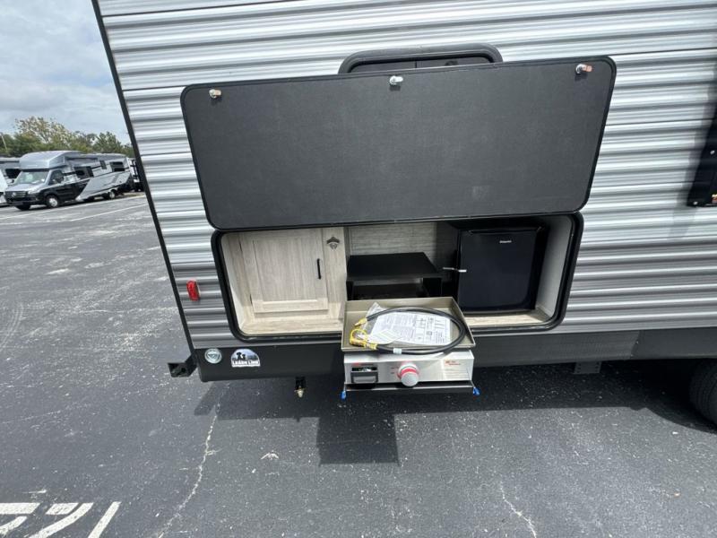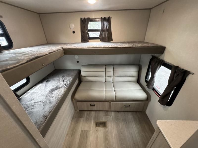 Not only will you be comfortable in this trailer, but your friends will also have comfort and privacy thanks to having their own bunkhouse, and you'll have a front bedroom where you can sleep like royalty! There are three bunk beds and a jack knife sofa with storage totes below plus a TV cabinet if you want to add a television here. The combined living and kitchen is spacious thanks to the slide out U-shaped dinette and sofa with drink holders. You can even add the fireplace option if you want that feature. The cook will have full amenities to whip up meals including overhead cabinets for dishes and snacks. And the exterior camper kitchen allows the cook to visit with everyone outside under the 18' electric awning that includes multicolor LED lights with a remote.
