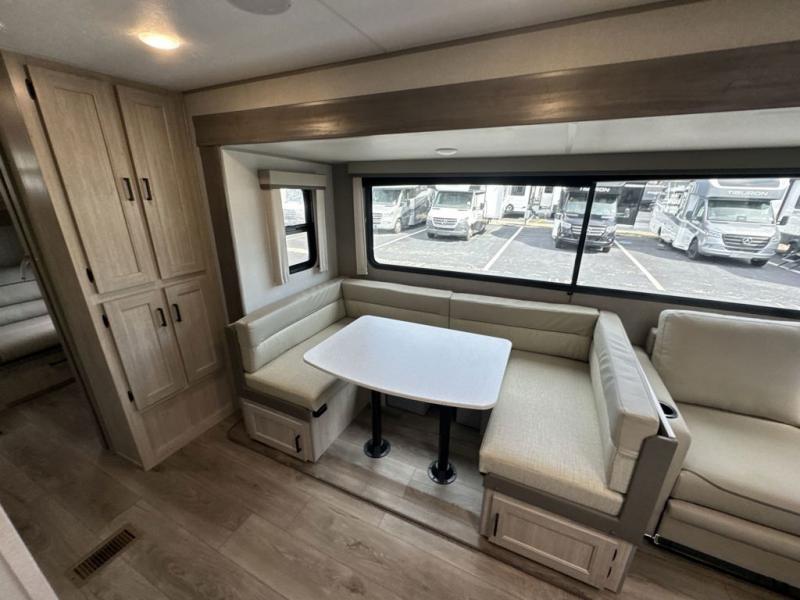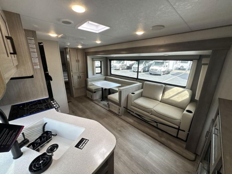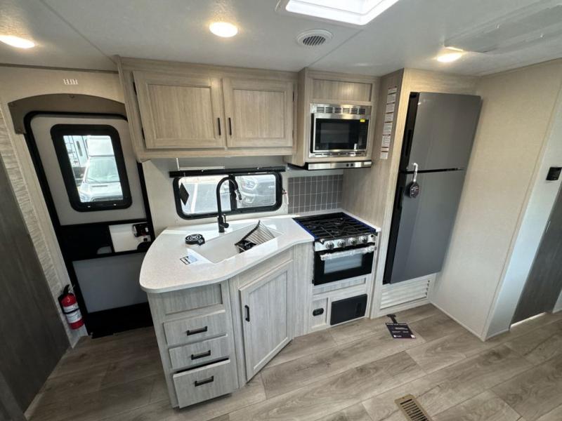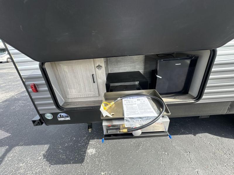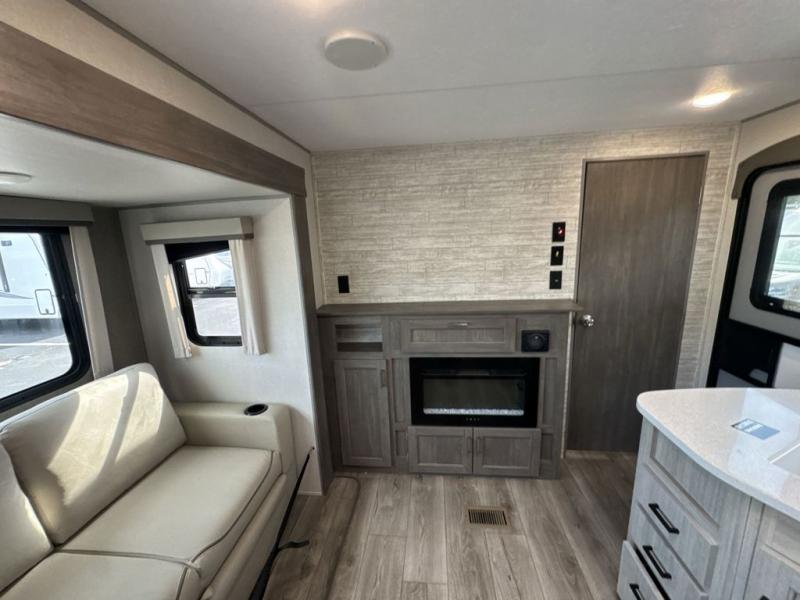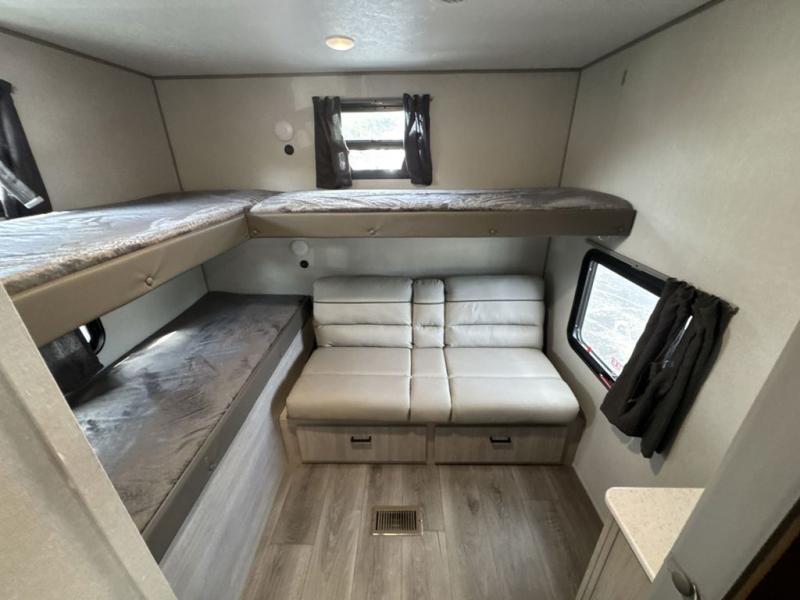 Not only will you be comfortable in this trailer, but your friends will also have comfort and privacy thanks to having their own bunkhouse, and you'll have a front bedroom where you can sleep like royalty! There are three bunk beds and a jack knife sofa with storage totes below plus a TV cabinet if you want to add a television here. The combined living and kitchen is spacious thanks to the slide out U-shaped dinette and sofa with drink holders. You can even add the fireplace option if you want that feature. The cook will have full amenities to whip up meals including overhead cabinets for dishes and snacks. And the exterior camper kitchen allows the cook to visit with everyone outside under the 18' electric awning that includes multicolor LED lights with a remote.