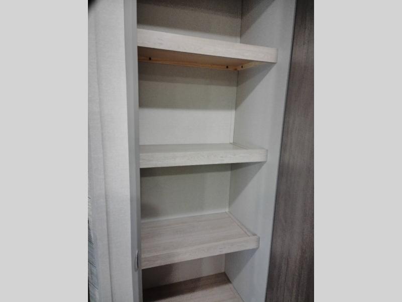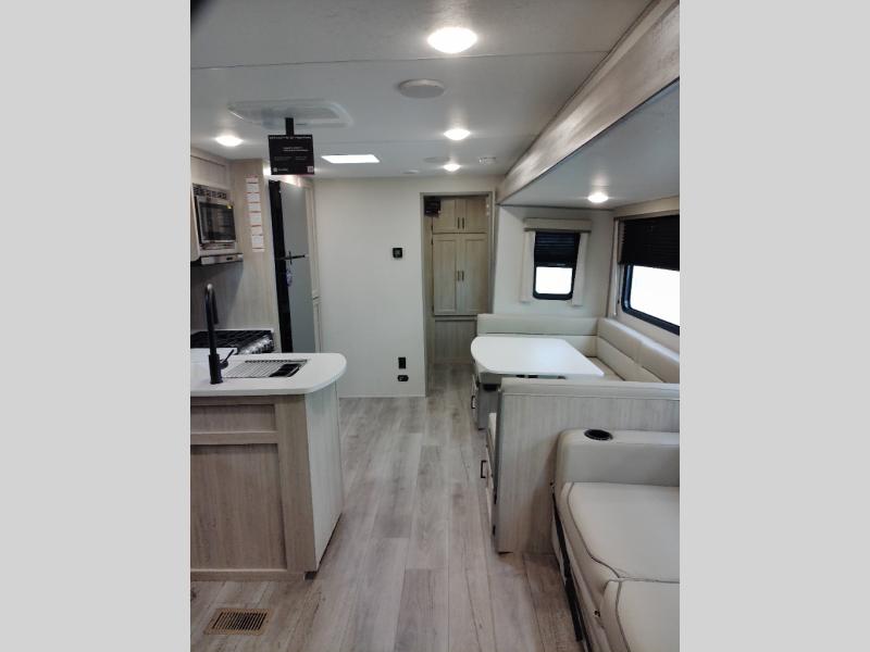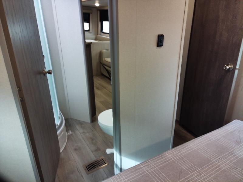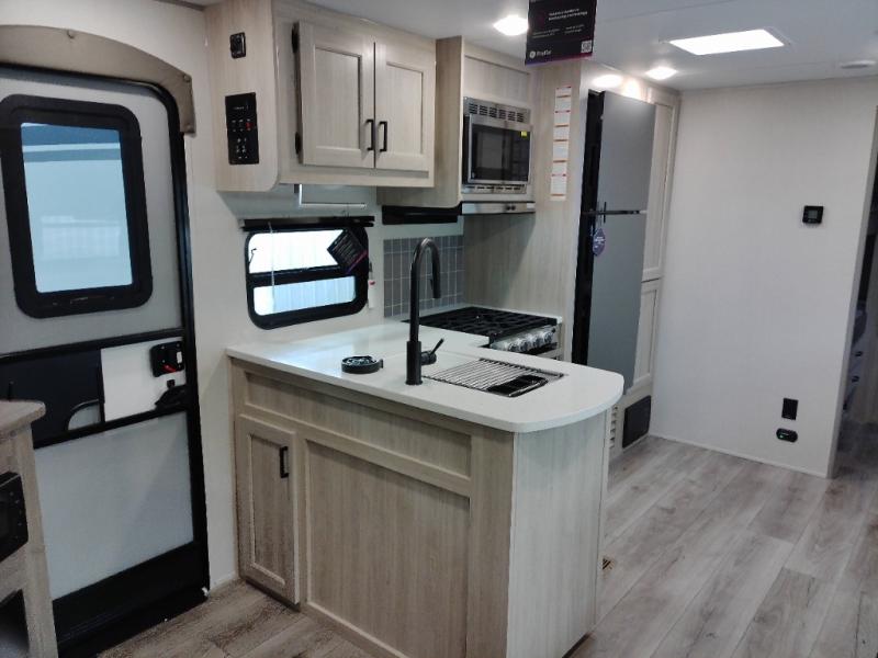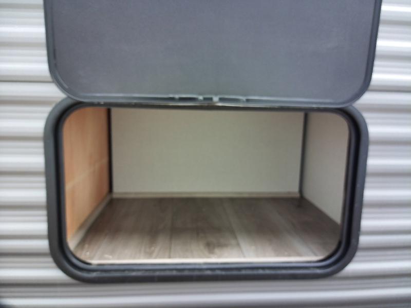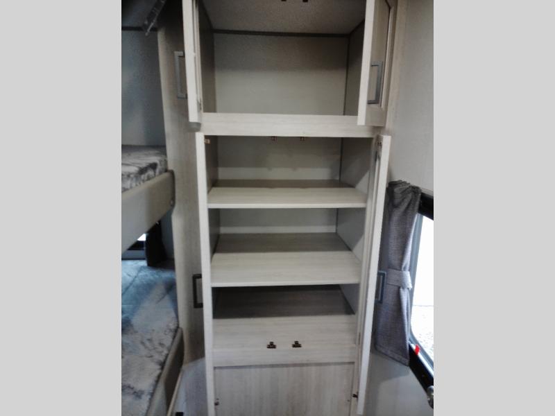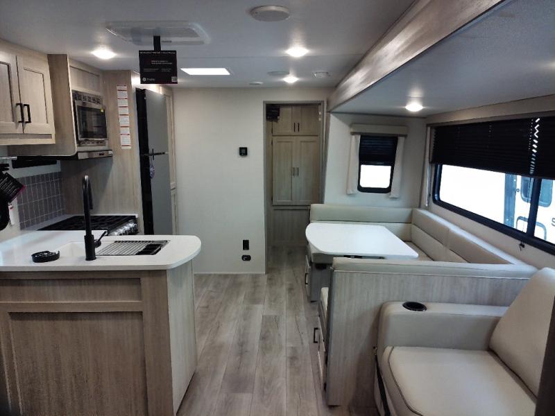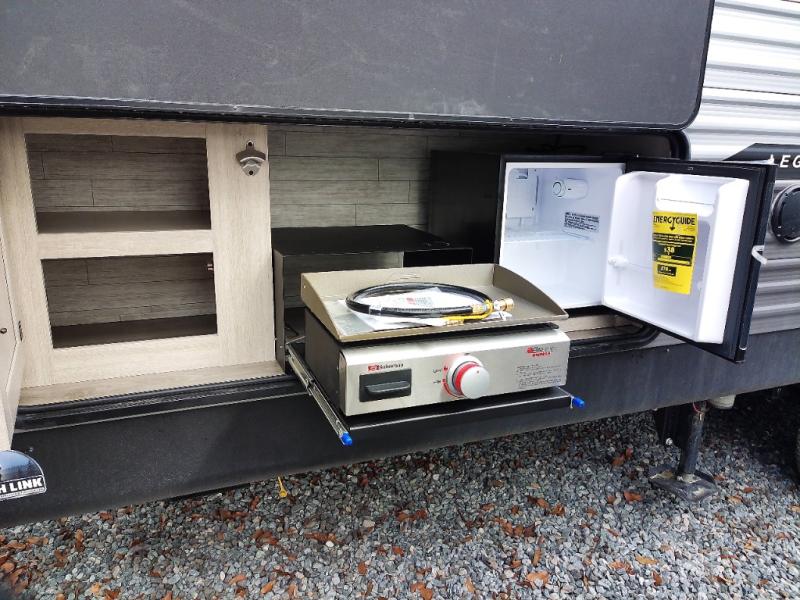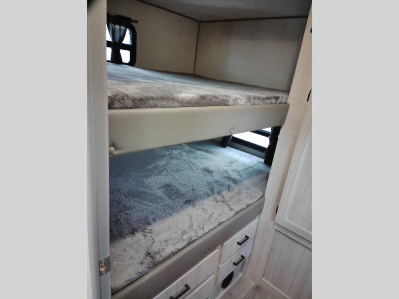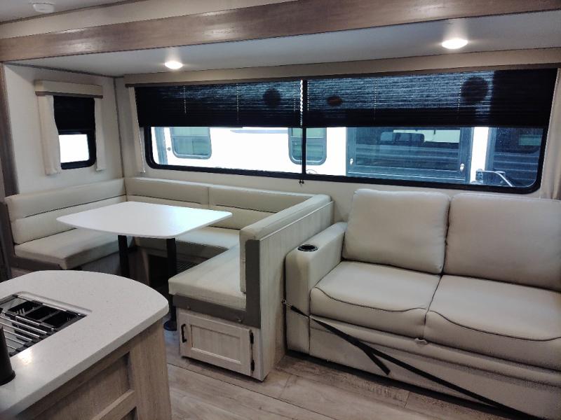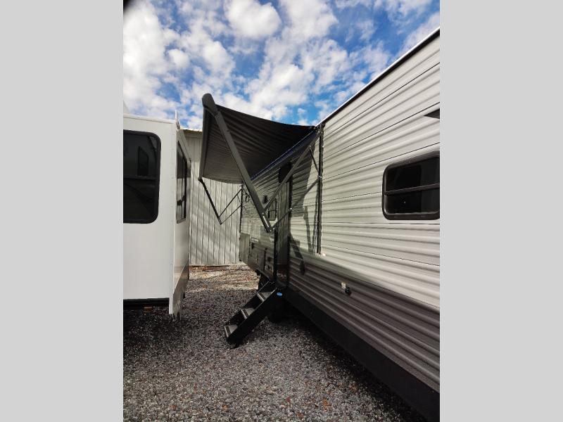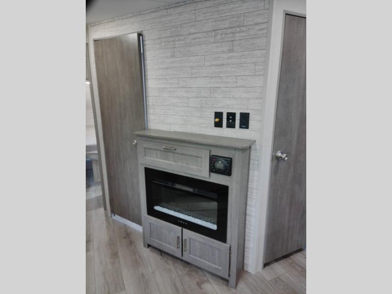 Not only will you be comfortable in this trailer, your friends will have comfort and privacy thanks to having their own bunkhouse with queen-size bunk beds, underbed storage, and a linen closet for clean clothes! The front master bedroom includes a walk-around queen bed, dual wardrobes, plus quick access to the dual entry bath! The combined living and kitchen is spacious thanks to the slide out U-shaped dinette and sofa with drink holders. You can even add the fireplace option if you want that feature. The cook will have full amenities to whip up meals including overhead cabinets for dishes and snacks, plus an outdoor camper kitchen with a pull-out griddle, a cabinet, and a refrigerator!