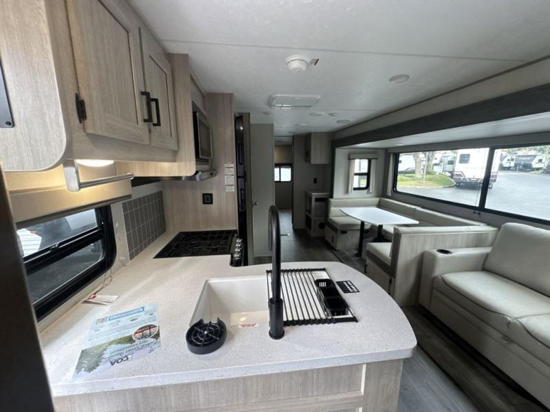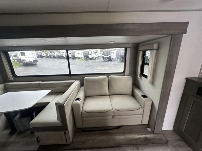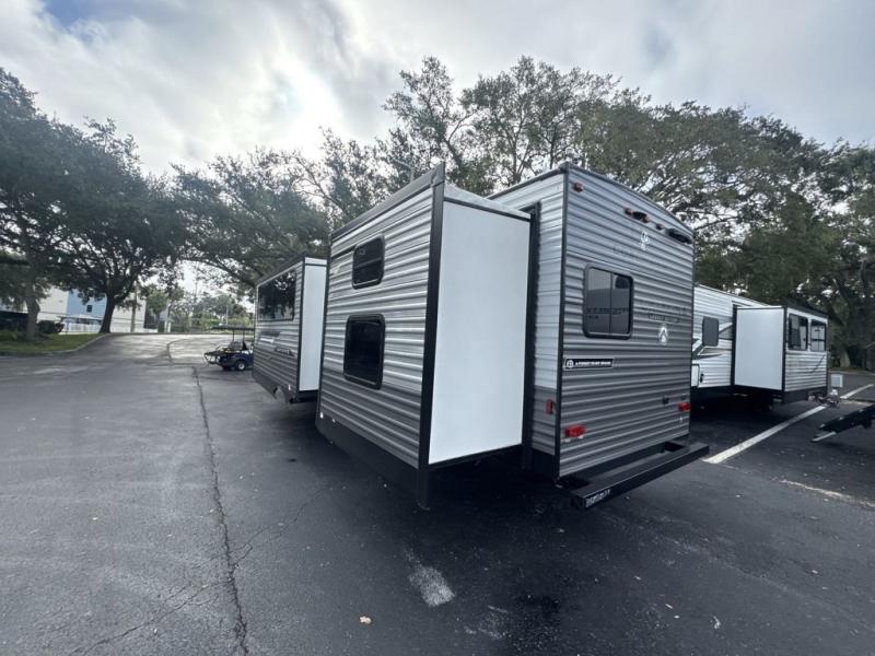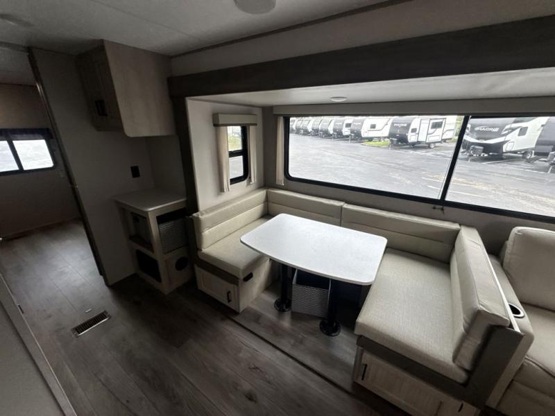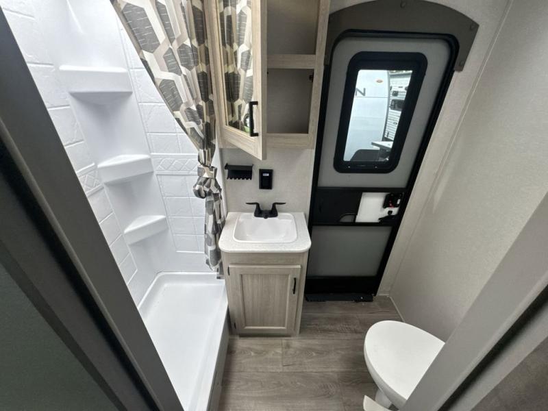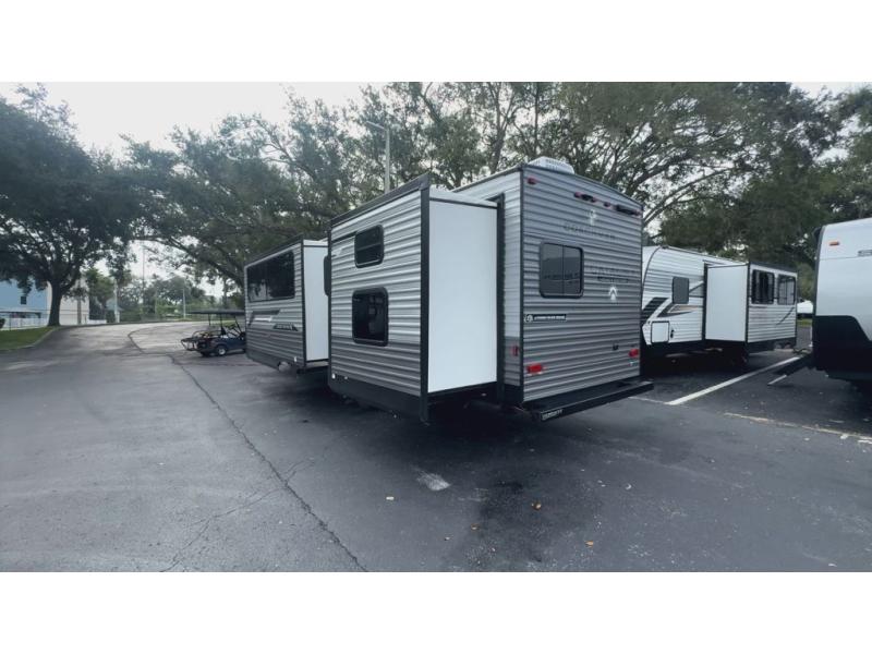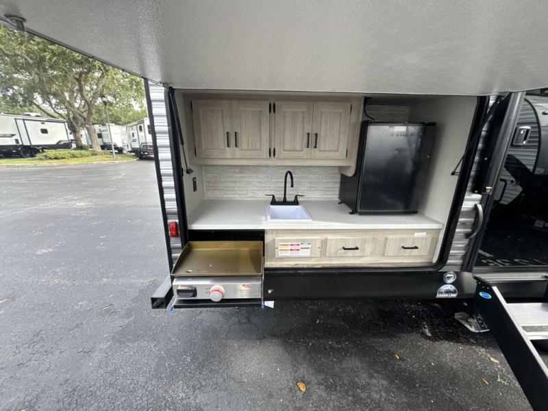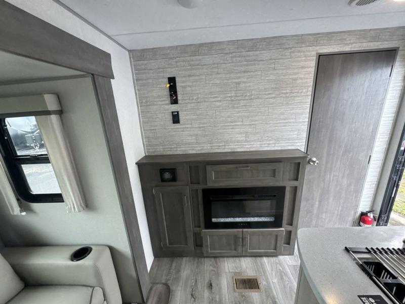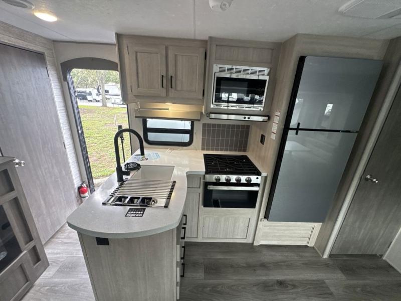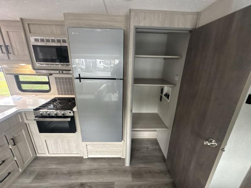 If you enjoy hiking, biking, and fishing, and waking up to beautiful scenery from your own comforts, then start camping with this trailer at the campsite! You will be able to sleep like a queen on the walk-around bed with dual wardrobes and overhead storage for more items in the front private bedroom while your family or friends have their own privacy in the bunkhouse complete with two bunks, a jack knife sofa with storage totes below and a TV/wardrobe cabinet for even more storage. The full bathroom includes the second entry/exit door for convenience when outside under the 21' electric awning with multicolor LED lights, or while cooking using the full-size camper kitchen along the exterior. There are full kitchen amenities inside including a 10.7 cu. ft. refrigerator and a pantry.