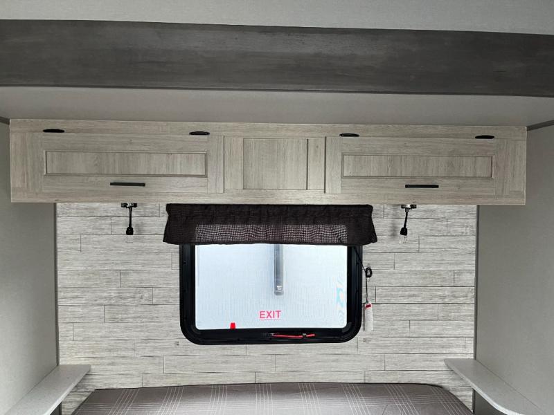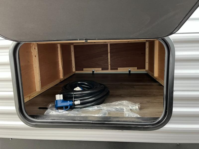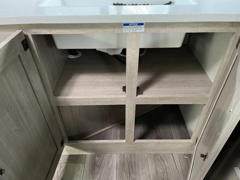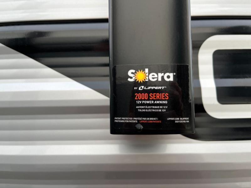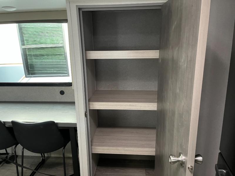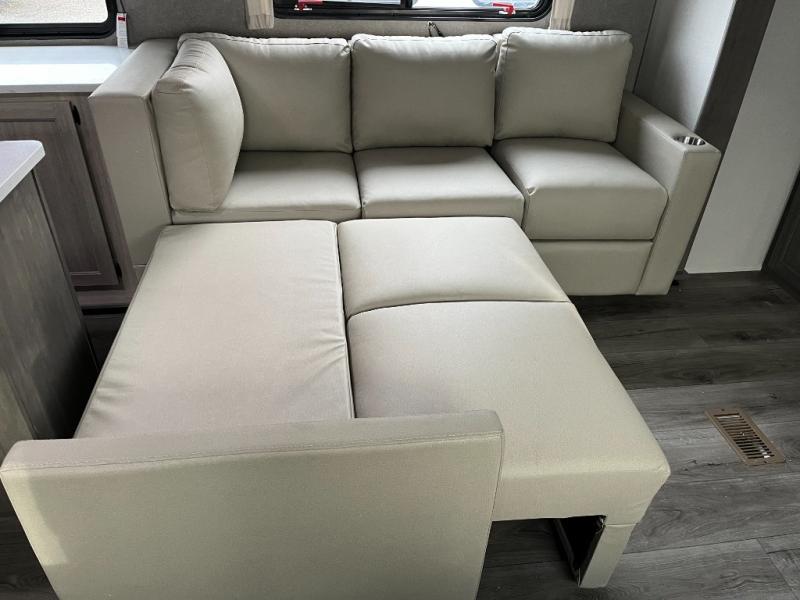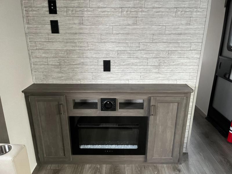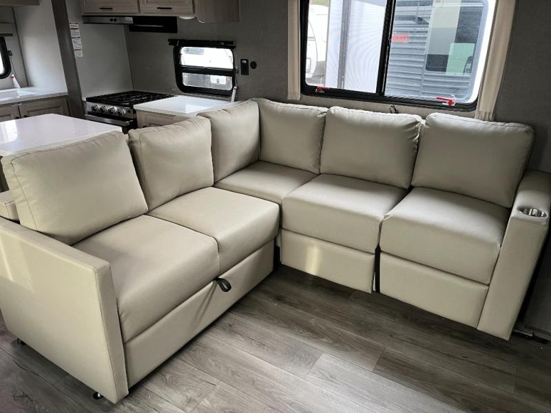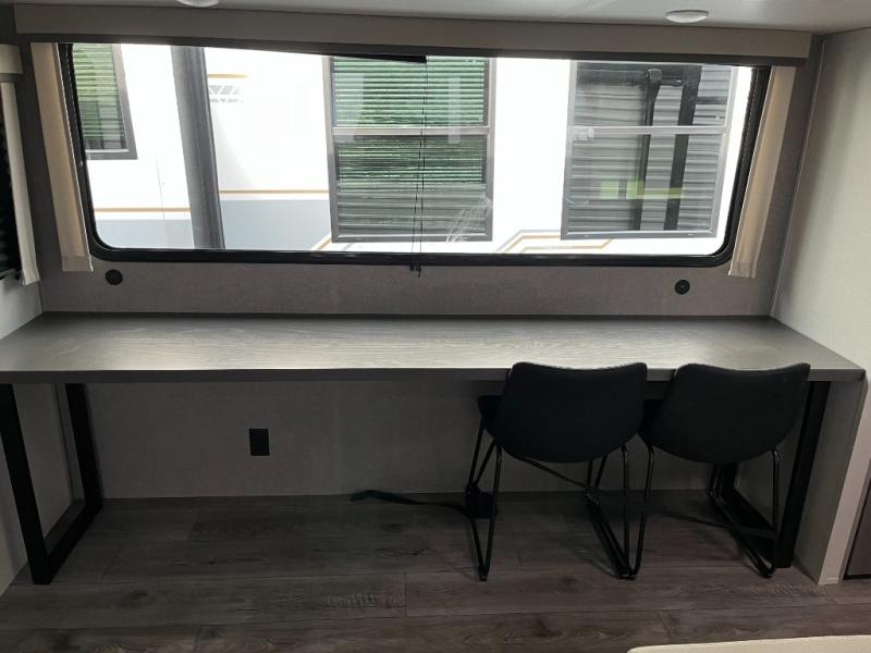This travel trailer rear kitchen will make you feel like home is on the road, featuring a spacious pantry, residential refrigerator, overhead cabinets, microwave, kitchen island, and sliding desk/table for all your cooking and dining needs. The dining counter and chairs provide the perfect place to enjoy meals with family and friends. The living room boasts a comfortable sectional sofa and TV/entertainment center for relaxing and having fun with your favorite person, whether you're watching your favorite movie, playing games, or simply enjoying quality time with loved ones, this space has everything you need. Moreover, the full bathroom is super complete with a wardrobe, linen closet, and all the amenities you need to freshen up and feel at home. Plus, you and your partner will love this front bedroom, since it is private, featuring a comfortable RV queen bed and a dresser ideal for keeping your clothes organized. There are also overhead cabinets, a closet, and washer/dryer prep for all your laundry needs, making this space the perfect place to rest and recharge after a long day of adventure. Outside, you'll appreciate the two awnings for shade and protection from the elements, as well as the exterior storage for all your gear and toys.