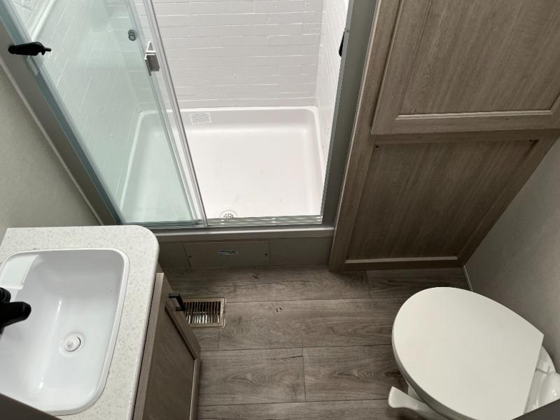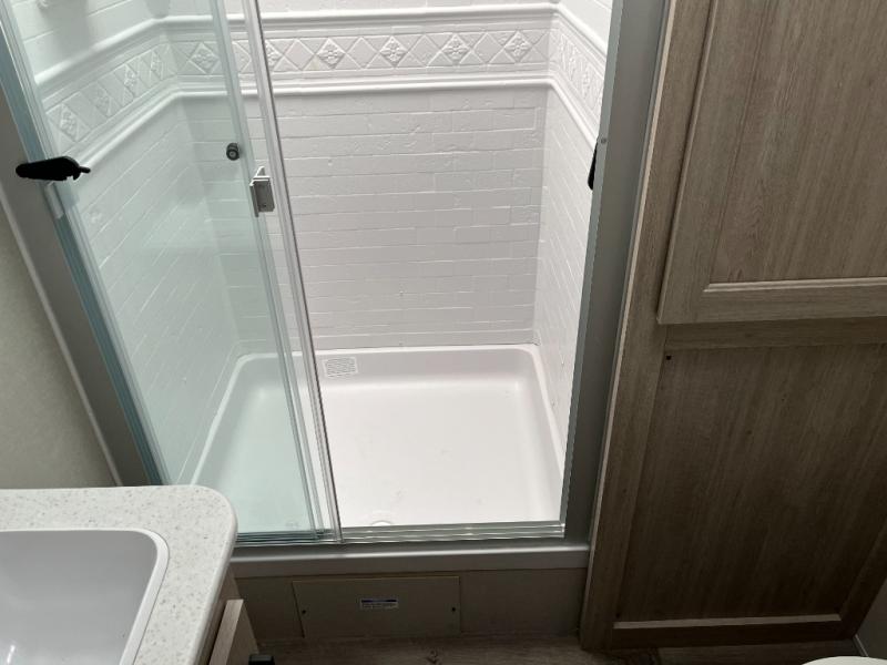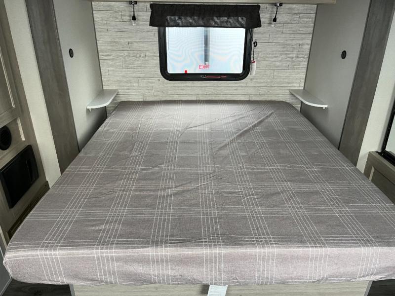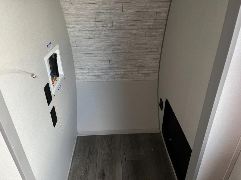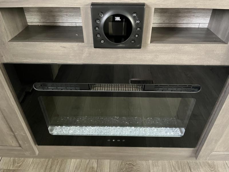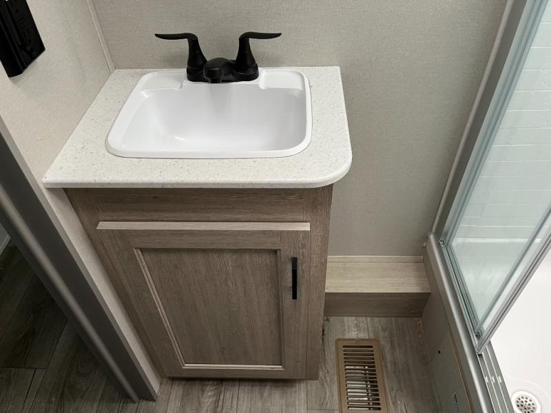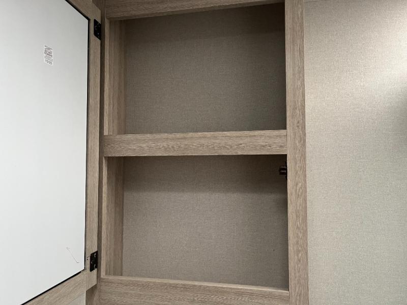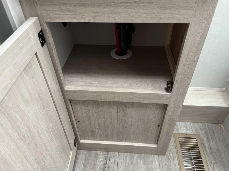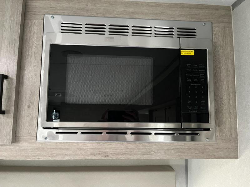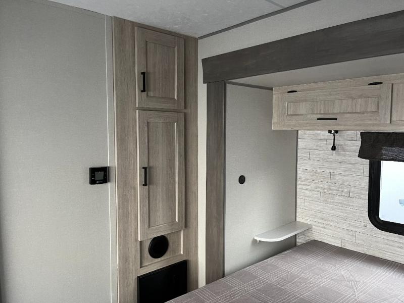 This travel trailer rear kitchen will make you feel like home is on the road, featuring a spacious pantry, residential refrigerator, overhead cabinets, microwave, kitchen island, and sliding desk/table for all your cooking and dining needs. The dining counter and chairs provide the perfect place to enjoy meals with family and friends. The living room boasts a comfortable sectional sofa and TV/entertainment center for relaxing and having fun with your favorite person, whether you're watching your favorite movie, playing games, or simply enjoying quality time with loved ones, this space has everything you need. Moreover, the full bathroom is super complete with a wardrobe, linen closet, and all the amenities you need to freshen up and feel at home. Plus, you and your partner will love this front bedroom, since it is private, featuring a comfortable RV queen bed and a dresser ideal for keeping your clothes organized. There are also overhead cabinets, a closet, and washer/dryer prep for all your laundry needs, making this space the perfect place to rest and recharge after a long day of adventure. Outside, you'll appreciate the two awnings for shade and protection from the elements, as well as the exterior storage for all your gear and toys.