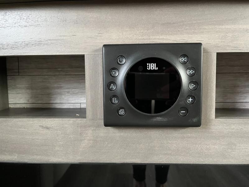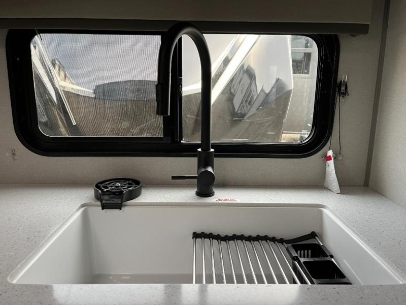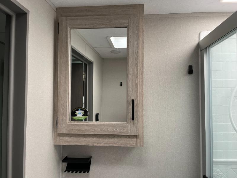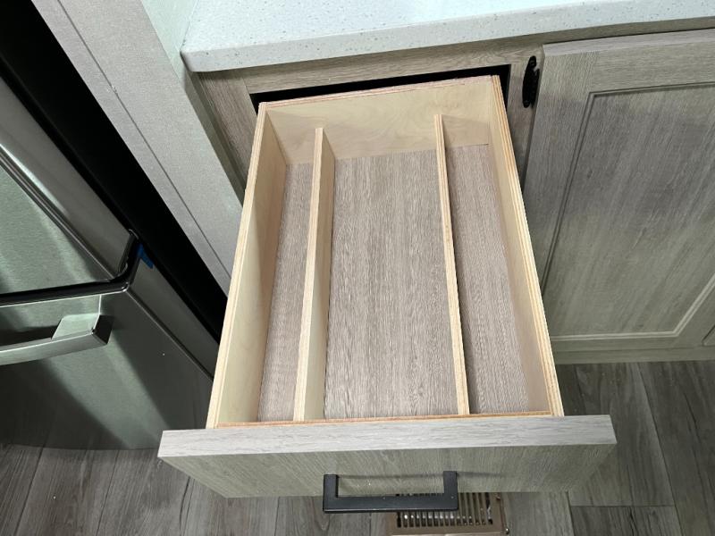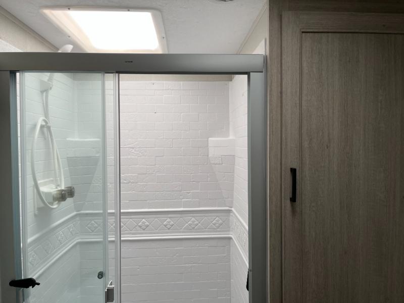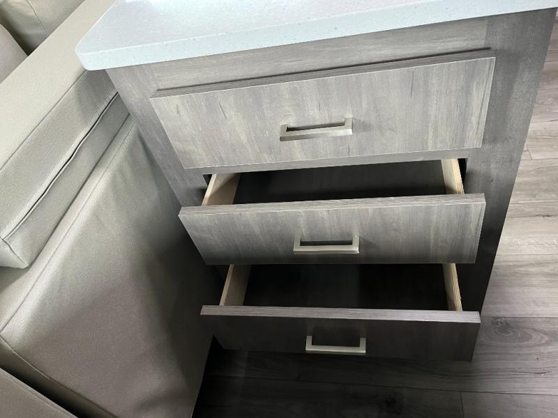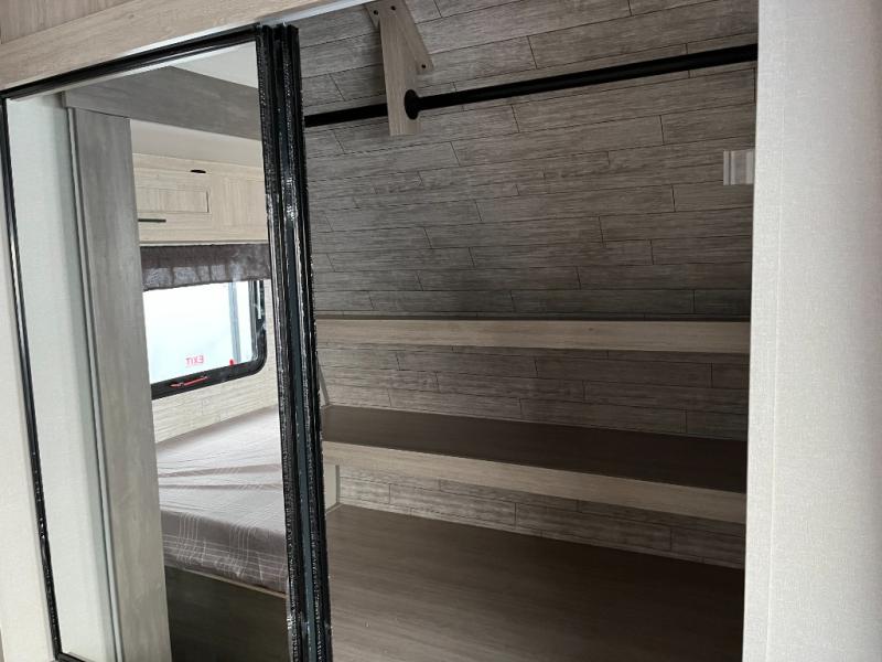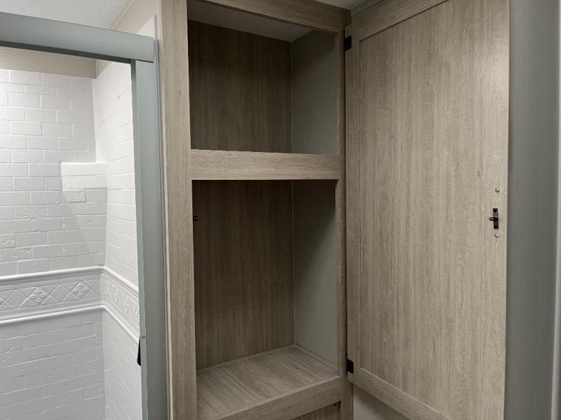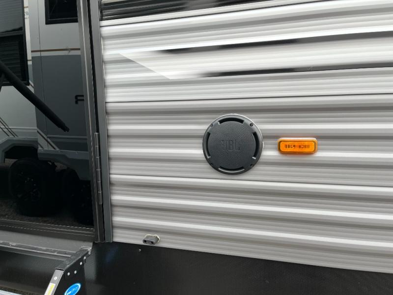 This travel trailer rear kitchen will make you feel like home is on the road, featuring a spacious pantry, residential refrigerator, overhead cabinets, microwave, kitchen island, and sliding desk/table for all your cooking and dining needs. The dining counter and chairs provide the perfect place to enjoy meals with family and friends. The living room boasts a comfortable sectional sofa and TV/entertainment center for relaxing and having fun with your favorite person, whether you're watching your favorite movie, playing games, or simply enjoying quality time with loved ones, this space has everything you need. Moreover, the full bathroom is super complete with a wardrobe, linen closet, and all the amenities you need to freshen up and feel at home. Plus, you and your partner will love this front bedroom, since it is private, featuring a comfortable RV queen bed and a dresser ideal for keeping your clothes organized. There are also overhead cabinets, a closet, and washer/dryer prep for all your laundry needs, making this space the perfect place to rest and recharge after a long day of adventure. Outside, you'll appreciate the two awnings for shade and protection from the elements, as well as the exterior storage for all your gear and toys.