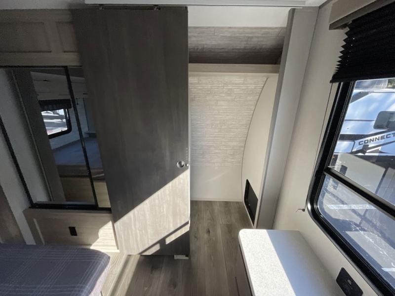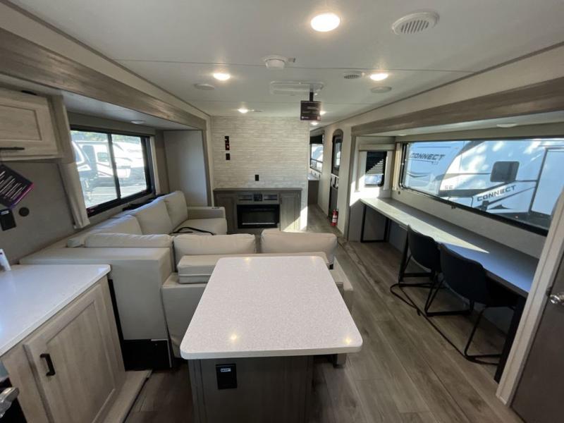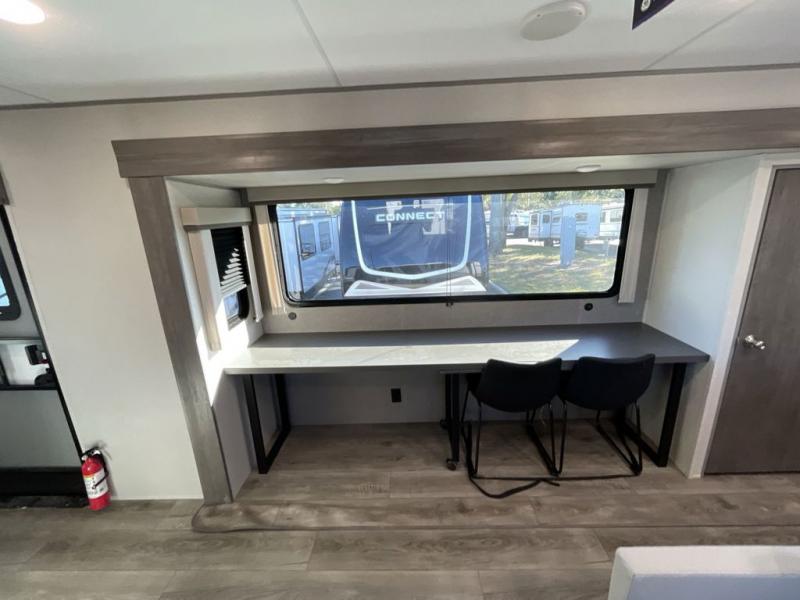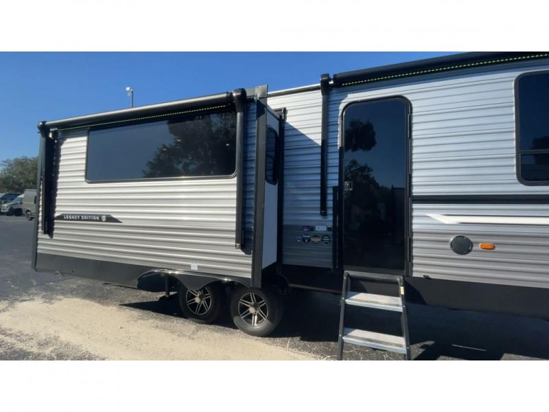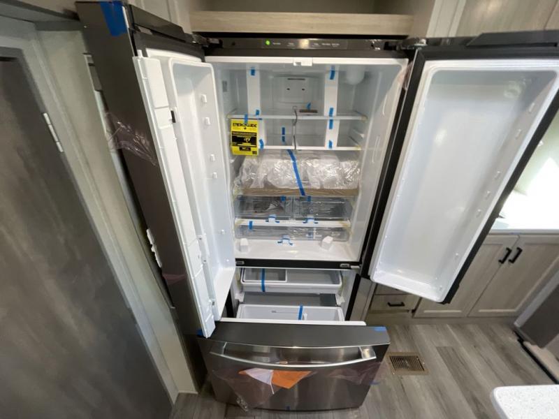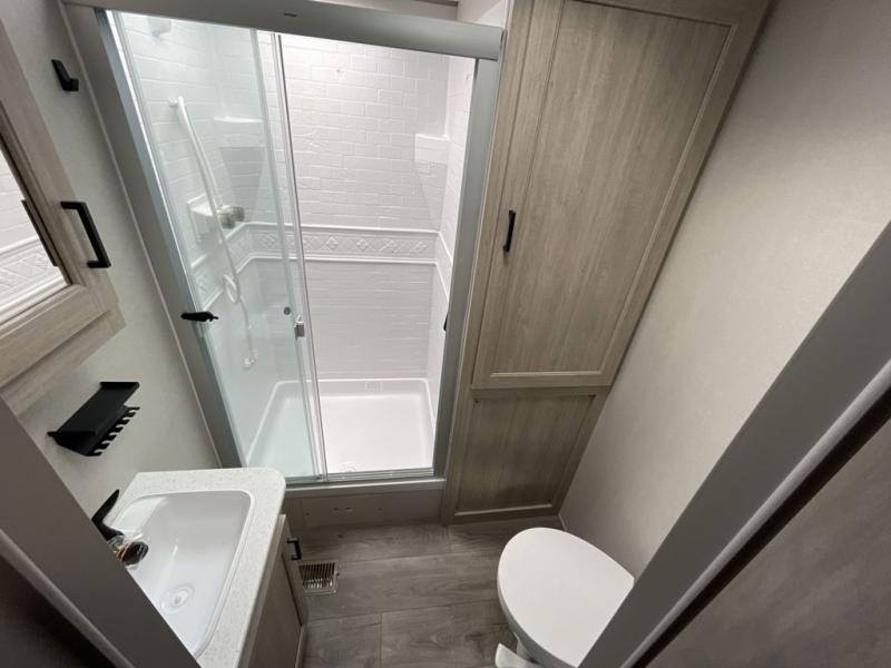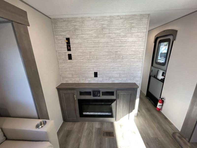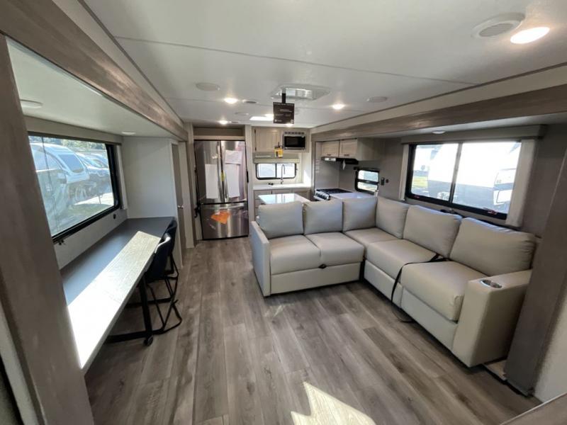 This travel trailer rear kitchen will make you feel like home is on the road, featuring a spacious pantry, residential refrigerator, overhead cabinets, microwave, kitchen island, and sliding desk/table for all your cooking and dining needs. The dining counter and chairs provide the perfect place to enjoy meals with family and friends. The living room boasts a comfortable sectional sofa and TV/entertainment center for relaxing and having fun with your favorite person, whether you're watching your favorite movie, playing games, or simply enjoying quality time with loved ones, this space has everything you need. Moreover, the full bathroom is super complete with a wardrobe, linen closet, and all the amenities you need to freshen up and feel at home. Plus, you and your partner will love this front bedroom, since it is private, featuring a comfortable RV queen bed and a dresser ideal for keeping your clothes organized. There are also overhead cabinets, a closet, and washer/dryer prep for all your laundry needs, making this space the perfect place to rest and recharge after a long day of adventure. Outside, you'll appreciate the two awnings for shade and protection from the elements, as well as the exterior storage for all your gear and toys.