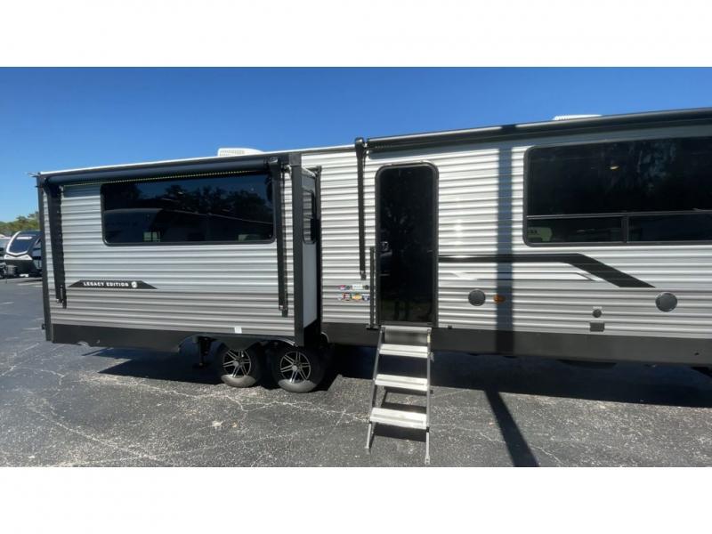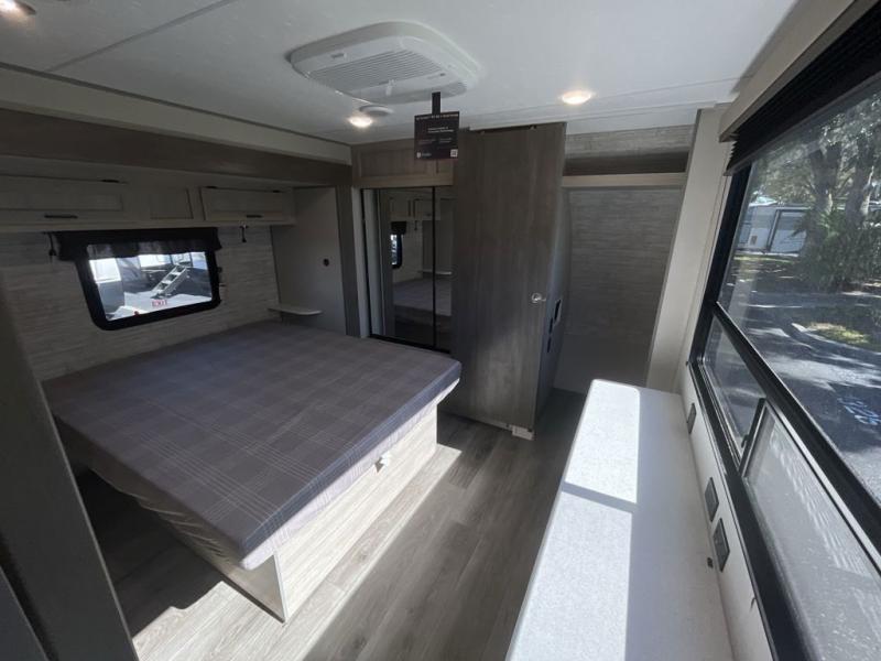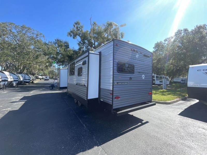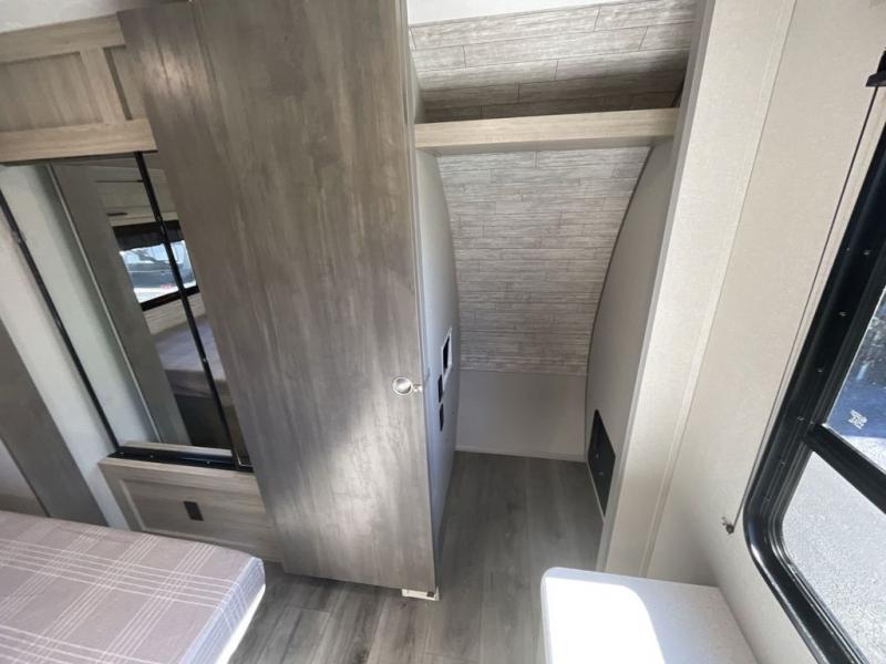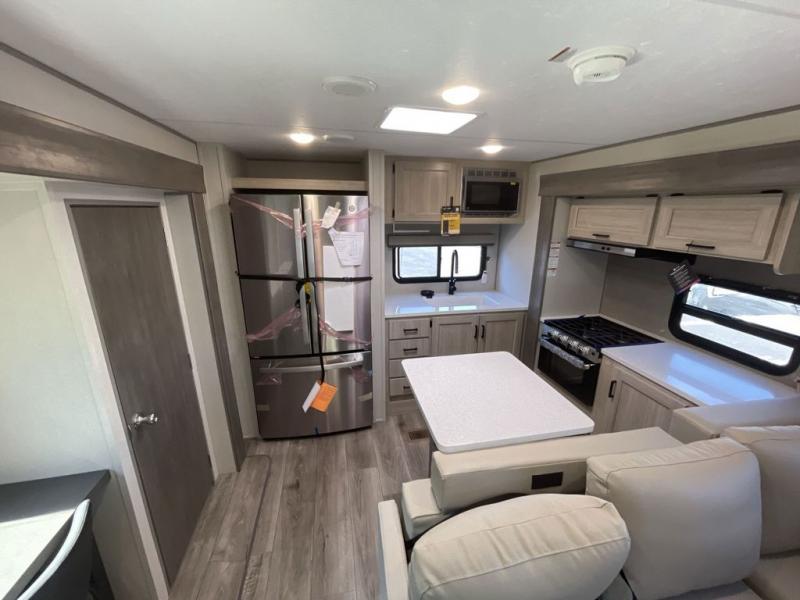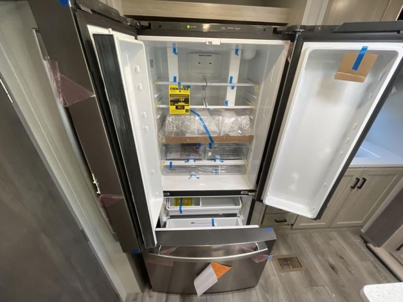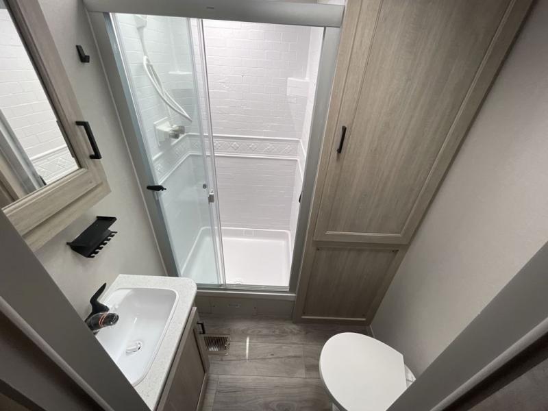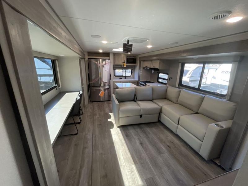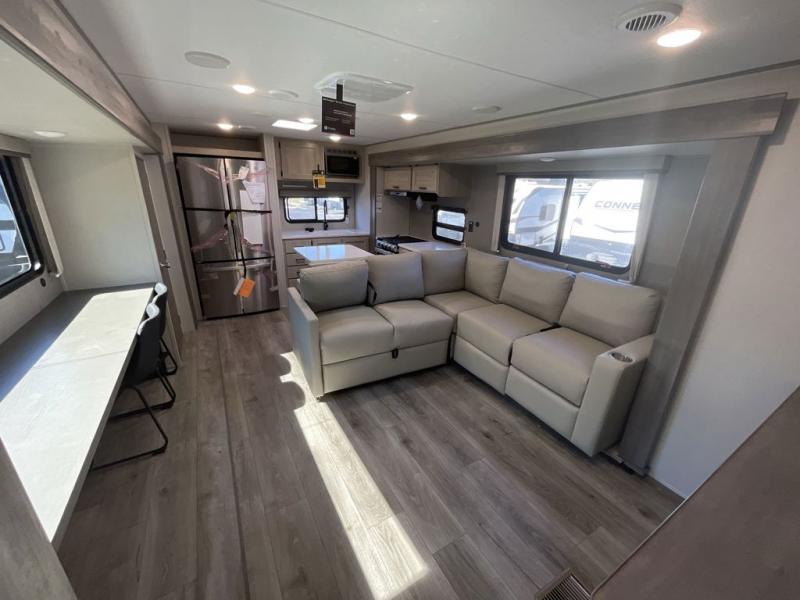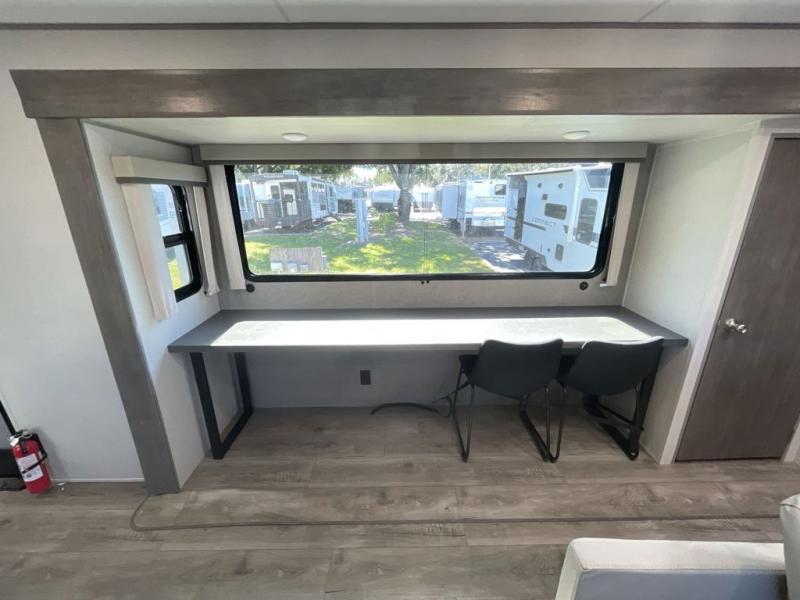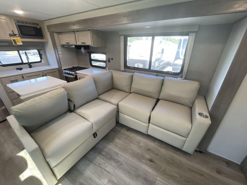 This travel trailer rear kitchen will make you feel like home is on the road, featuring a spacious pantry, residential refrigerator, overhead cabinets, microwave, kitchen island, and sliding desk/table for all your cooking and dining needs. The dining counter and chairs provide the perfect place to enjoy meals with family and friends. The living room boasts a comfortable sectional sofa and TV/entertainment center for relaxing and having fun with your favorite person, whether you're watching your favorite movie, playing games, or simply enjoying quality time with loved ones, this space has everything you need. Moreover, the full bathroom is super complete with a wardrobe, linen closet, and all the amenities you need to freshen up and feel at home. Plus, you and your partner will love this front bedroom, since it is private, featuring a comfortable RV queen bed and a dresser ideal for keeping your clothes organized. There are also overhead cabinets, a closet, and washer/dryer prep for all your laundry needs, making this space the perfect place to rest and recharge after a long day of adventure. Outside, you'll appreciate the two awnings for shade and protection from the elements, as well as the exterior storage for all your gear and toys.