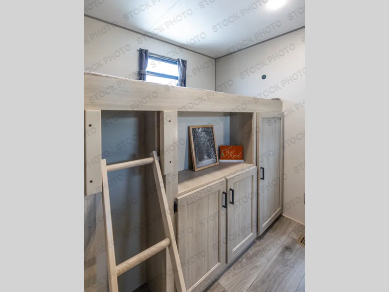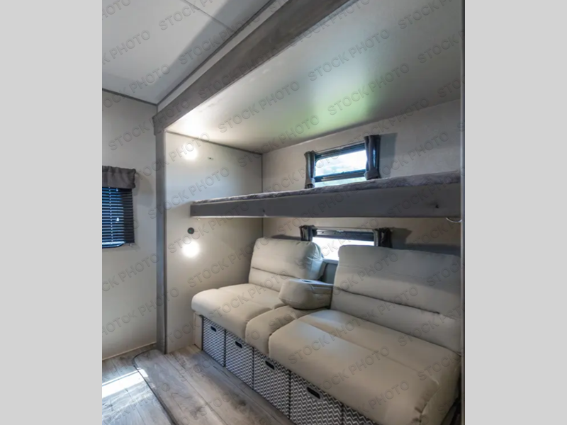 This family-friendly trailer offers lots of floor space thanks to the triple slides throughout! You and your family will love the combined living and kitchen area with a slide out booth dinette and a sofa with drink holders. The L-shaped kitchen counter allows the cook to make meals without moving for anyone trying to get to the full bathroom or the rear bunkhouse. The kids will have their own privacy, two bunk beds, a jack knife sofa with storage totes below plus a TV/wardrobe cabinet. The front private bedroom allows you to sleep like royalty and offers a large closet for your clothing and another closet prepped for a washer/dryer. And don't forget about the full-size camper kitchen and the 21' power awning with multicolor LED lights when you are outside.