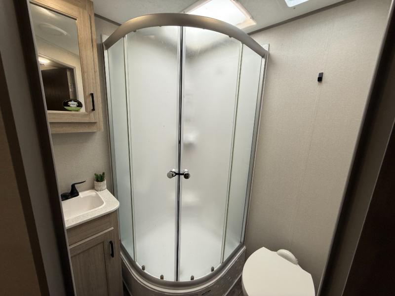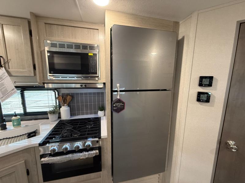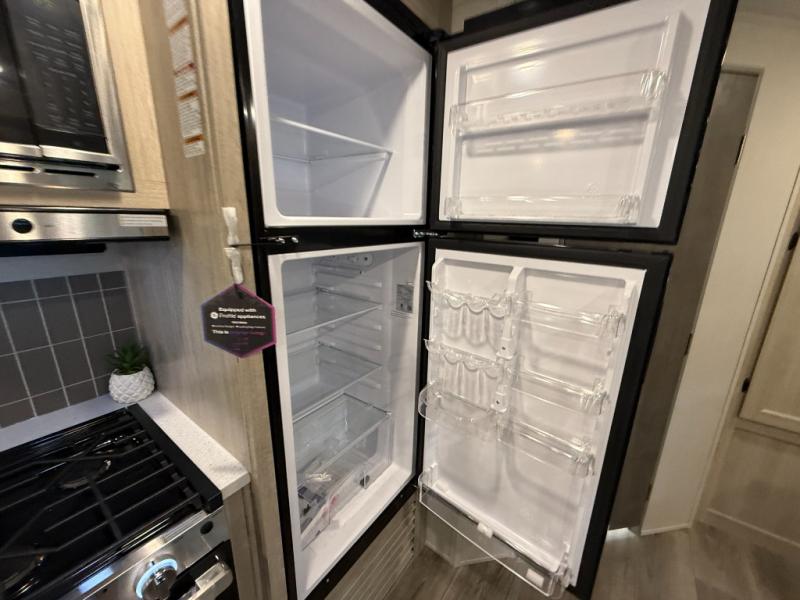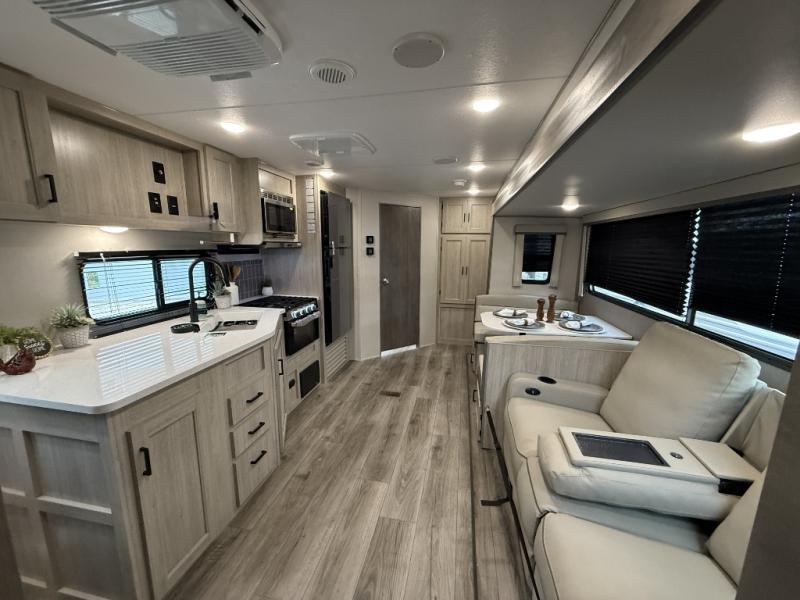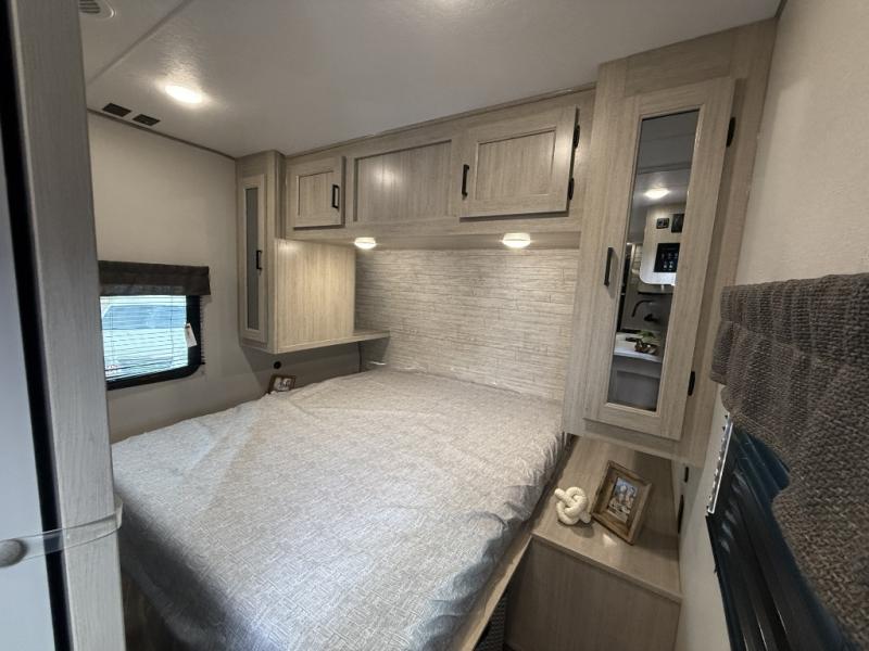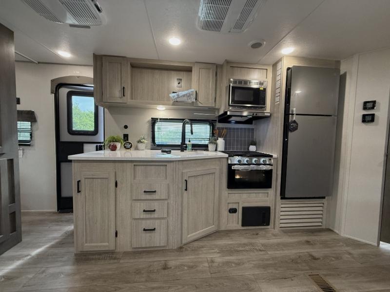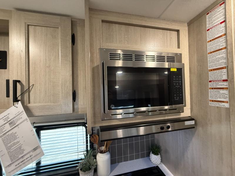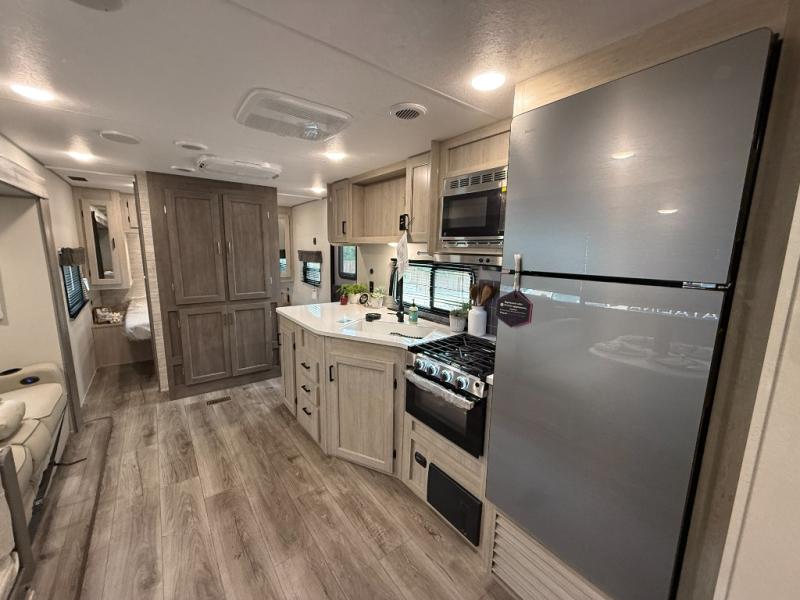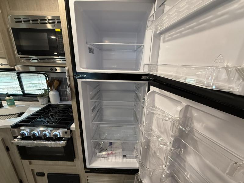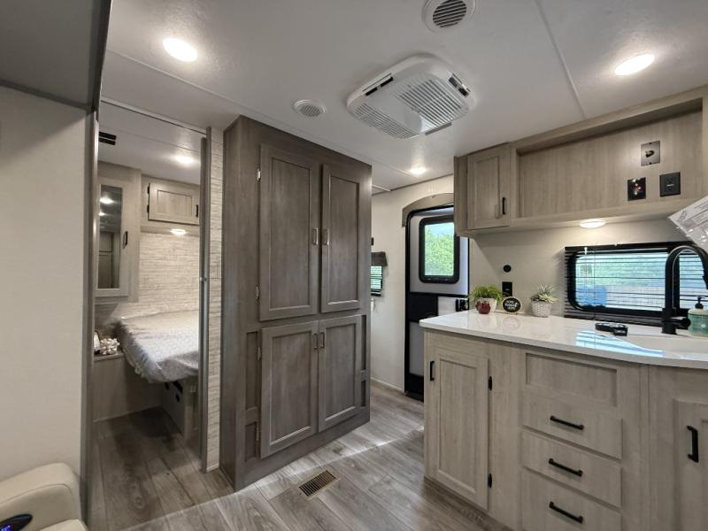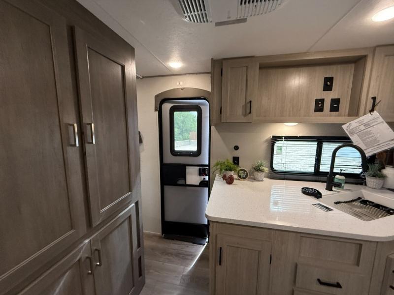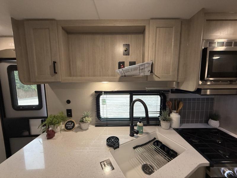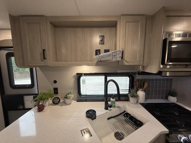 This half-ton friendly trailer is easy to pull and park, and is spacious thanks to the large slide out in the main living and kitchen area! You can dine at the booth dinette or choose the free standing dinette option, and the sofa offers drink holders for your drink when you're relaxing. The rear corner offers a full bathroom and a large wardrobe/pantry for the storage you need. The galley kitchen offers full amenities plus a breakfast bar where you can set out fresh fruit and cereal. And the 15' awning provides protection from the elements plus has the choice of multiple LED colors with the use of the remote.
