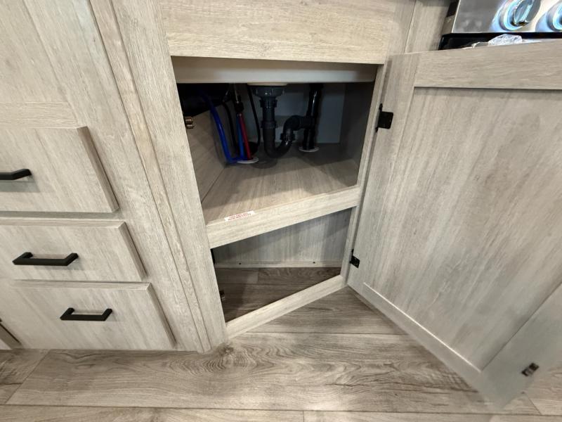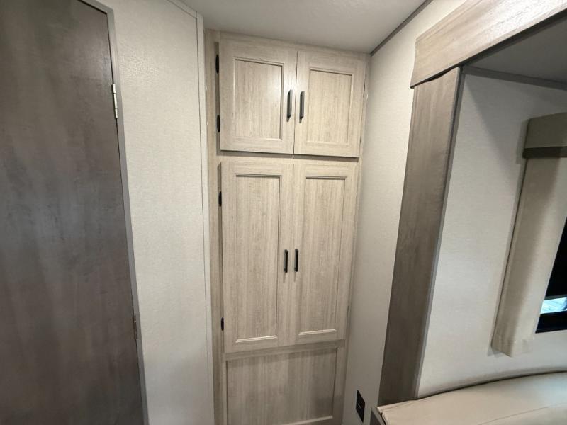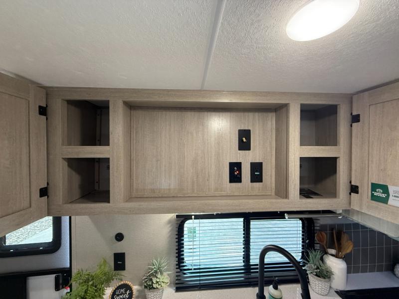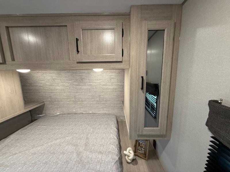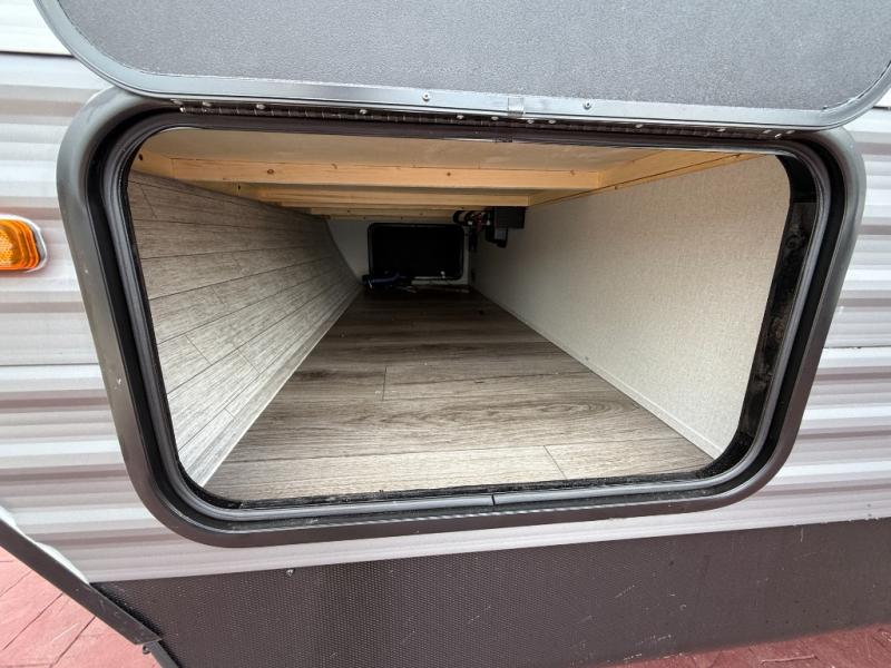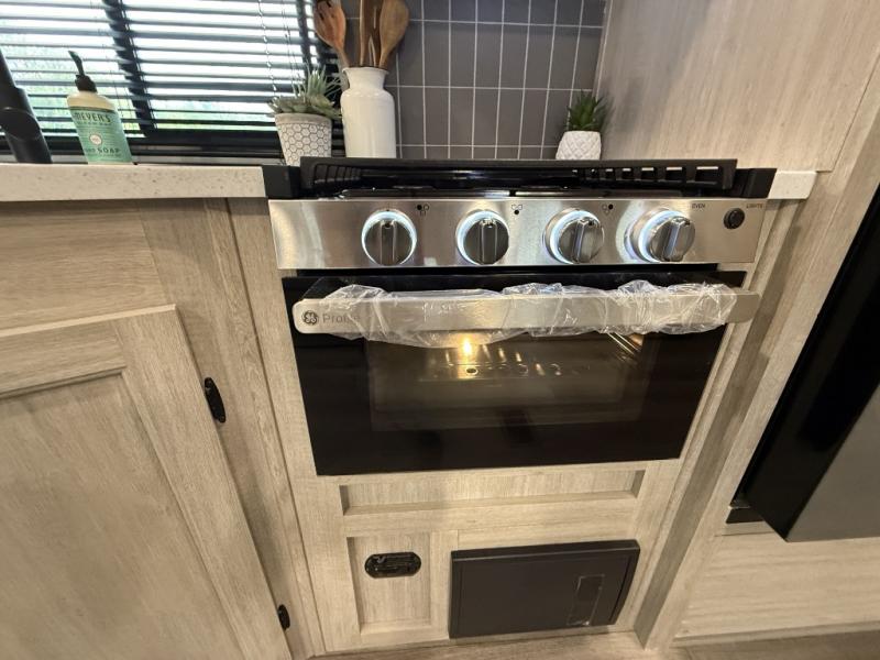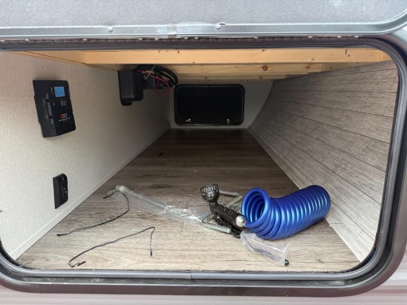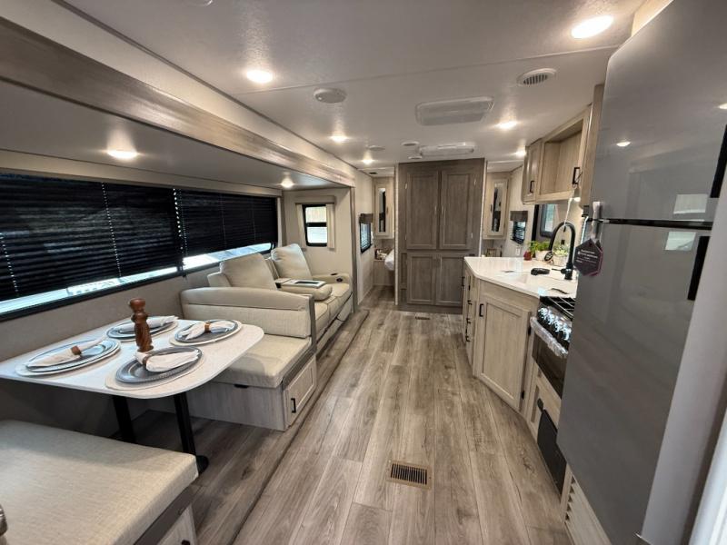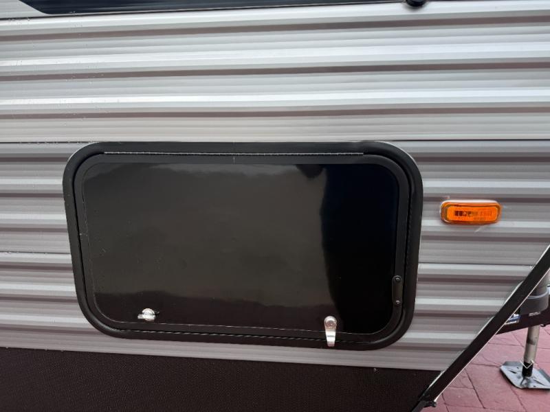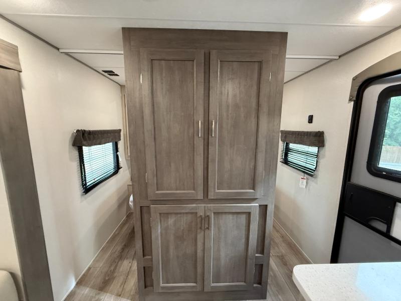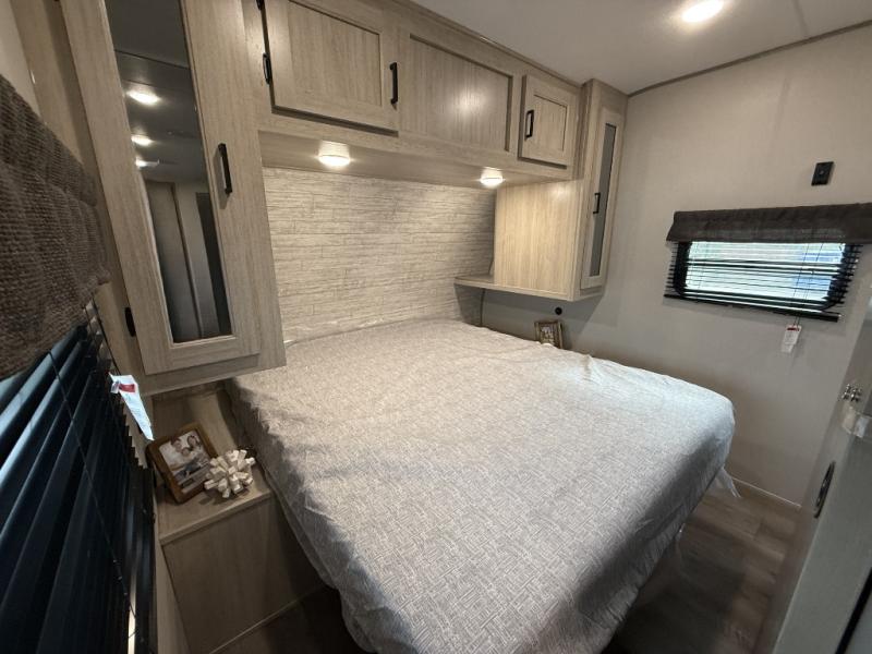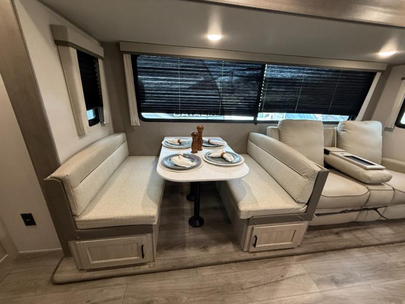 This half-ton friendly trailer is easy to pull and park, and is spacious thanks to the large slide out in the main living and kitchen area! You can dine at the booth dinette or choose the free standing dinette option, and the sofa offers drink holders for your drink when you're relaxing. The rear corner offers a full bathroom and a large wardrobe/pantry for the storage you need. The galley kitchen offers full amenities plus a breakfast bar where you can set out fresh fruit and cereal. And the 15' awning provides protection from the elements plus has the choice of multiple LED colors with the use of the remote.