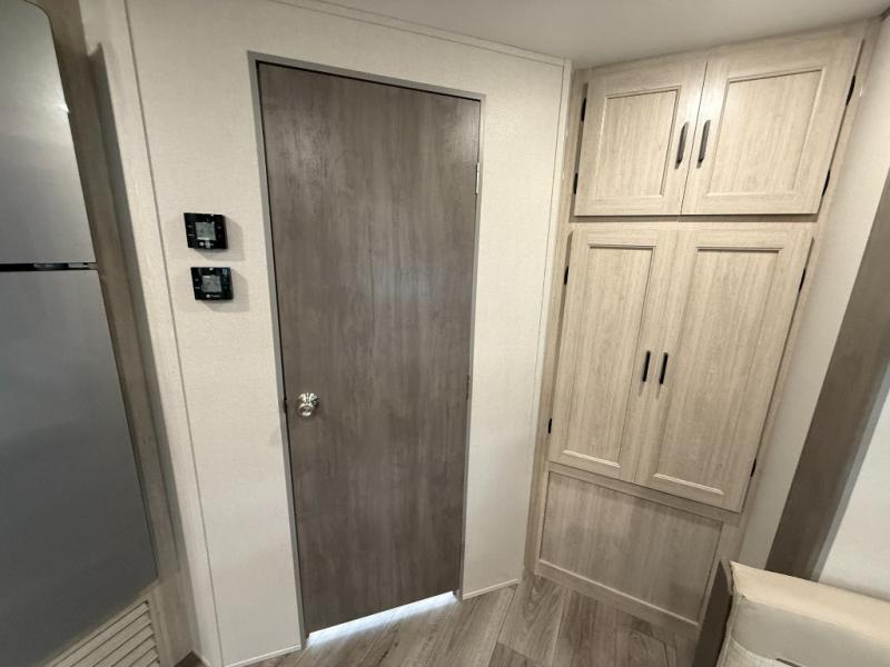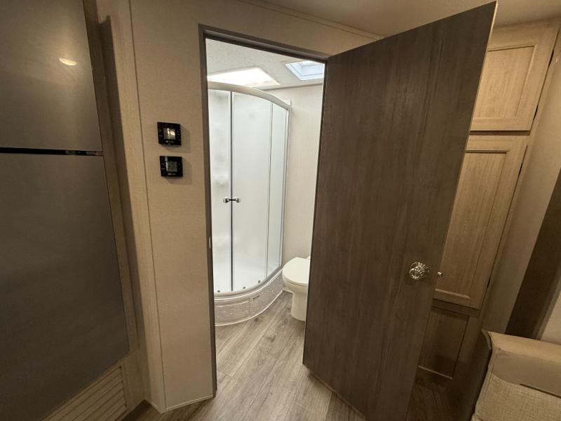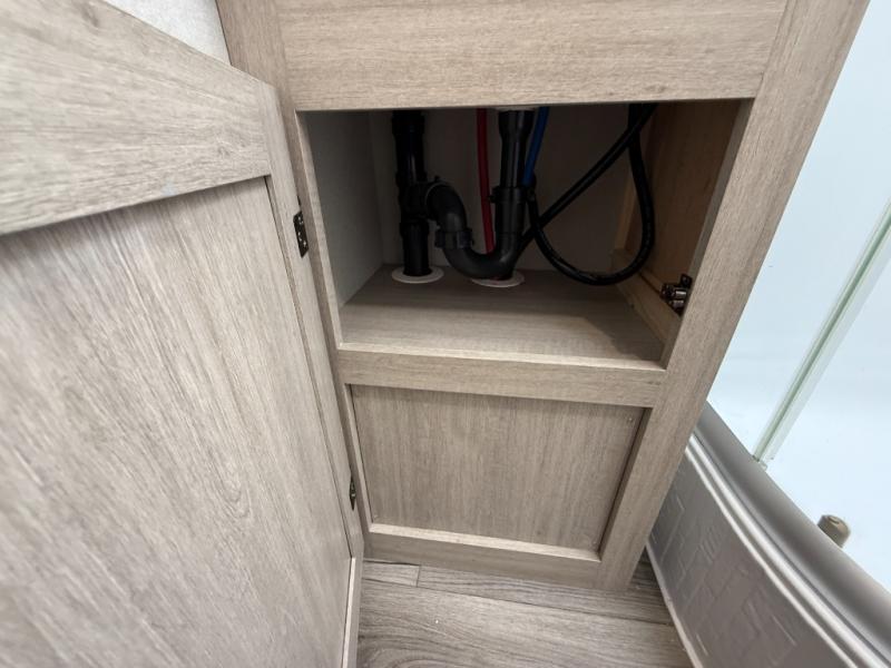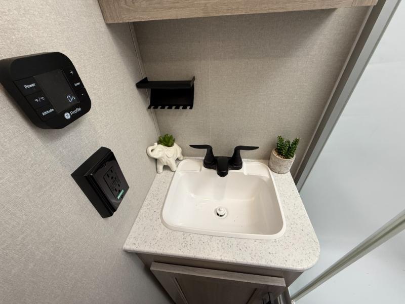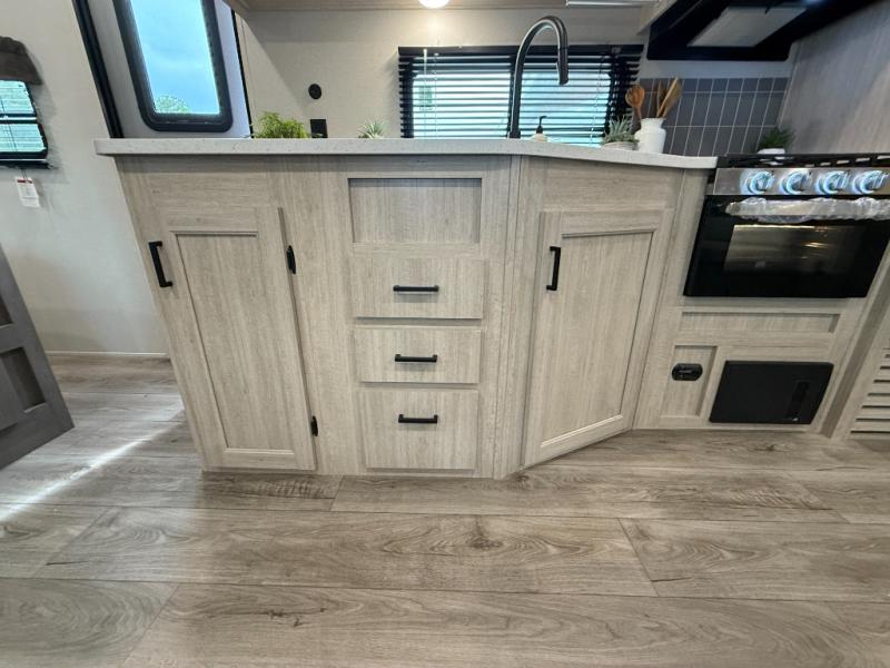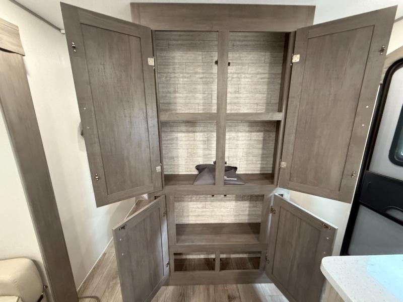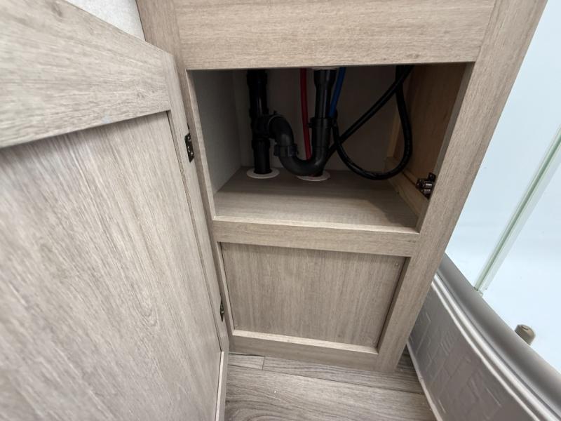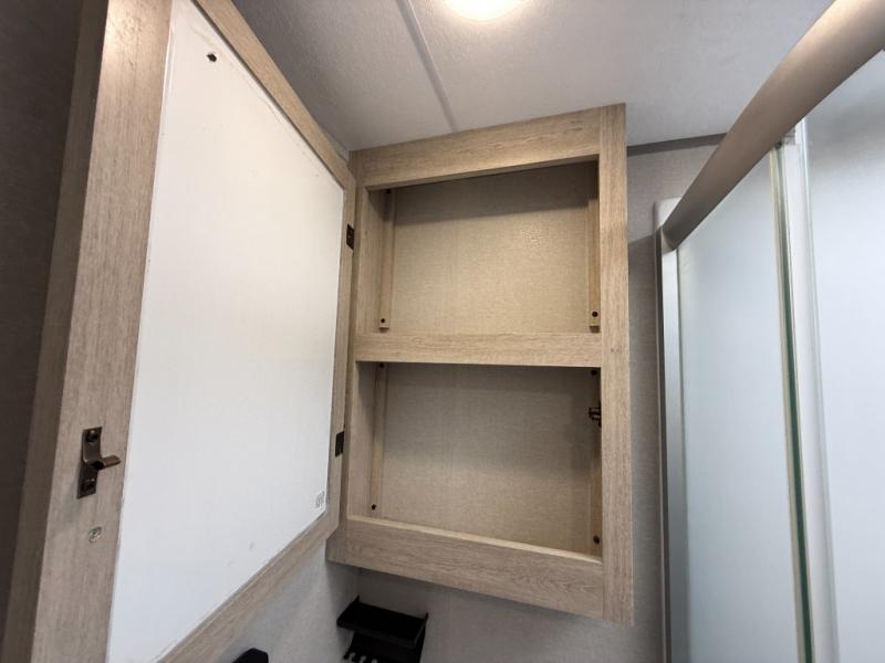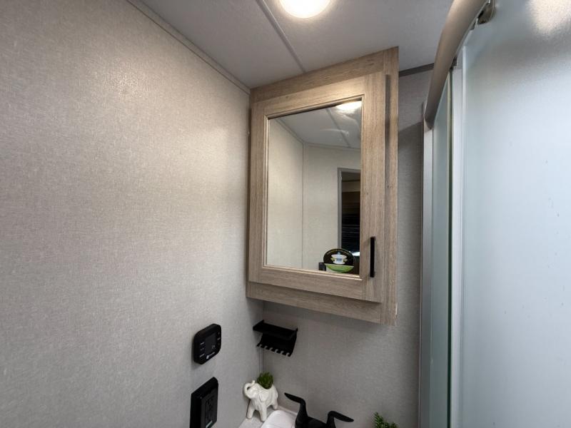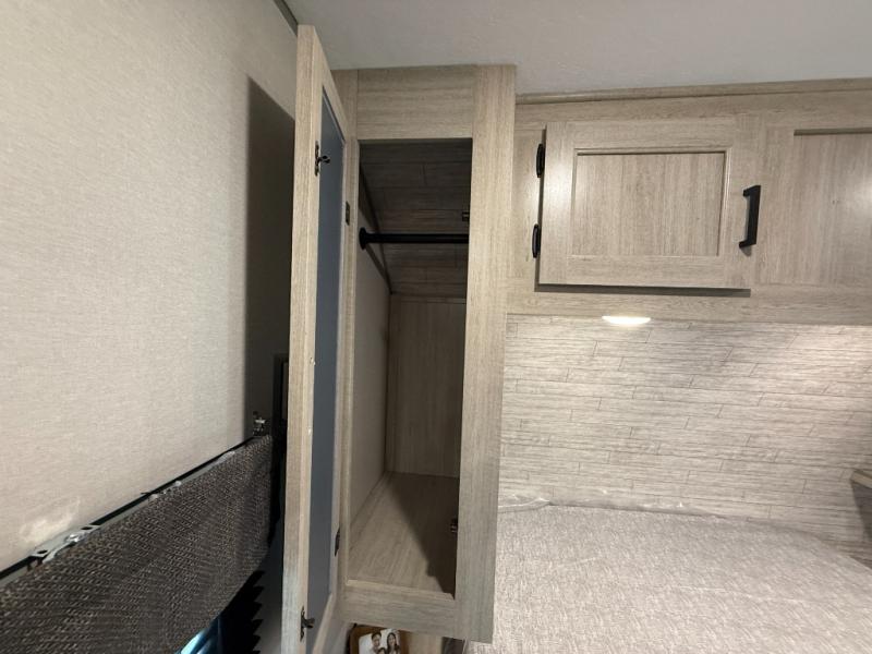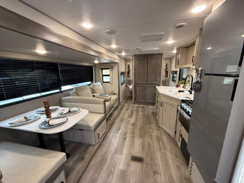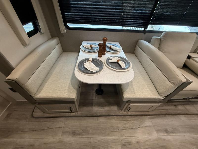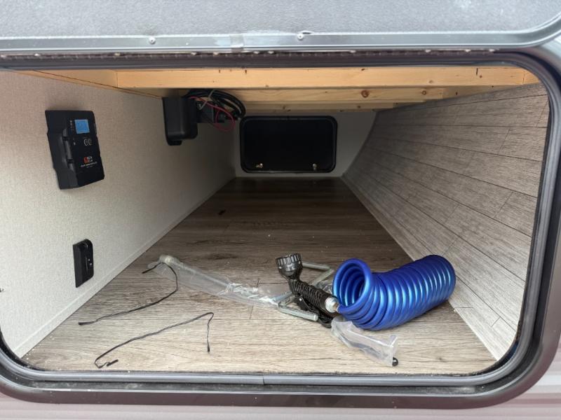 This half-ton friendly trailer is easy to pull and park, and is spacious thanks to the large slide out in the main living and kitchen area! You can dine at the booth dinette or choose the free standing dinette option, and the sofa offers drink holders for your drink when you're relaxing. The rear corner offers a full bathroom and a large wardrobe/pantry for the storage you need. The galley kitchen offers full amenities plus a breakfast bar where you can set out fresh fruit and cereal. And the 15' awning provides protection from the elements plus has the choice of multiple LED colors with the use of the remote.