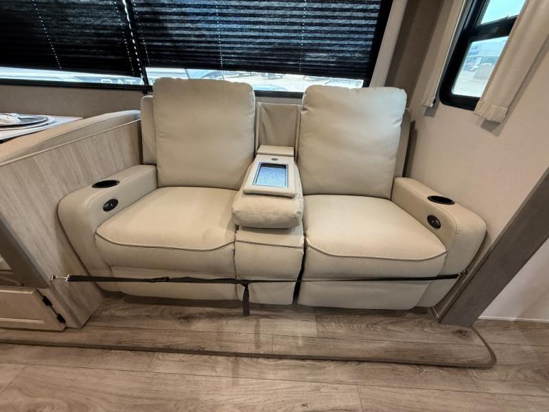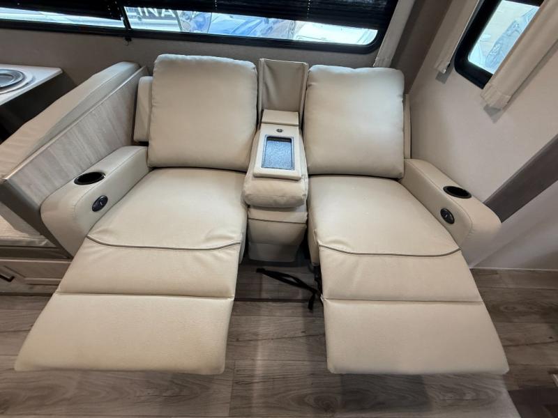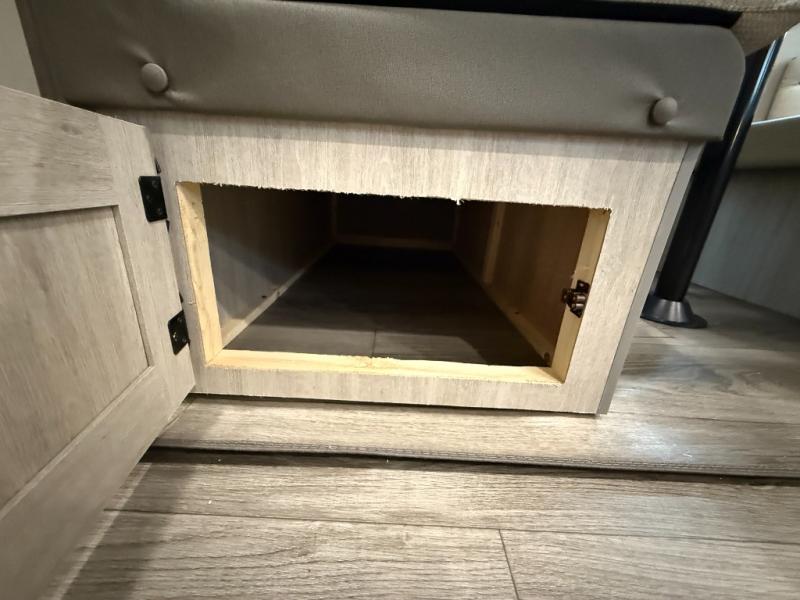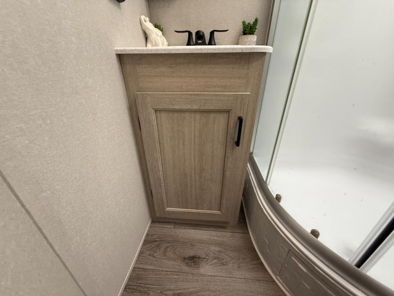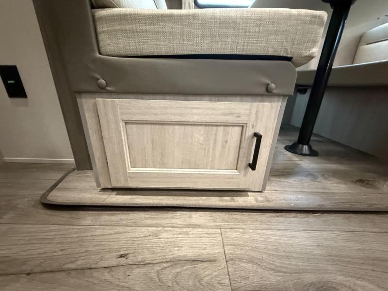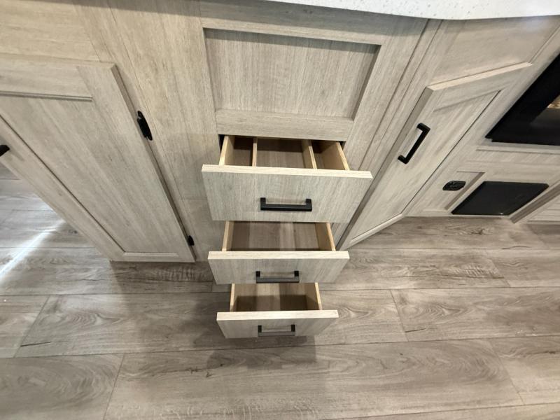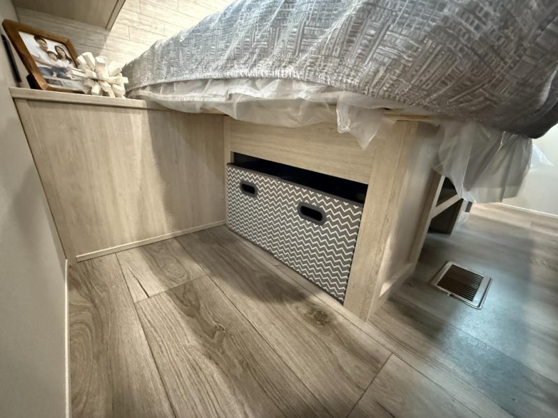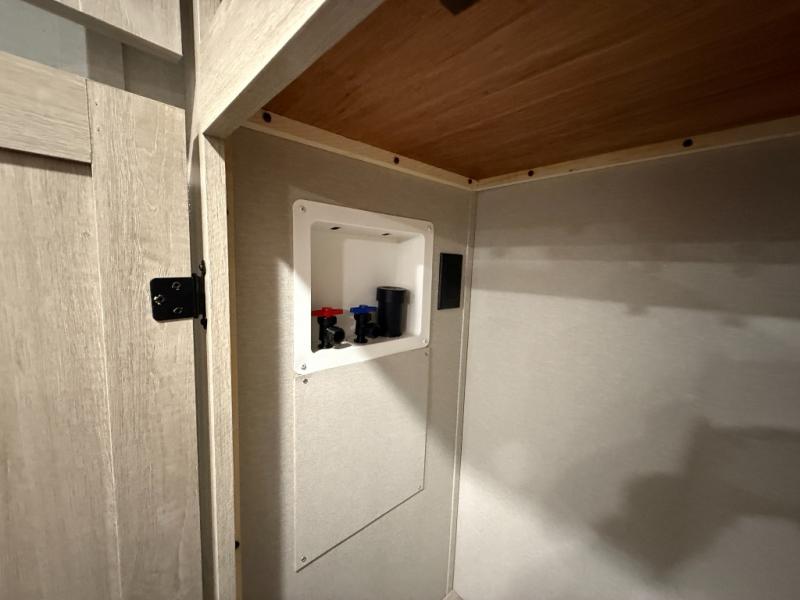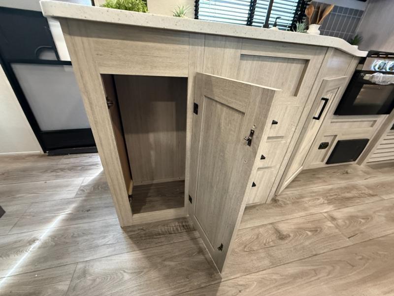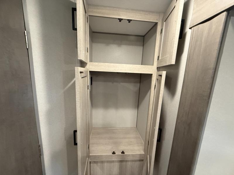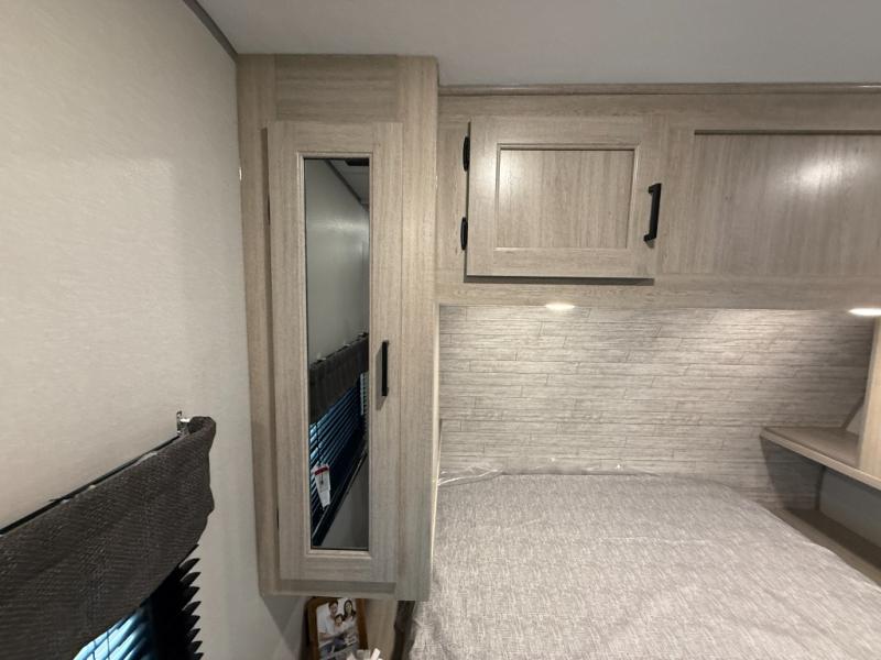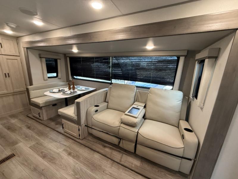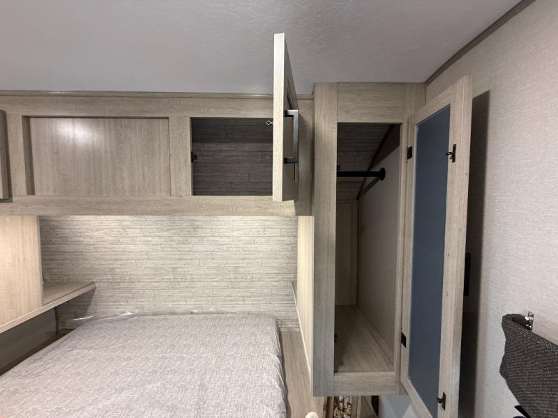 This half-ton friendly trailer is easy to pull and park, and is spacious thanks to the large slide out in the main living and kitchen area! You can dine at the booth dinette or choose the free standing dinette option, and the sofa offers drink holders for your drink when you're relaxing. The rear corner offers a full bathroom and a large wardrobe/pantry for the storage you need. The galley kitchen offers full amenities plus a breakfast bar where you can set out fresh fruit and cereal. And the 15' awning provides protection from the elements plus has the choice of multiple LED colors with the use of the remote.