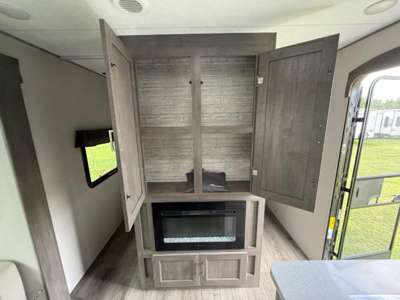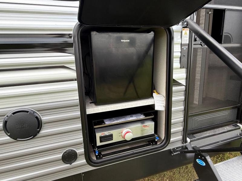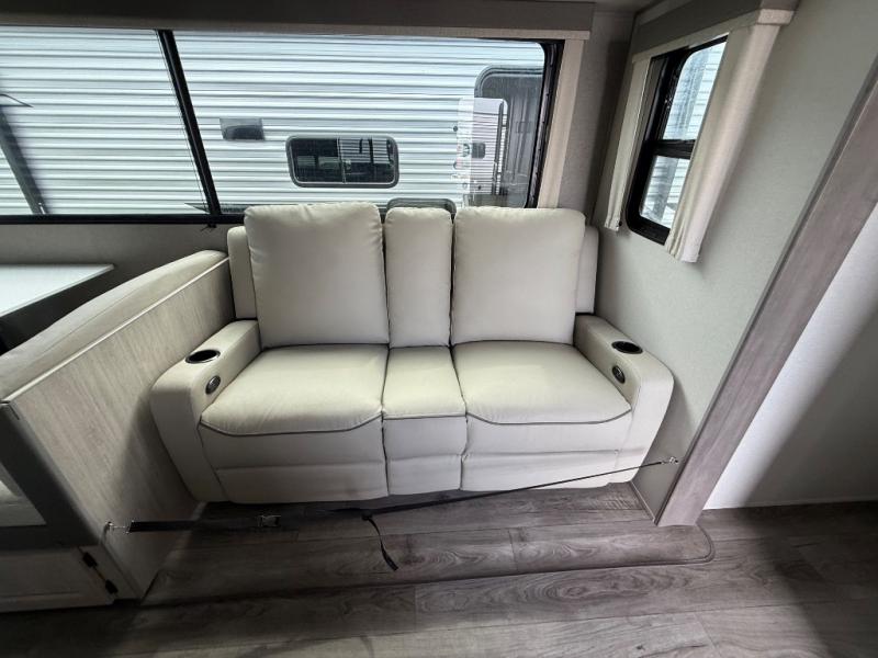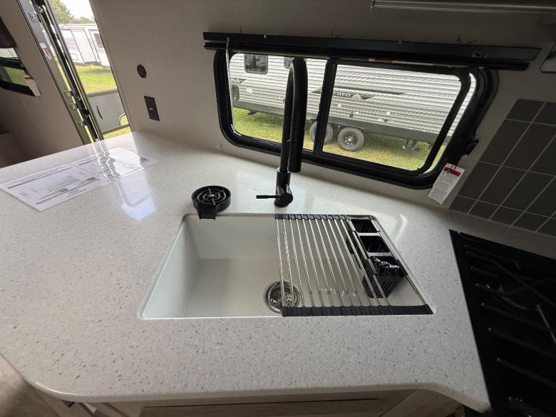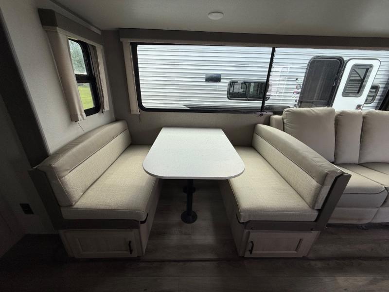 This half-ton friendly trailer is easy to pull and park, and is spacious thanks to the large slide out in the main living and kitchen area! You can dine at the booth dinette or choose the free standing dinette option, and the sofa offers drink holders for your drink when you're relaxing. The rear corner offers a full bathroom and a large wardrobe/pantry for the storage you need. The galley kitchen offers full amenities plus a breakfast bar where you can set out fresh fruit and cereal. And the 15' awning provides protection from the elements plus has the choice of multiple LED colors with the use of the remote.