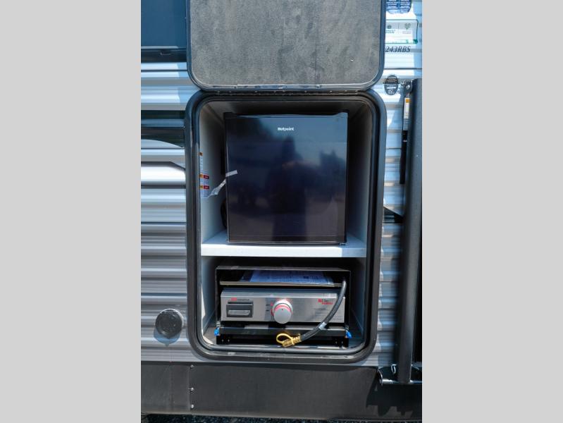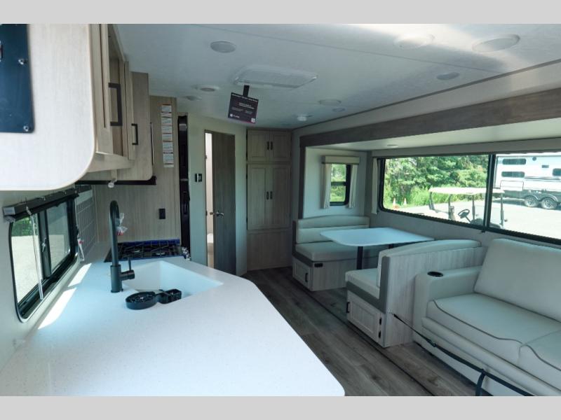 This half-ton friendly trailer is easy to pull and park, and is spacious thanks to the large slide out in the main living and kitchen area! You can dine at the booth dinette or choose the free standing dinette option, and the sofa offers drink holders for your drink when you're relaxing. The rear corner offers a full bathroom and a large wardrobe/pantry for the storage you need. The galley kitchen offers full amenities plus a breakfast bar where you can set out fresh fruit and cereal. And the 15' awning provides protection from the elements plus has the choice of multiple LED colors with the use of the remote.