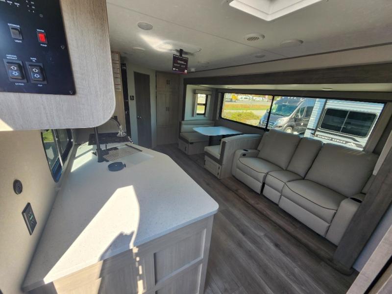 This half-ton friendly trailer is easy to pull and park, and is spacious thanks to the large slide out in the main living and kitchen area! You can dine at the booth dinette or choose the free standing dinette option, and the sofa offers drink holders for your drink when you're relaxing. The rear corner offers a full bathroom and a large wardrobe/pantry for the storage you need. The galley kitchen offers full amenities plus a breakfast bar where you can set out fresh fruit and cereal. And the 15' awning provides protection from the elements plus has the choice of multiple LED colors with the use of the remote.