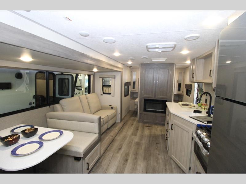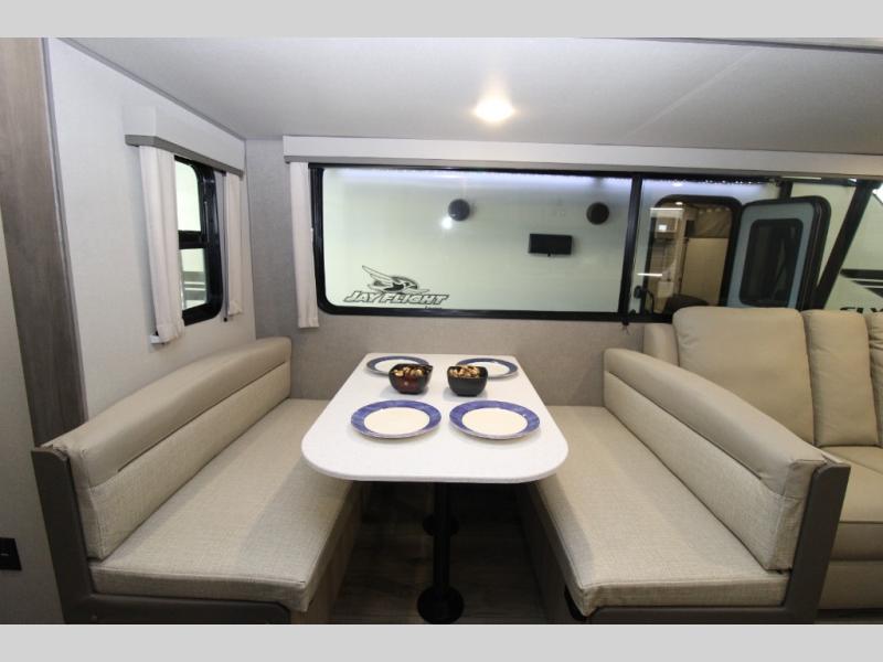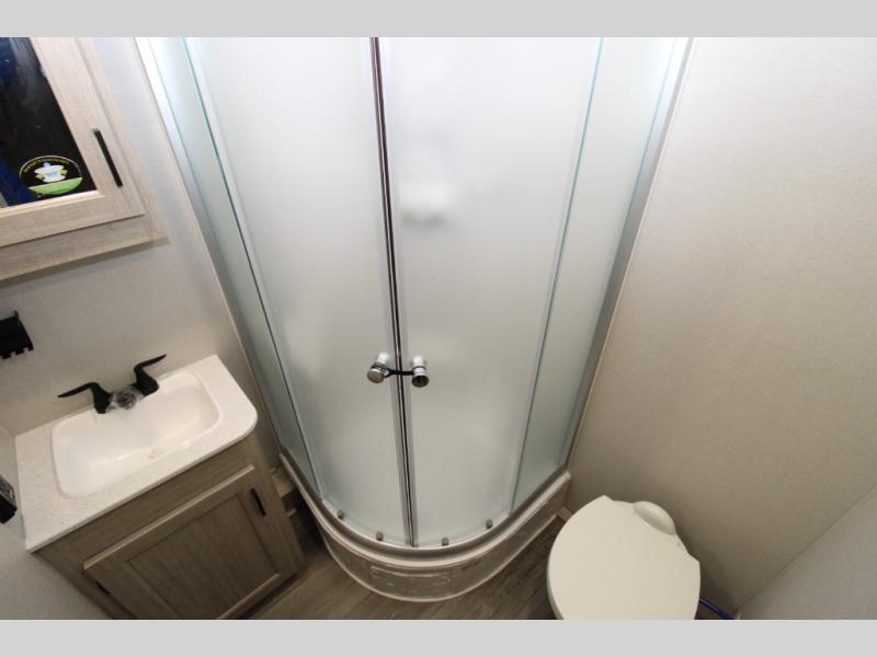 This half-ton friendly trailer is easy to pull and park and is spacious thanks to the large slide out in the main living and kitchen area! You can dine at the booth dinette or choose the free-standing dinette option, and the trundle sofa offers drink holders for your drink when you're relaxing. The rear corner offers a full bathroom and a large wardrobe/pantry for the storage you need. The galley kitchen offers full amenities plus a breakfast bar where you can set out fresh fruit and cereal. And the 15' awning provides protection from the elements plus has the choice of multiple LED colors with the use of the remote.