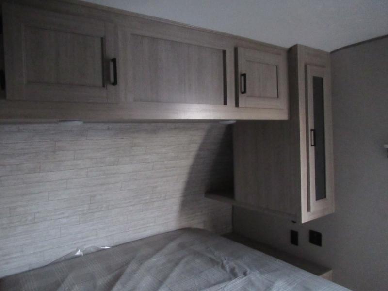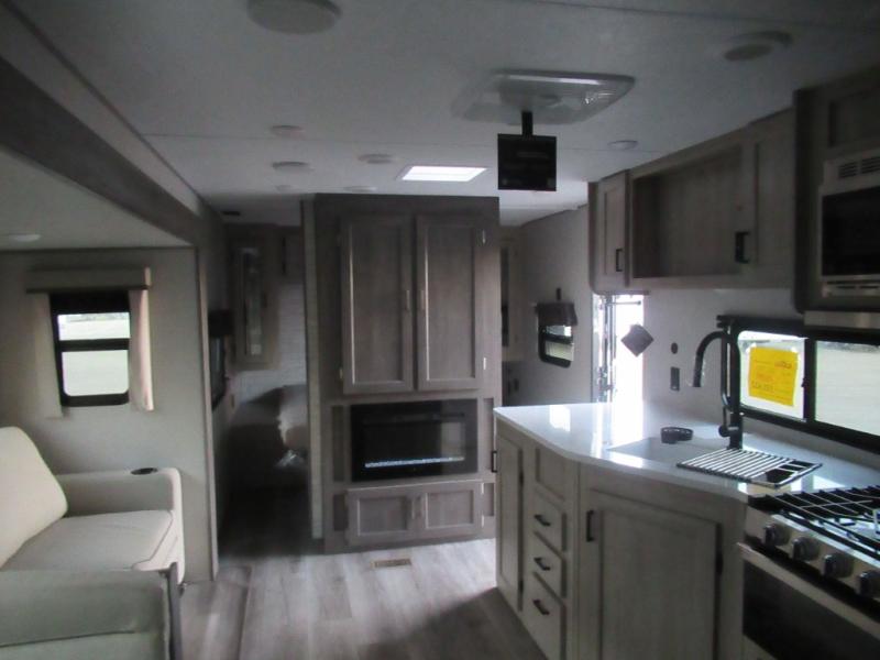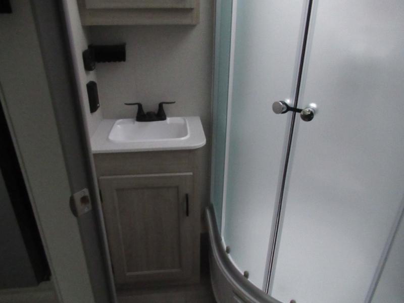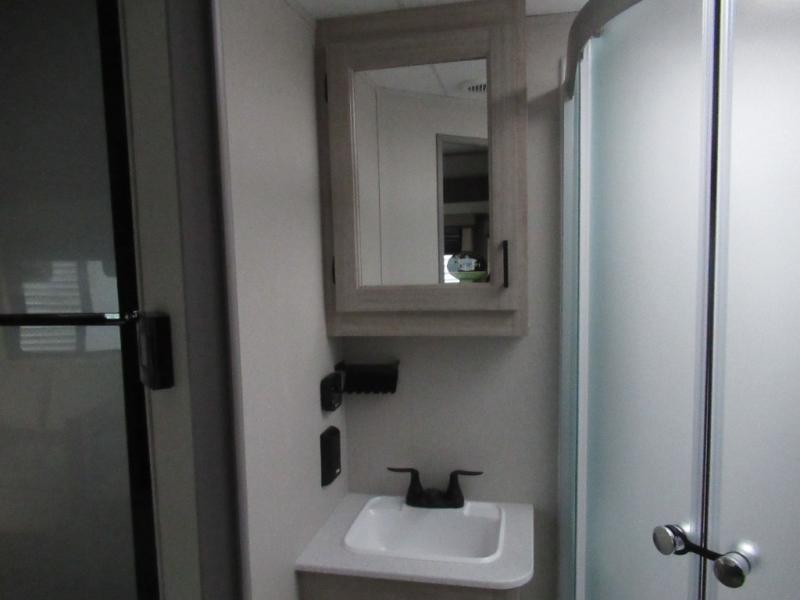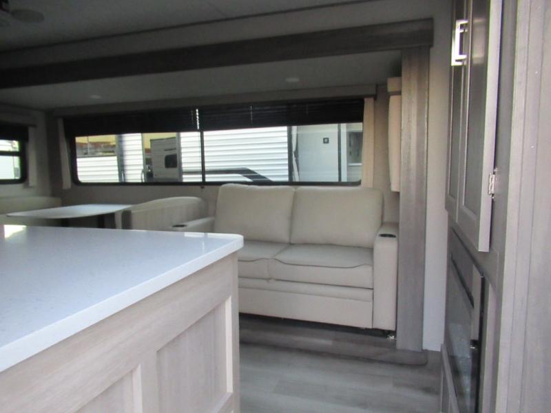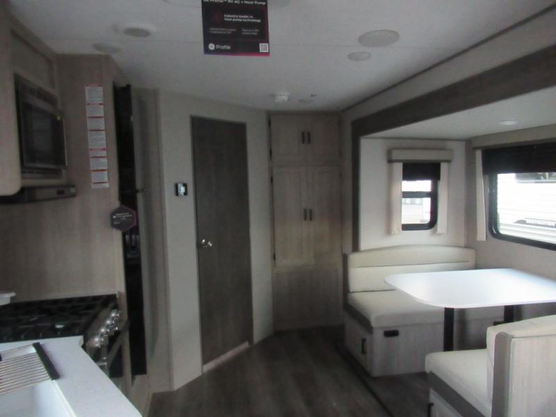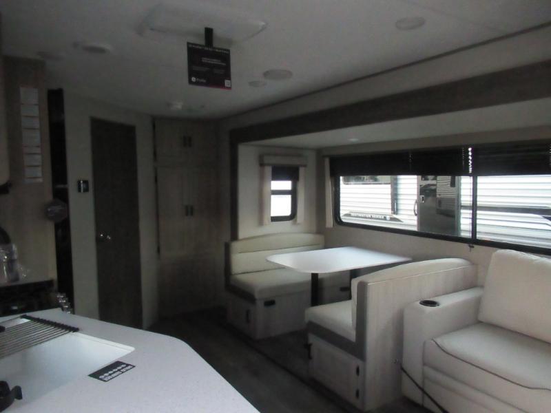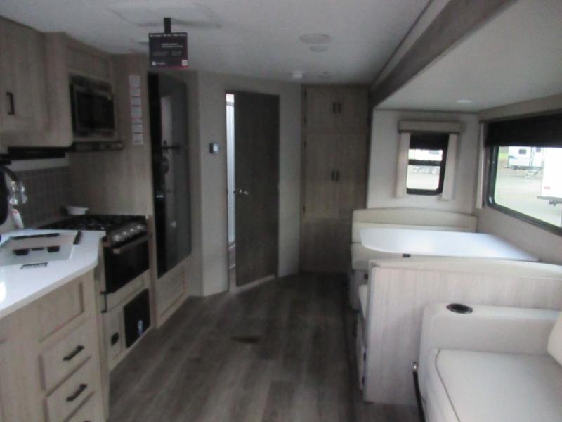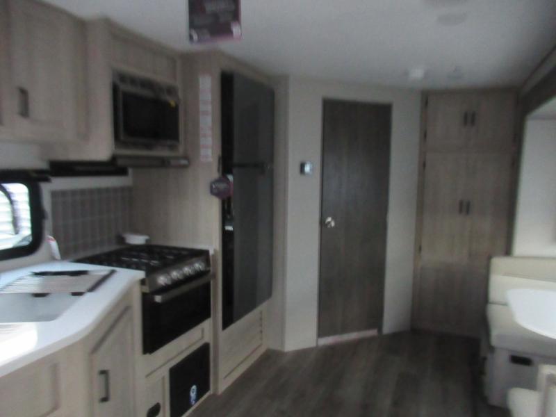 This half-ton friendly trailer is easy to pull and park and is spacious thanks to the large slide out in the main living and kitchen area! You can dine at the booth dinette or choose the free-standing dinette option, and the trundle sofa offers drink holders for your drink when you're relaxing. The rear corner offers a full bathroom and a large wardrobe/pantry for the storage you need. The galley kitchen offers full amenities plus a breakfast bar where you can set out fresh fruit and cereal. And the 15' awning provides protection from the elements plus has the choice of multiple LED colors with the use of the remote.