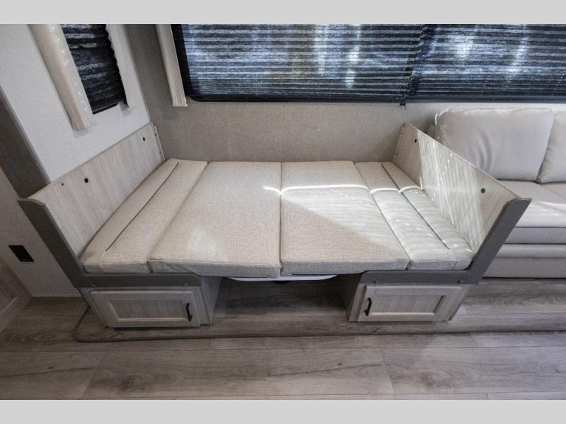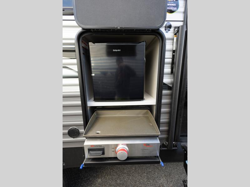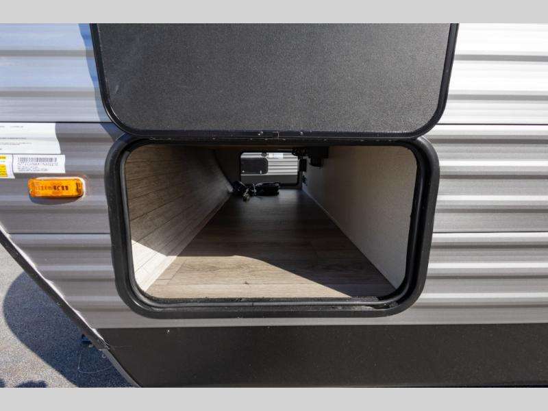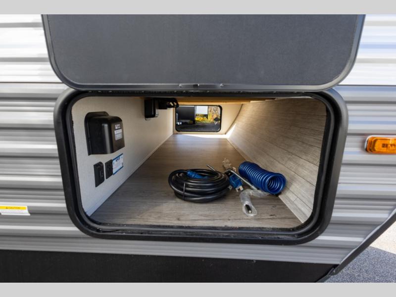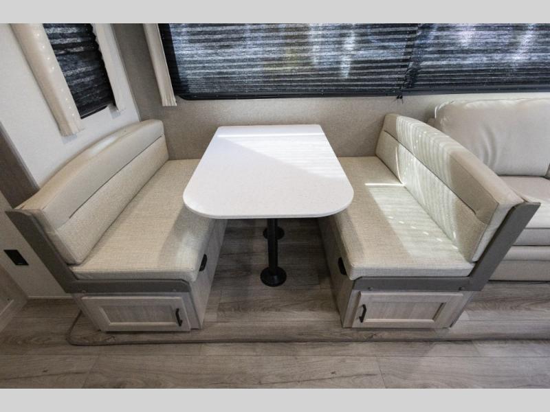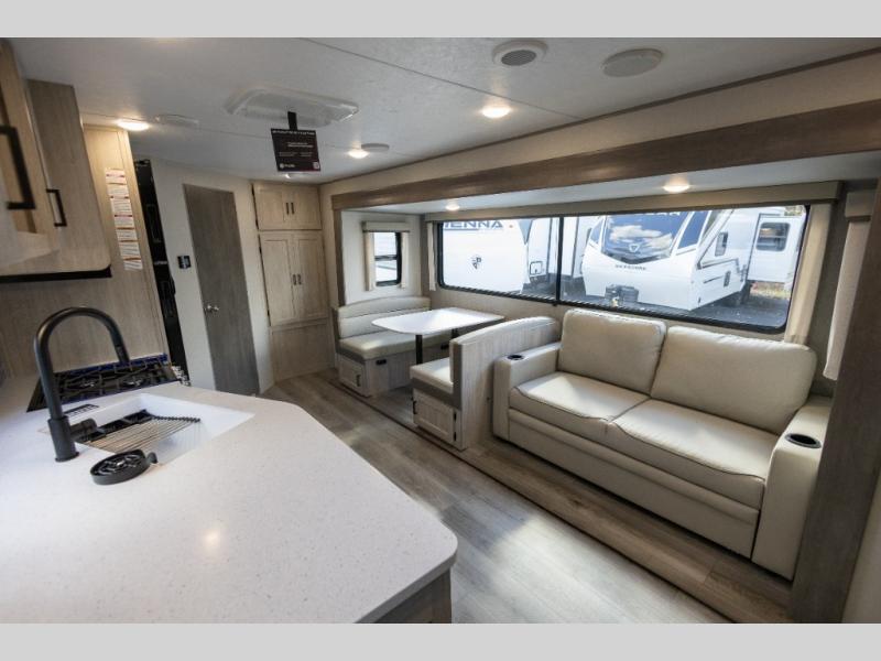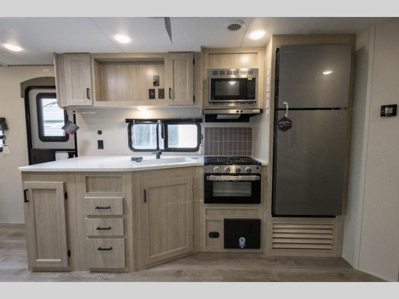 This half-ton friendly trailer is easy to pull and park and is spacious thanks to the large slide out in the main living and kitchen area! You can dine at the booth dinette or choose the free-standing dinette option, and the trundle sofa offers drink holders for your drink when you're relaxing. The rear corner offers a full bathroom and a large wardrobe/pantry for the storage you need. The galley kitchen offers full amenities plus a breakfast bar where you can set out fresh fruit and cereal. And the 15' awning provides protection from the elements plus has the choice of multiple LED colors with the use of the remote.