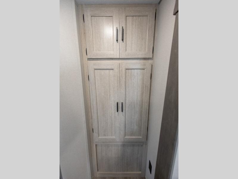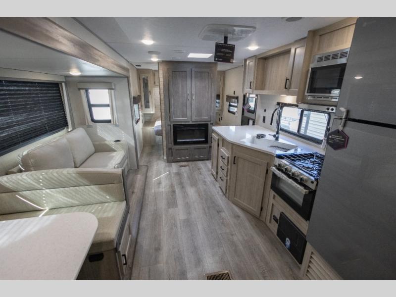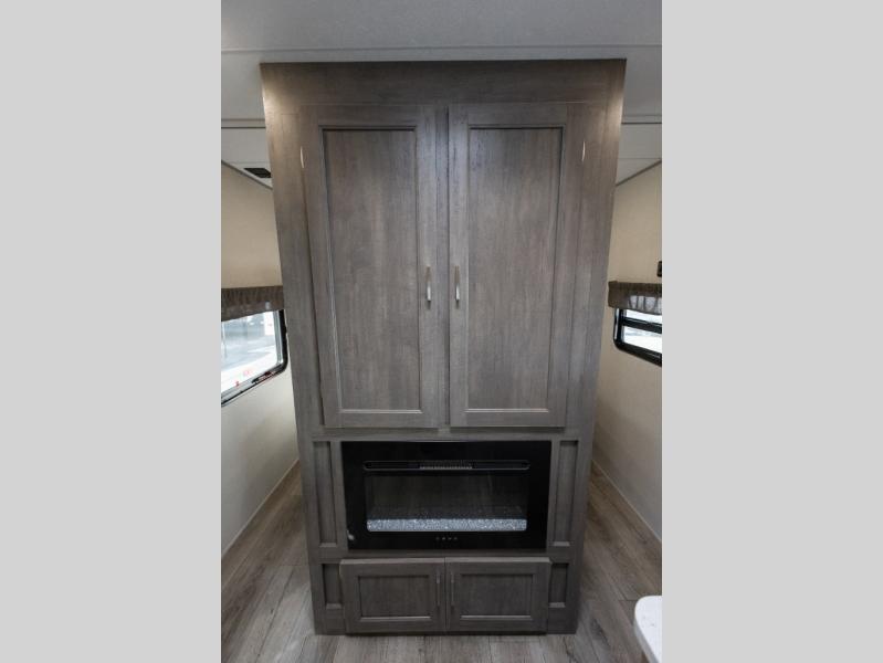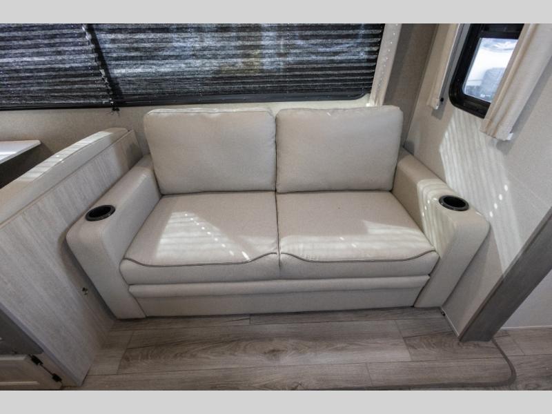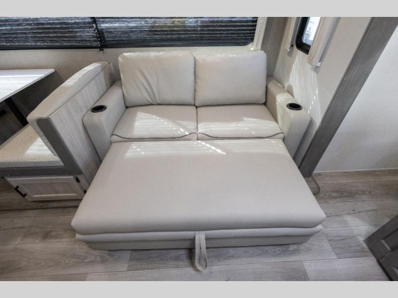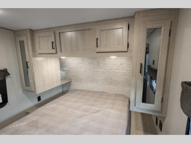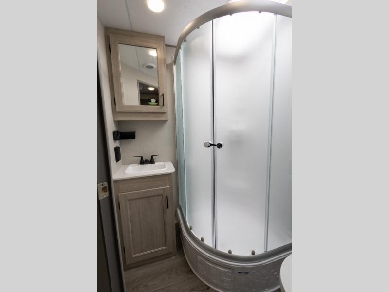 This half-ton friendly trailer is easy to pull and park and is spacious thanks to the large slide out in the main living and kitchen area! You can dine at the booth dinette or choose the free-standing dinette option, and the trundle sofa offers drink holders for your drink when you're relaxing. The rear corner offers a full bathroom and a large wardrobe/pantry for the storage you need. The galley kitchen offers full amenities plus a breakfast bar where you can set out fresh fruit and cereal. And the 15' awning provides protection from the elements plus has the choice of multiple LED colors with the use of the remote.