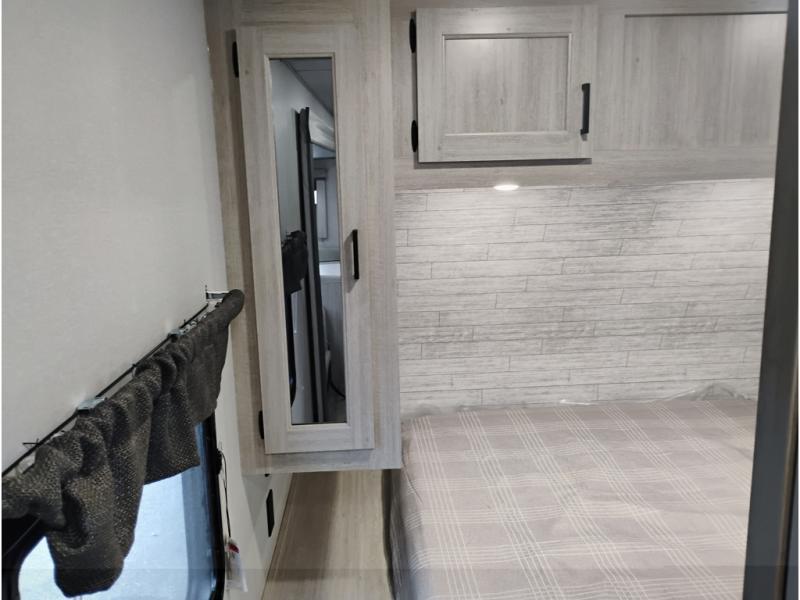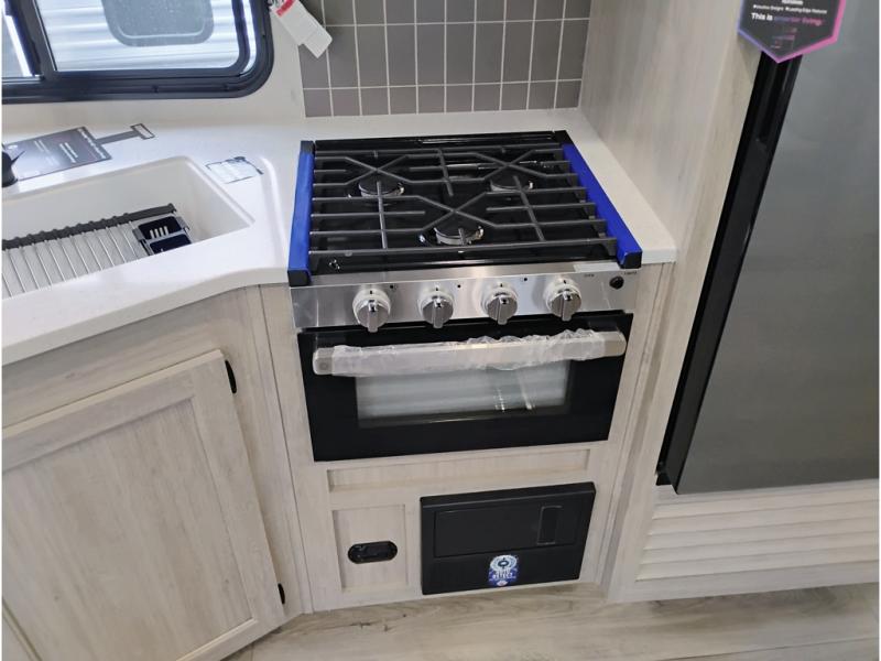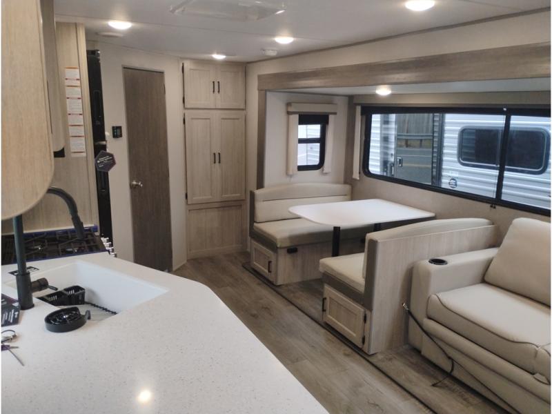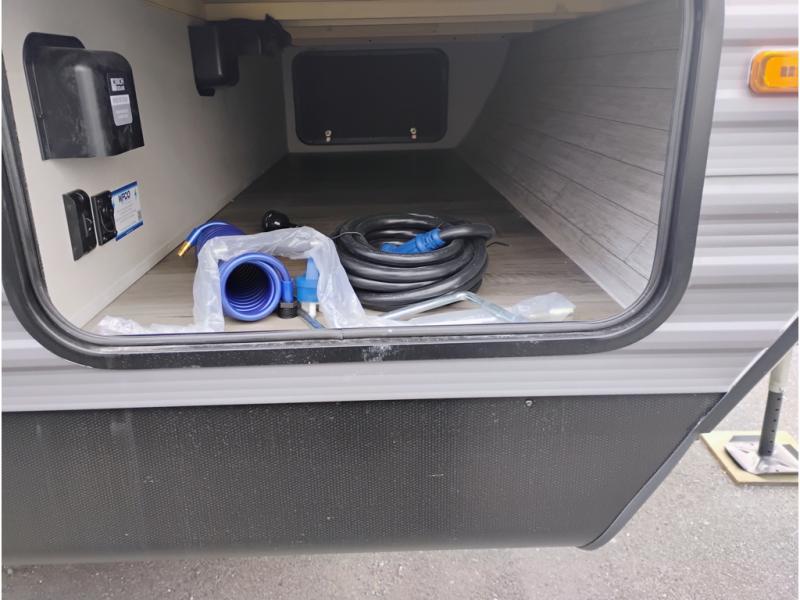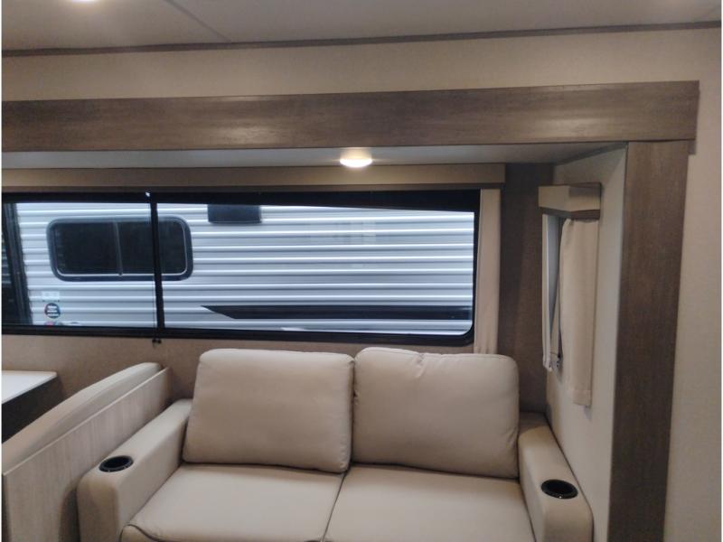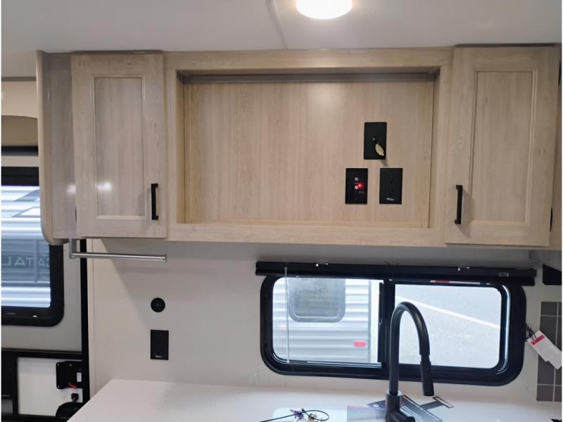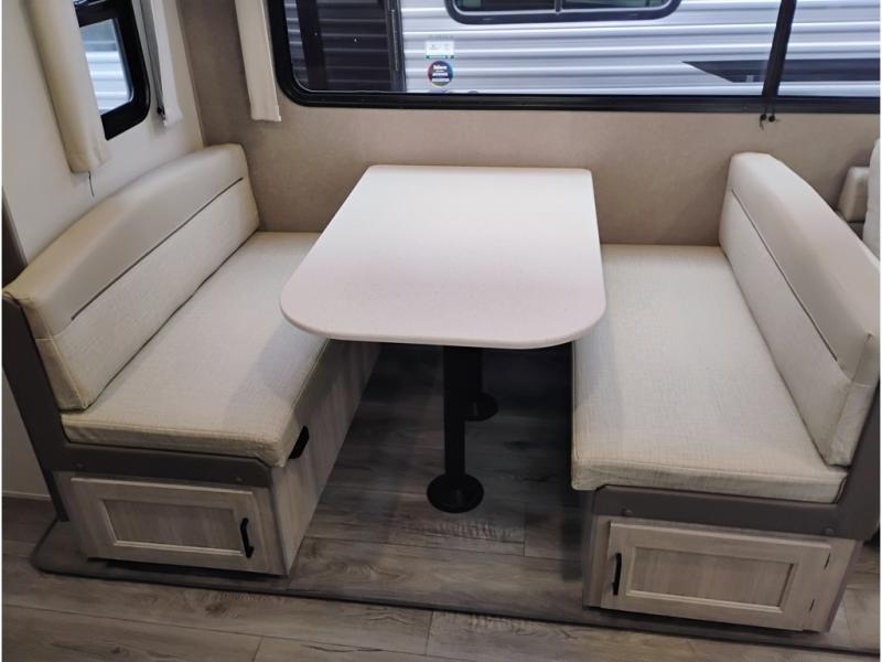 This half-ton friendly trailer is easy to pull and park and is spacious thanks to the large slide out in the main living and kitchen area! You can dine at the booth dinette or choose the free-standing dinette option, and the trundle sofa offers drink holders for your drink when you're relaxing. The rear corner offers a full bathroom and a large wardrobe/pantry for the storage you need. The galley kitchen offers full amenities plus a breakfast bar where you can set out fresh fruit and cereal. And the 15' awning provides protection from the elements plus has the choice of multiple LED colors with the use of the remote.