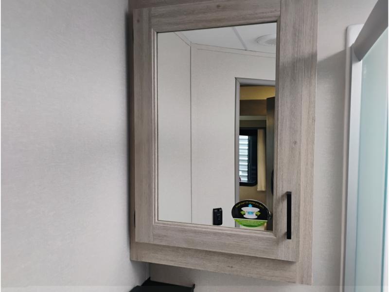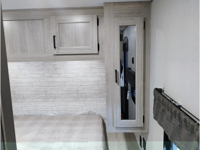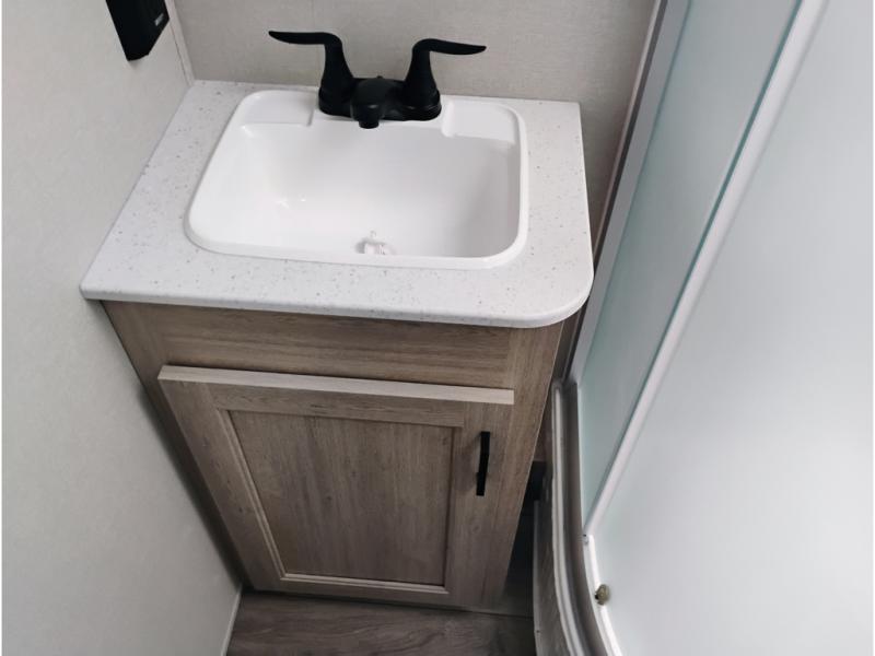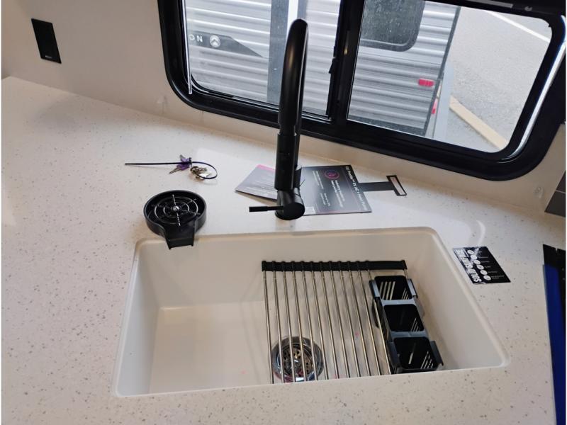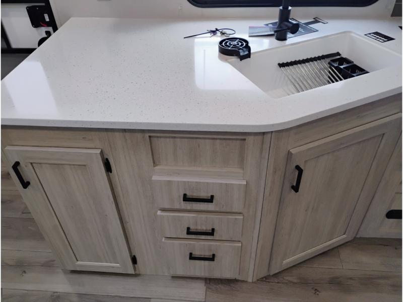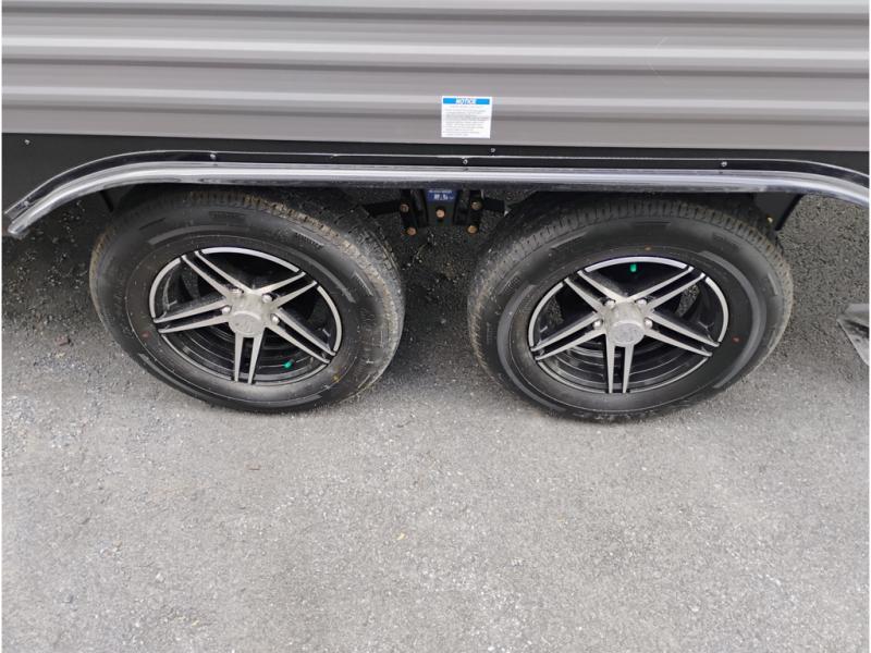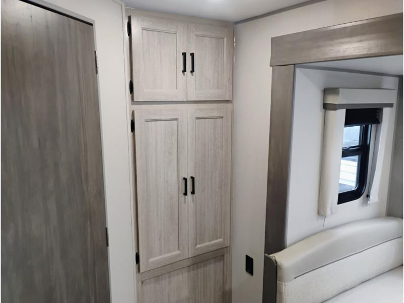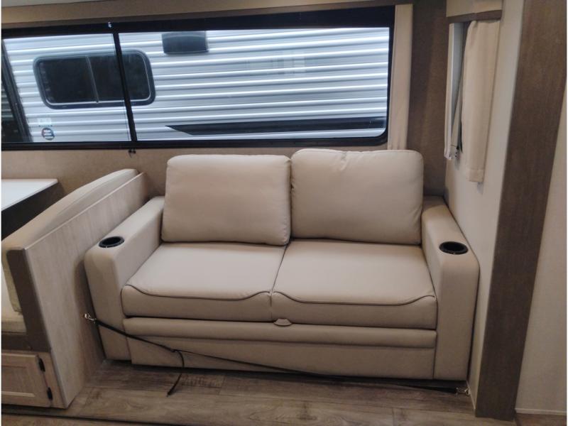 This half-ton friendly trailer is easy to pull and park and is spacious thanks to the large slide out in the main living and kitchen area! You can dine at the booth dinette or choose the free-standing dinette option, and the trundle sofa offers drink holders for your drink when you're relaxing. The rear corner offers a full bathroom and a large wardrobe/pantry for the storage you need. The galley kitchen offers full amenities plus a breakfast bar where you can set out fresh fruit and cereal. And the 15' awning provides protection from the elements plus has the choice of multiple LED colors with the use of the remote.