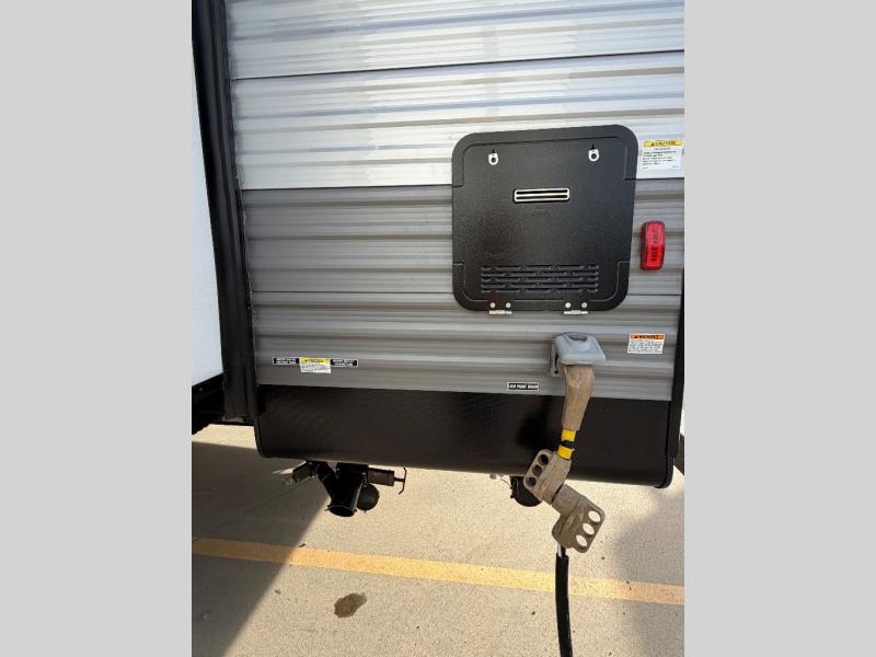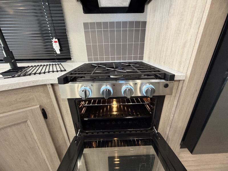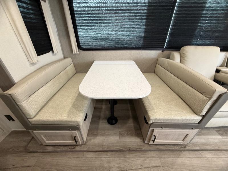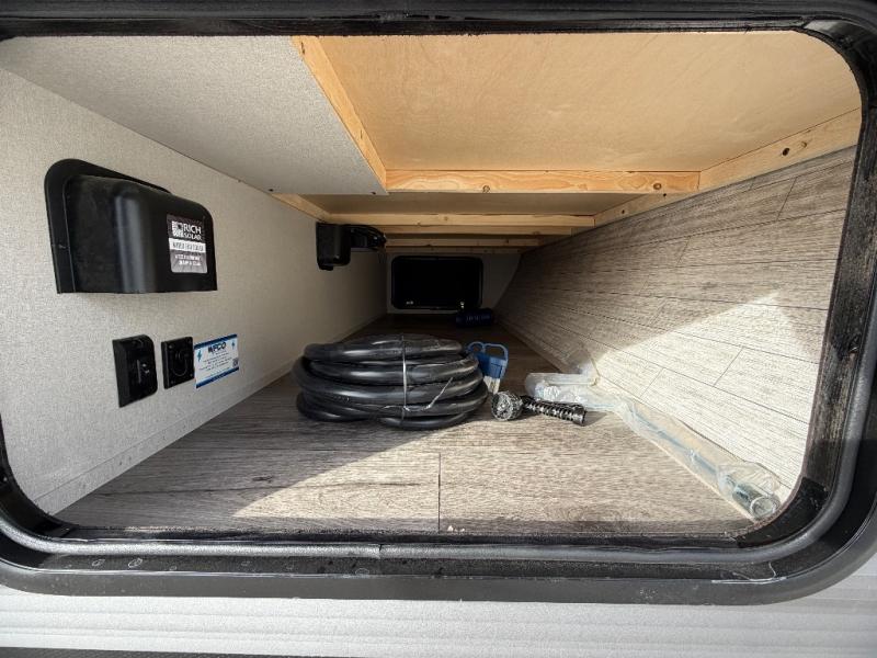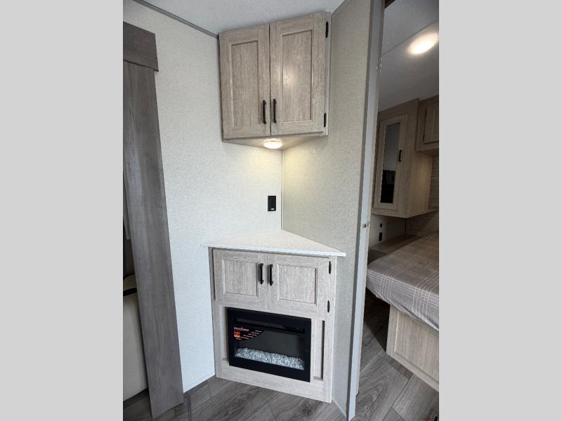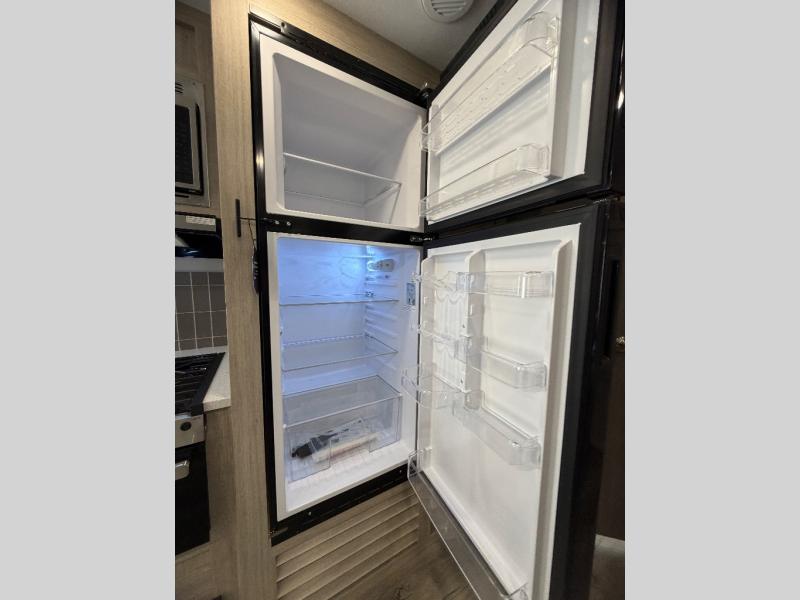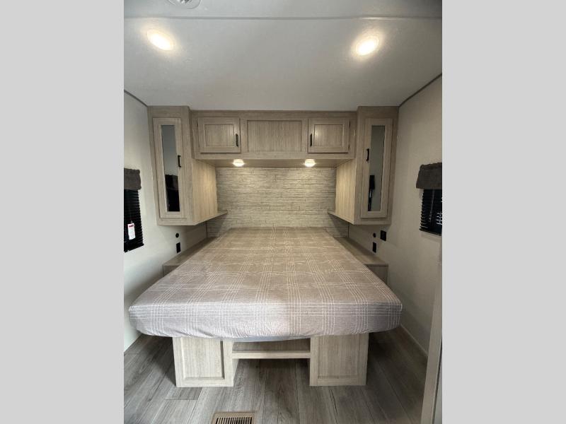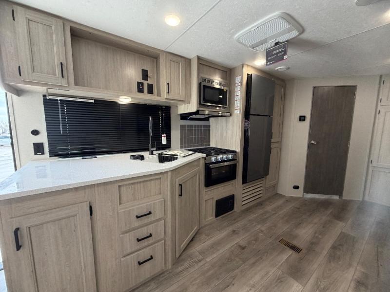 This half-ton friendly trailer is easy to pull and park and is spacious thanks to the large slide out in the main living and kitchen area! You can dine at the booth dinette or choose the free-standing dinette option, and the trundle sofa offers drink holders for your drink when you're relaxing. The rear corner offers a full bathroom and a large wardrobe/pantry for the storage you need. The galley kitchen offers full amenities plus a breakfast bar where you can set out fresh fruit and cereal. And the 15' awning provides protection from the elements plus has the choice of multiple LED colors with the use of the remote.