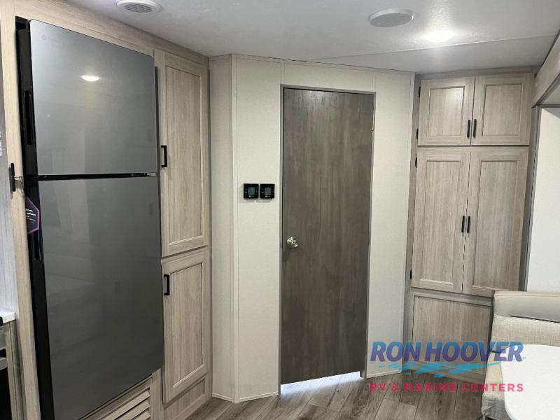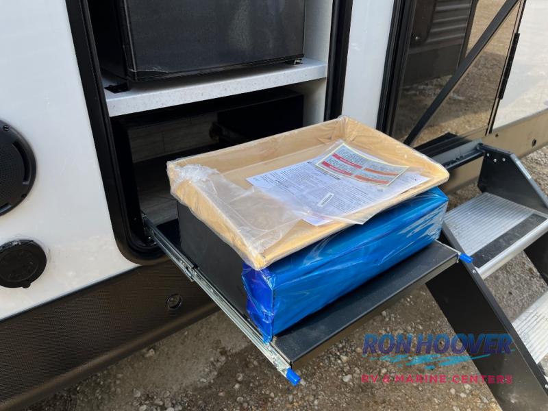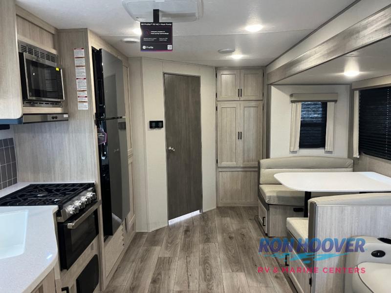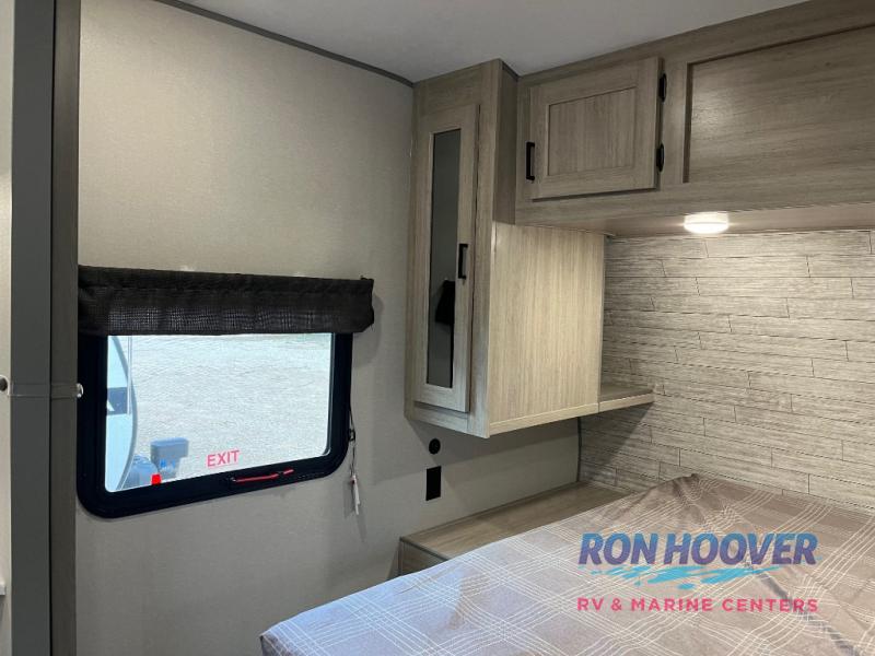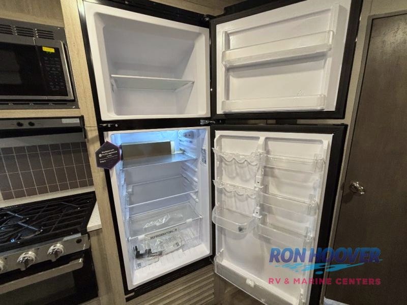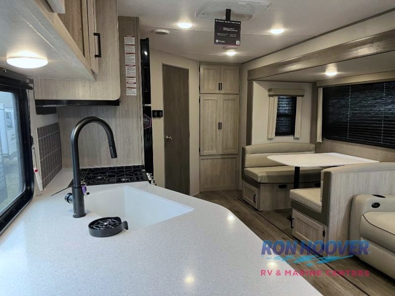 This half-ton friendly trailer is easy to pull and park and is spacious thanks to the large slide out in the main living and kitchen area! You can dine at the booth dinette or choose the free-standing dinette option, and the trundle sofa offers drink holders for your drink when you're relaxing. The rear corner offers a full bathroom and a large wardrobe/pantry for the storage you need. The galley kitchen offers full amenities plus a breakfast bar where you can set out fresh fruit and cereal. And the 15' awning provides protection from the elements plus has the choice of multiple LED colors with the use of the remote.