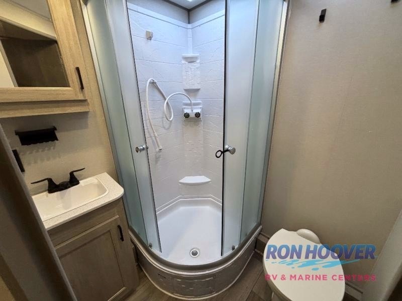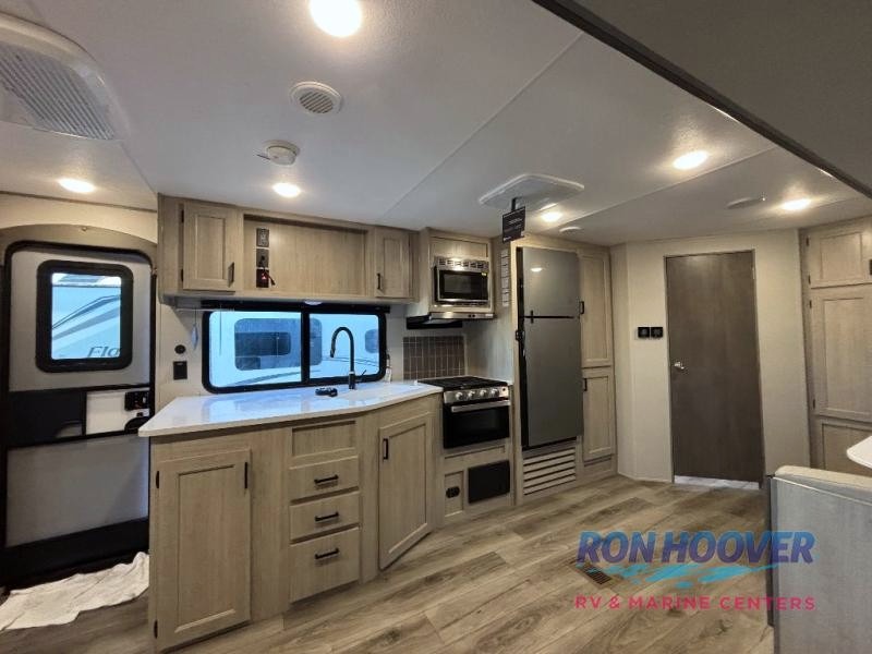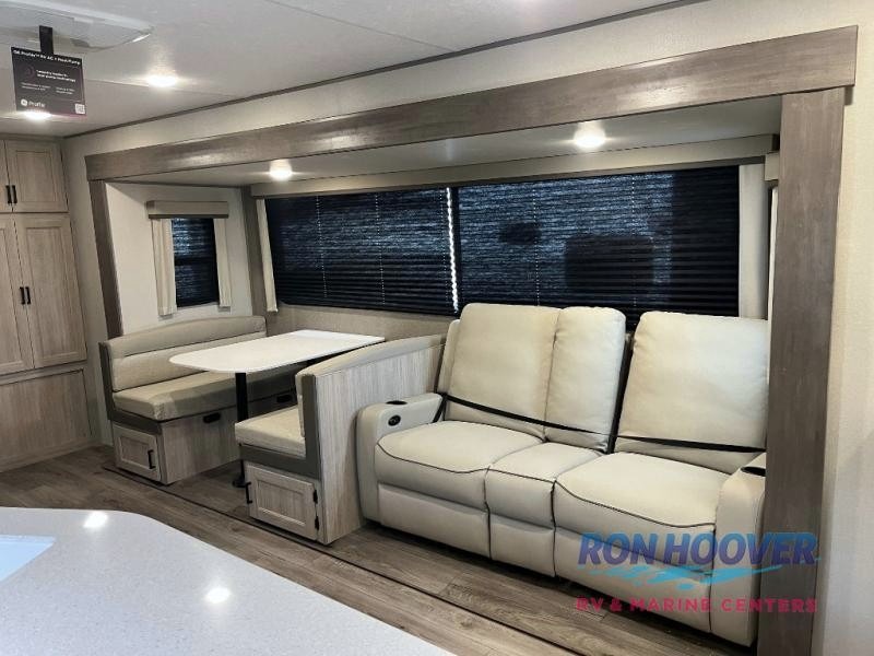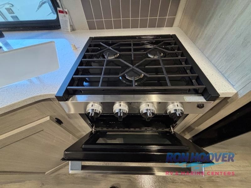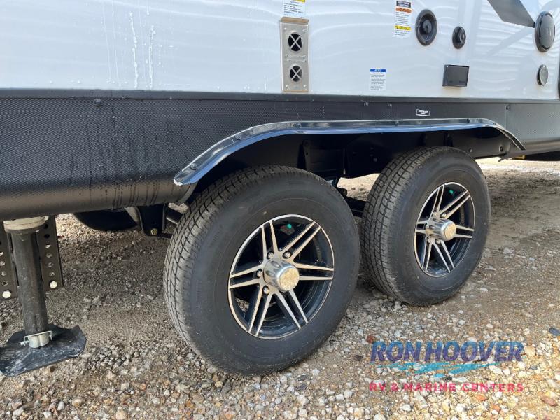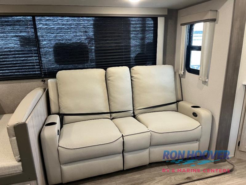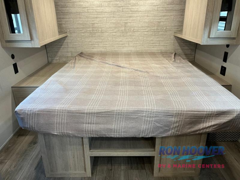 This half-ton friendly trailer is easy to pull and park and is spacious thanks to the large slide out in the main living and kitchen area! You can dine at the booth dinette or choose the free-standing dinette option, and the trundle sofa offers drink holders for your drink when you're relaxing. The rear corner offers a full bathroom and a large wardrobe/pantry for the storage you need. The galley kitchen offers full amenities plus a breakfast bar where you can set out fresh fruit and cereal. And the 15' awning provides protection from the elements plus has the choice of multiple LED colors with the use of the remote.