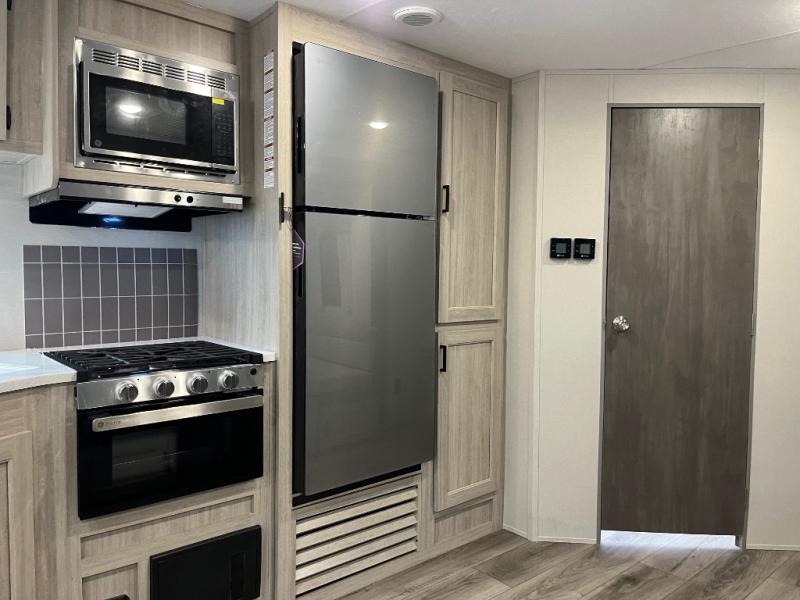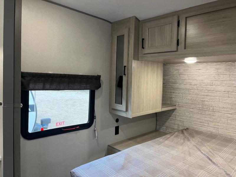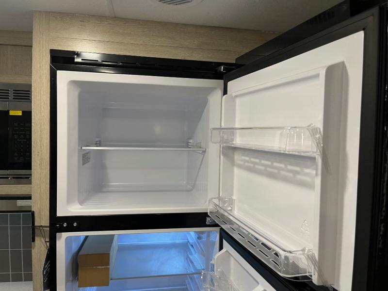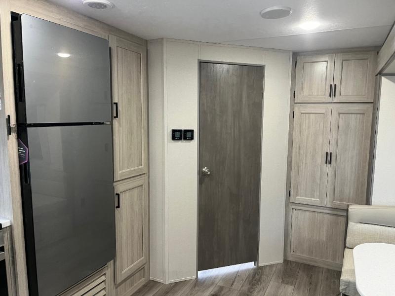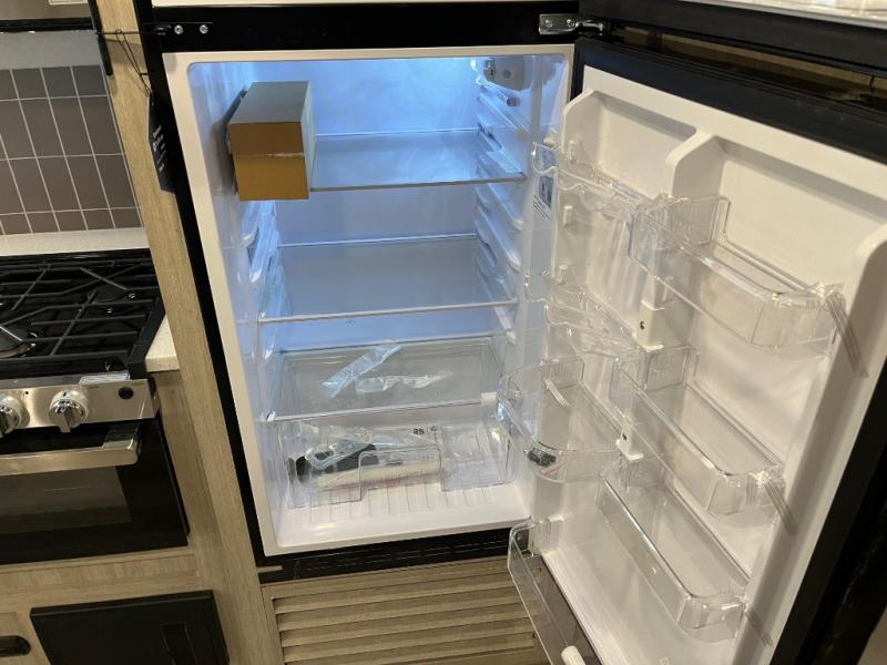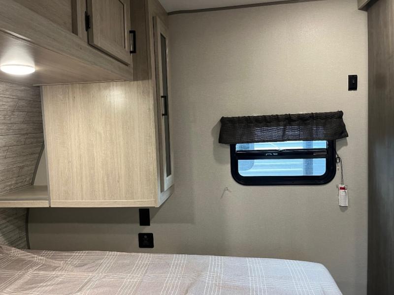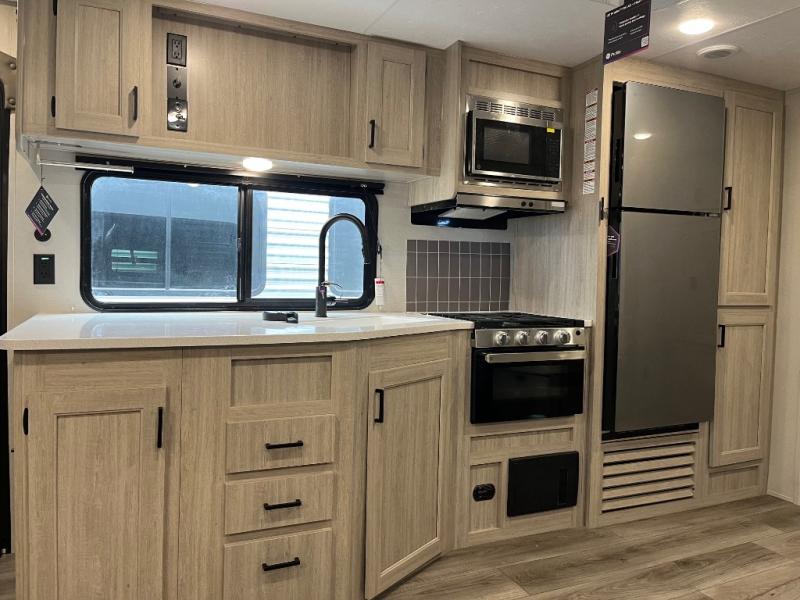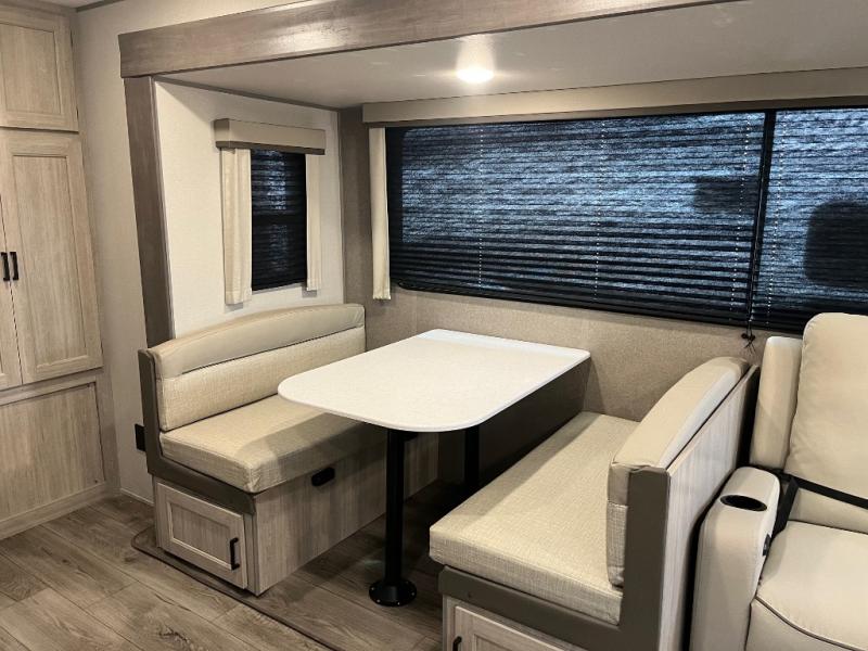 This half-ton friendly trailer is easy to pull and park and is spacious thanks to the large slide out in the main living and kitchen area! You can dine at the booth dinette or choose the free-standing dinette option, and the trundle sofa offers drink holders for your drink when you're relaxing. The rear corner offers a full bathroom and a large wardrobe/pantry for the storage you need. The galley kitchen offers full amenities plus a breakfast bar where you can set out fresh fruit and cereal. And the 15' awning provides protection from the elements plus has the choice of multiple LED colors with the use of the remote.
