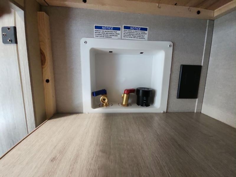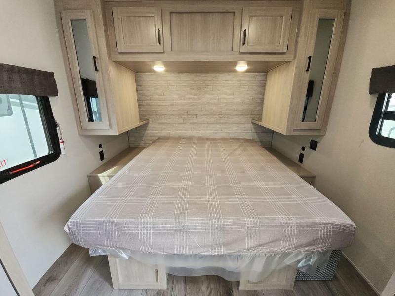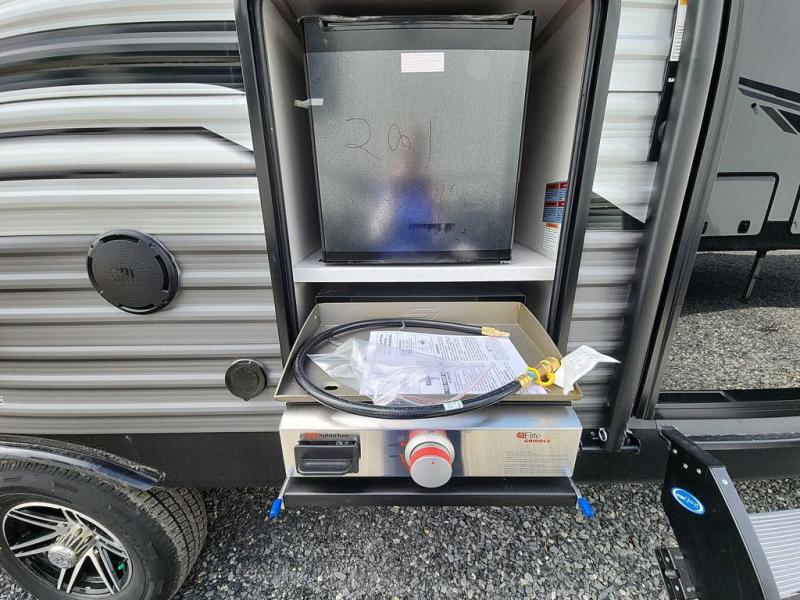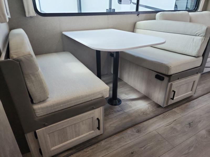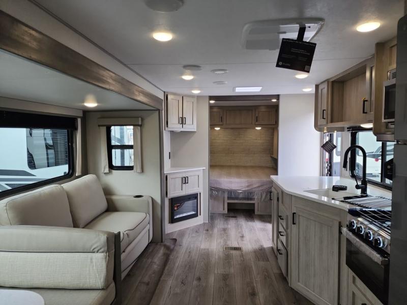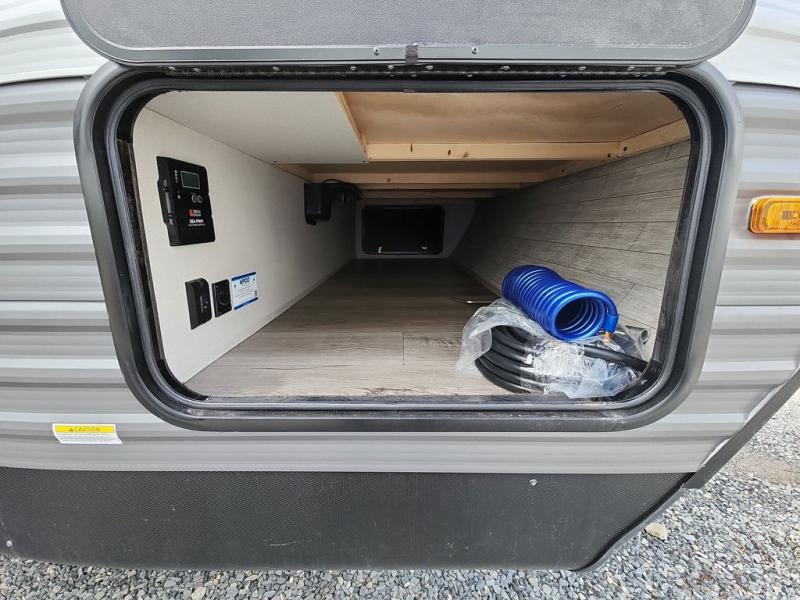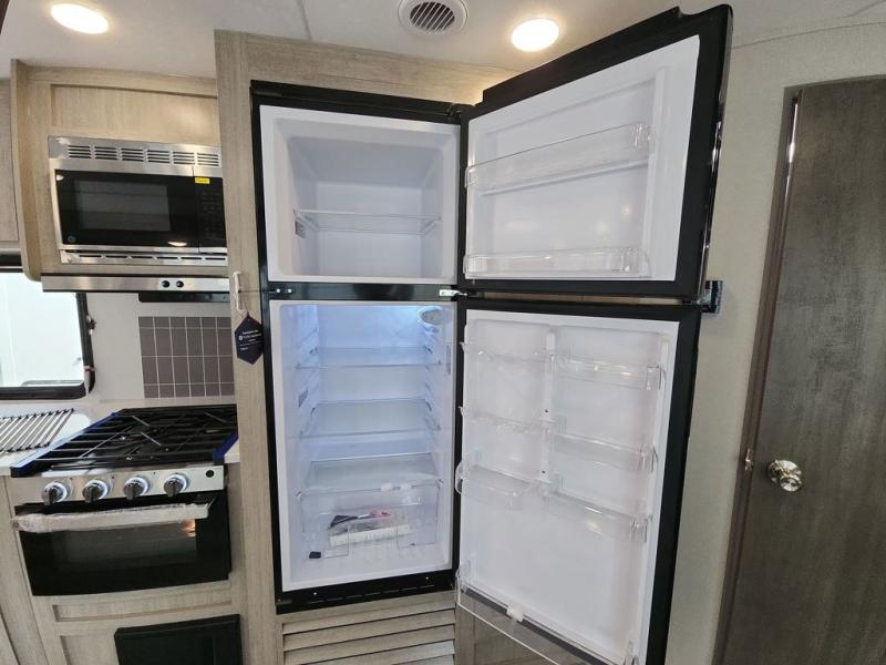 This half-ton friendly trailer is easy to pull and park and is spacious thanks to the large slide out in the main living and kitchen area! You can dine at the booth dinette or choose the free-standing dinette option, and the trundle sofa offers drink holders for your drink when you're relaxing. The rear corner offers a full bathroom and a large wardrobe/pantry for the storage you need. The galley kitchen offers full amenities plus a breakfast bar where you can set out fresh fruit and cereal. And the 15' awning provides protection from the elements plus has the choice of multiple LED colors with the use of the remote.
