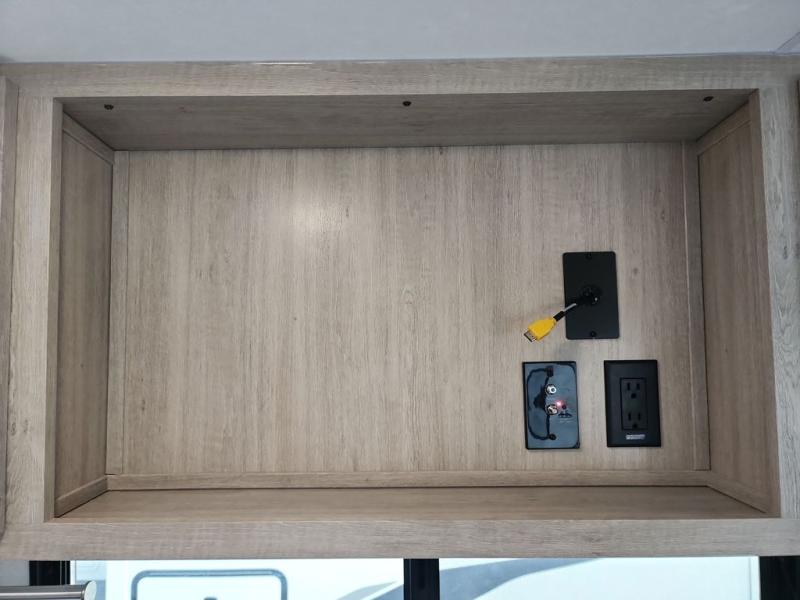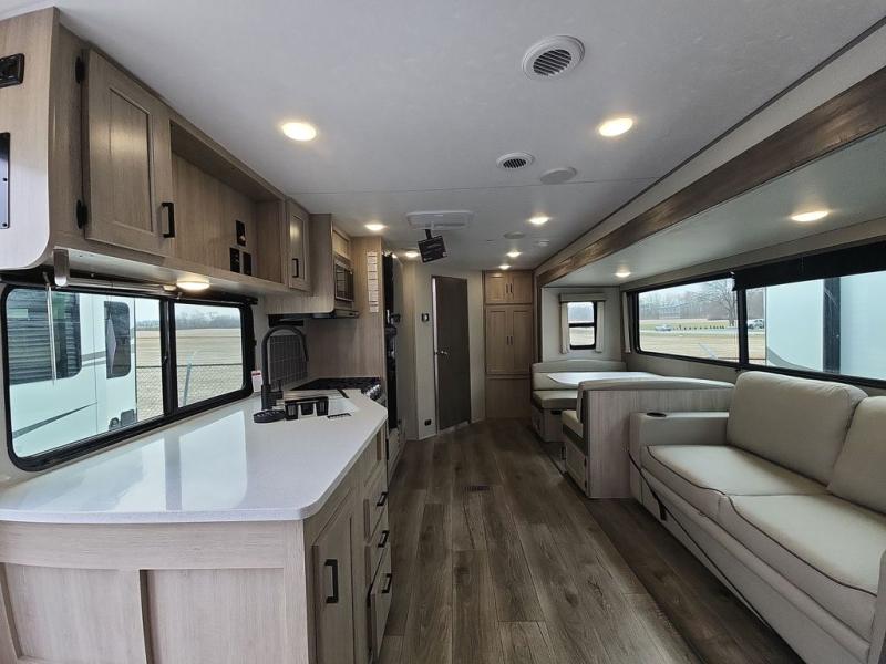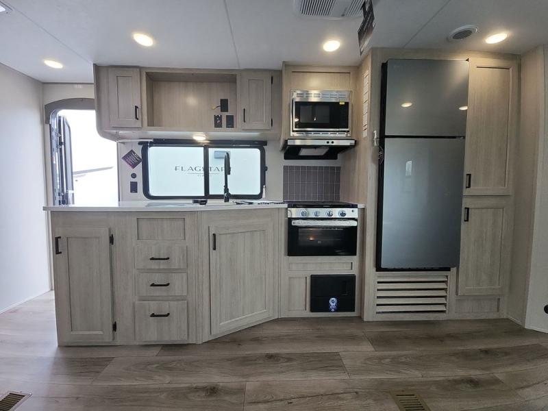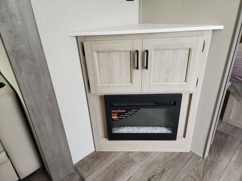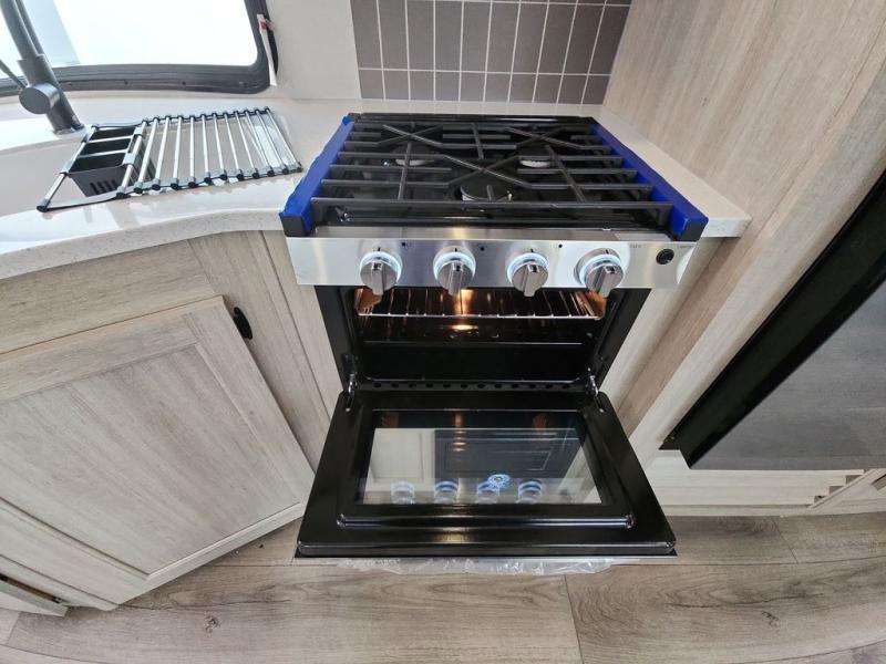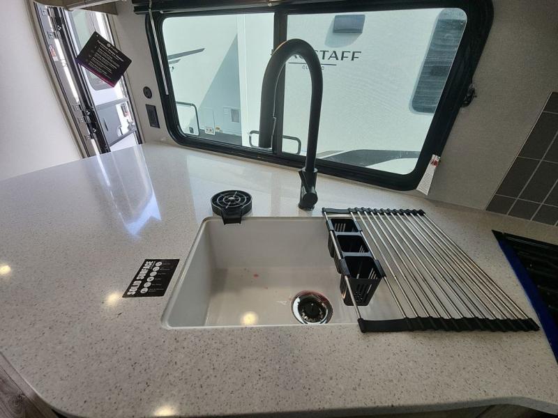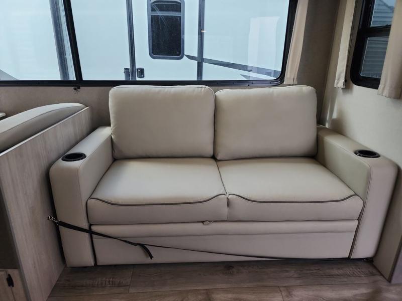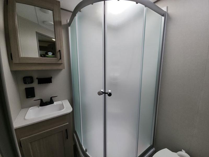 This half-ton friendly trailer is easy to pull and park and is spacious thanks to the large slide out in the main living and kitchen area! You can dine at the booth dinette or choose the free-standing dinette option, and the trundle sofa offers drink holders for your drink when you're relaxing. The rear corner offers a full bathroom and a large wardrobe/pantry for the storage you need. The galley kitchen offers full amenities plus a breakfast bar where you can set out fresh fruit and cereal. And the 15' awning provides protection from the elements plus has the choice of multiple LED colors with the use of the remote.