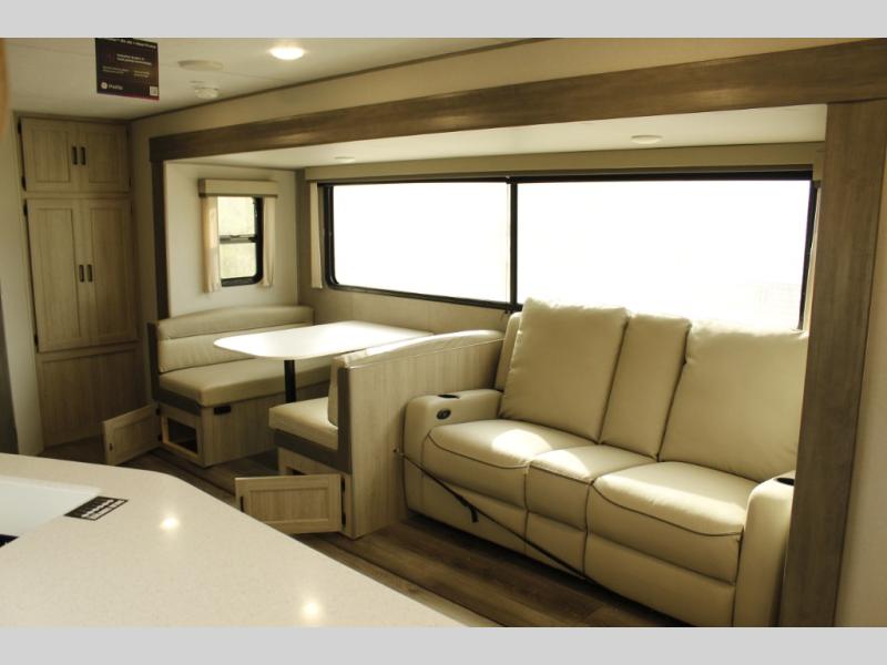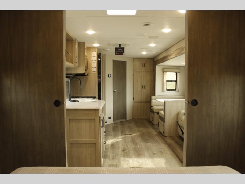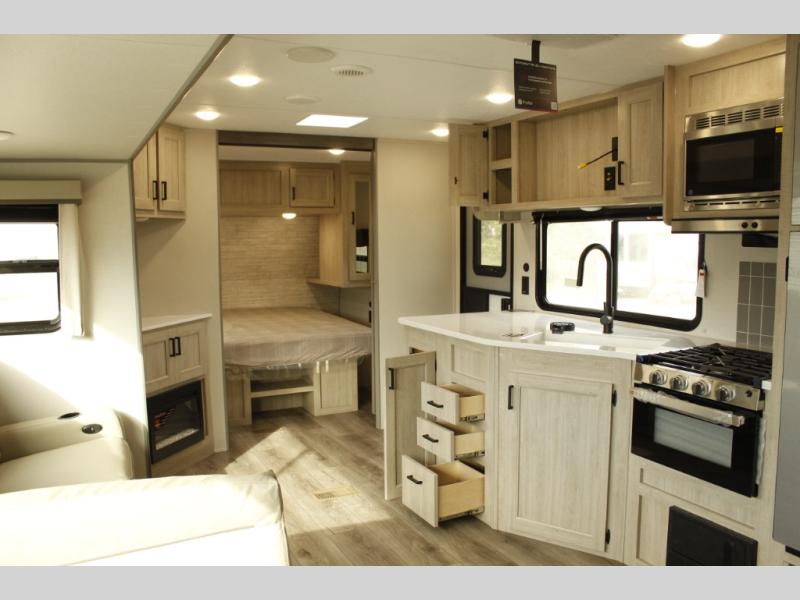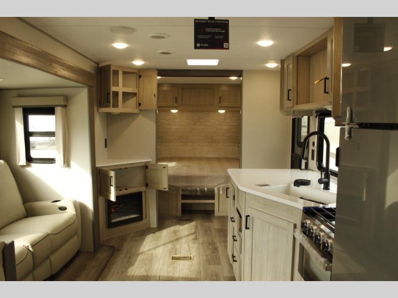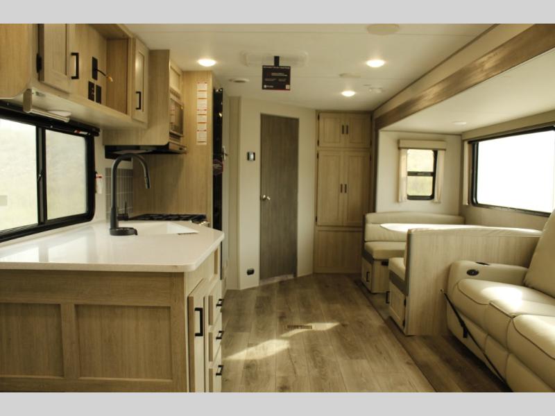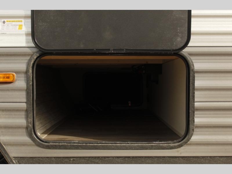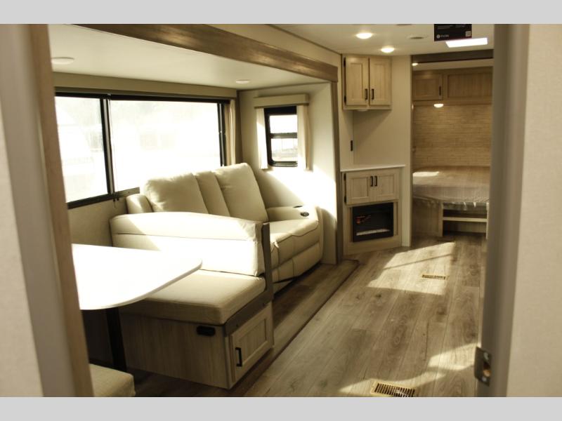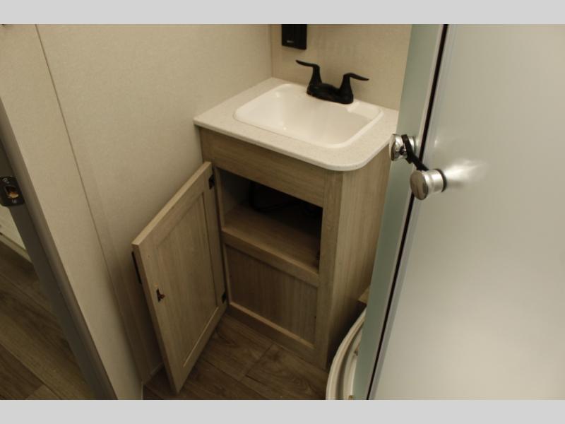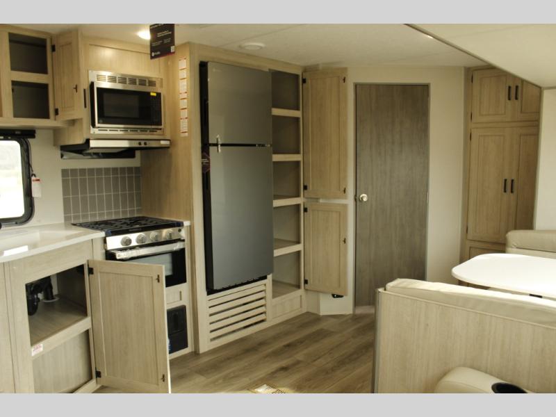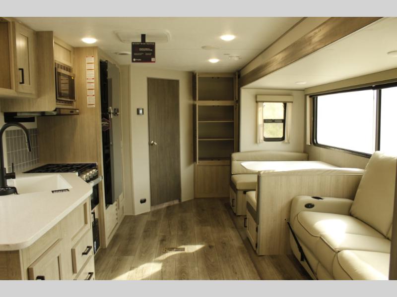 This half-ton friendly trailer is easy to pull and park and is spacious thanks to the large slide out in the main living and kitchen area! You can dine at the booth dinette or choose the free-standing dinette option, and the trundle sofa offers drink holders for your drink when you're relaxing. The rear corner offers a full bathroom and a large wardrobe/pantry for the storage you need. The galley kitchen offers full amenities plus a breakfast bar where you can set out fresh fruit and cereal. And the 15' awning provides protection from the elements plus has the choice of multiple LED colors with the use of the remote.