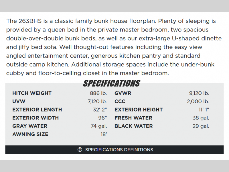 When you enjoy camping with your own accommodations and space for the whole crew, hitch this trailer up and head to the campgrounds! After loading everything easily thanks to the dual entry doors and all the interior and exterior storage, you will have no worries that you left anything behind. The electric awning is easy to set up, like the large slide out, and the awning offers multicolor LED lights to choose from by using the remote. When you are outside the cook might like to make a meal using the outside camper kitchen. The interior kitchen offers full amenities including a pantry, and everyone can enjoy the angled entertainment center. There are double-size bunks with a ladder for the kids and a walk-around queen bed for the owner to sleep on, plus furniture in the living area that doubles as additional sleeping space!
