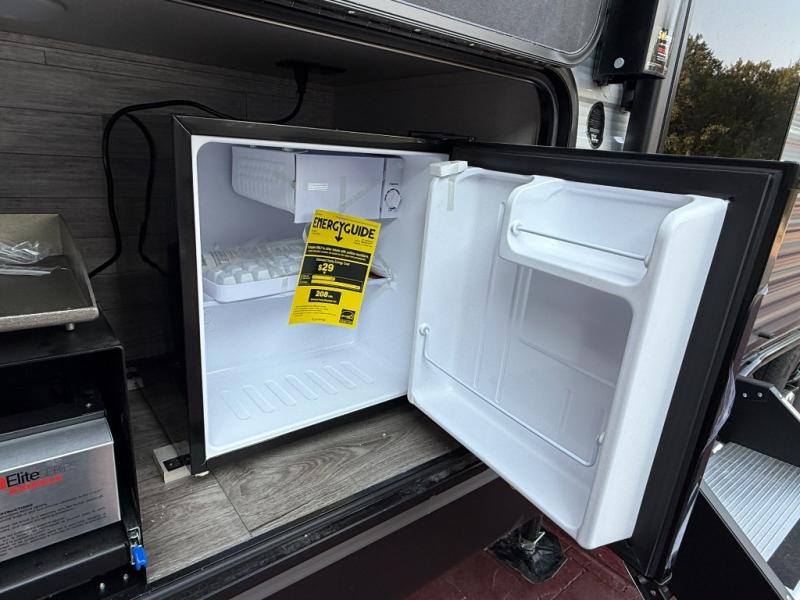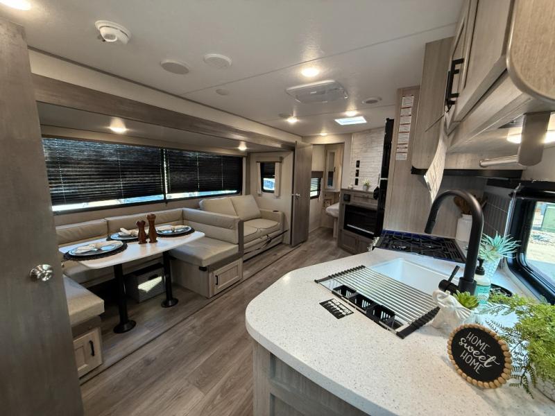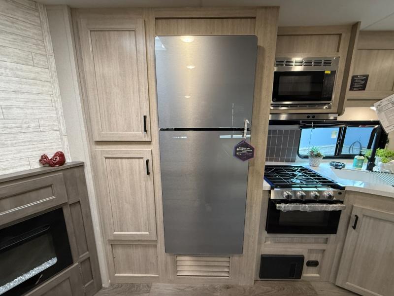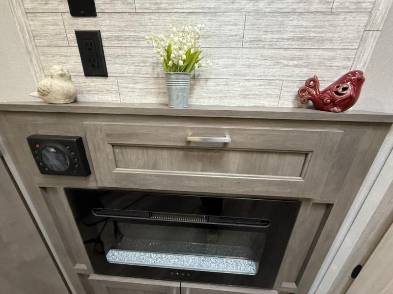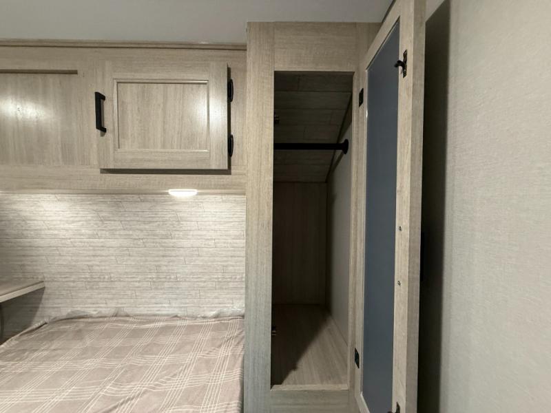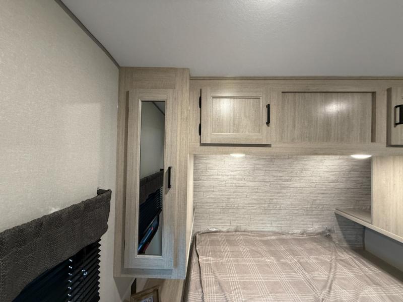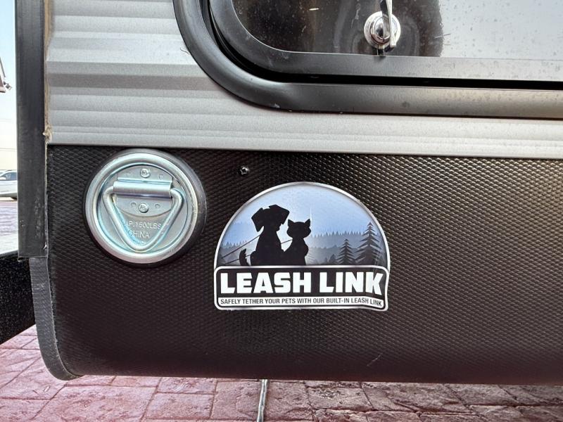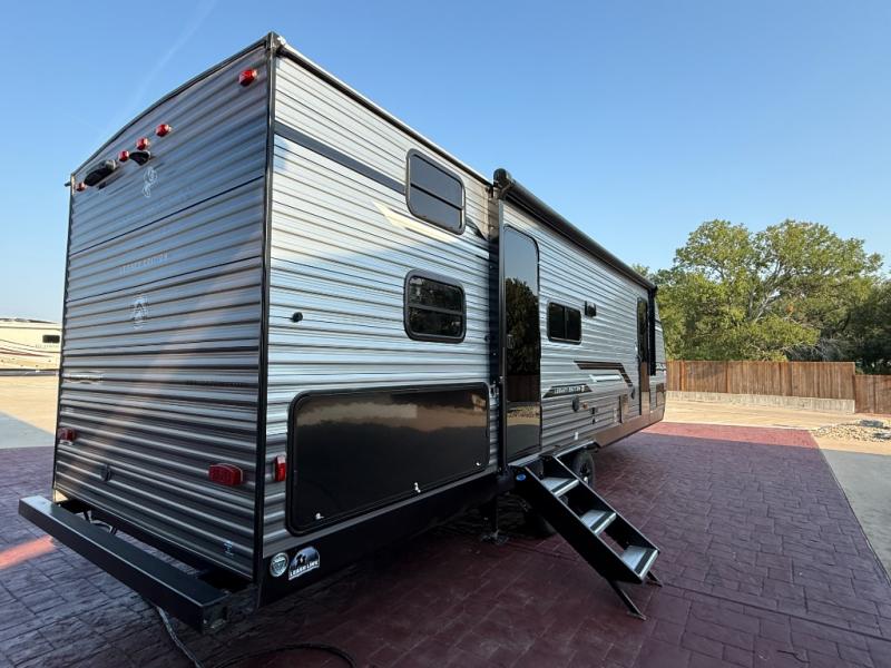 When you enjoy camping with your own accommodations and space for the whole crew, hitch this trailer up and head to the campgrounds! After loading everything easily thanks to the dual entry doors and all the interior and exterior storage, you will have no worries that you left anything behind. The electric awning is easy to set up, like the large slide out, and the awning offers multicolor LED lights to choose from by using the remote. When you are outside the cook might like to make a meal using the outside camper kitchen. The interior kitchen offers full amenities including a pantry, and everyone can enjoy the angled entertainment center. There are double-size bunks with a ladder for the kids and a walk-around queen bed for the owner to sleep on, plus furniture in the living area that doubles as additional sleeping space!