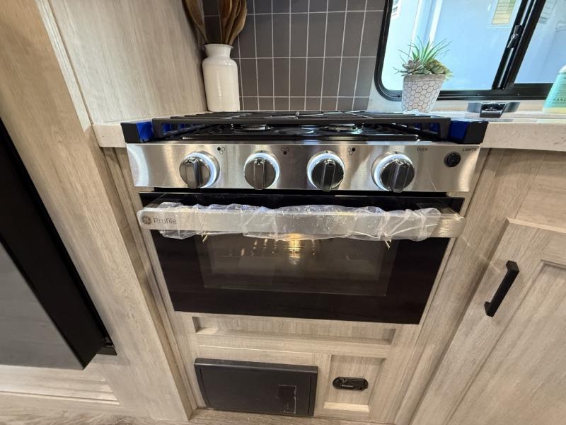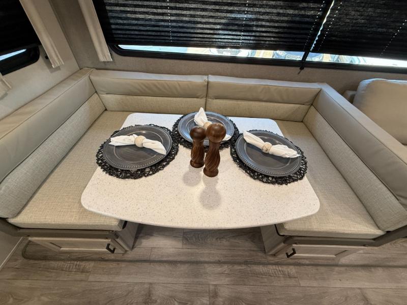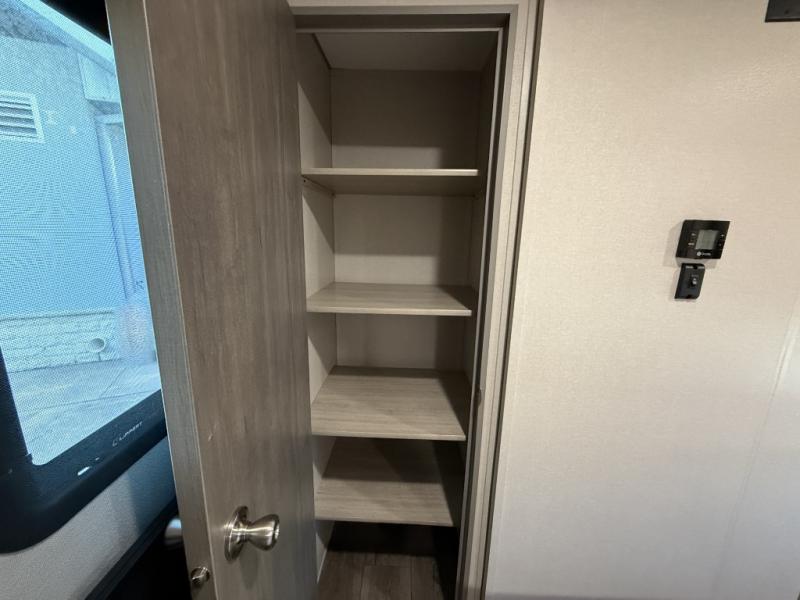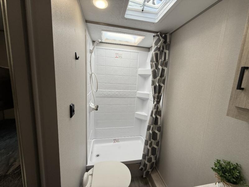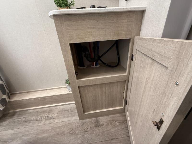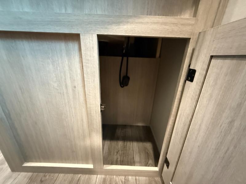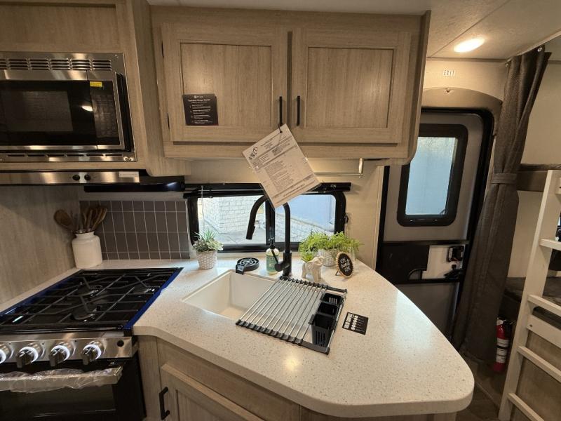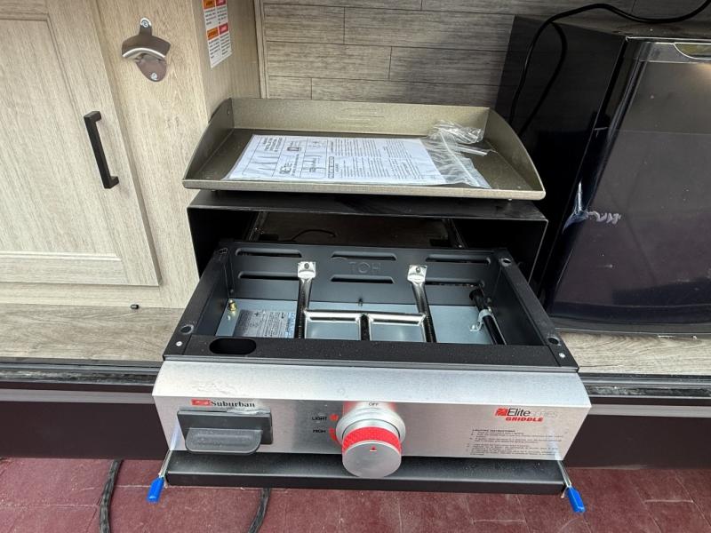 When you enjoy camping with your own accommodations and space for the whole crew, hitch this trailer up and head to the campgrounds! After loading everything easily thanks to the dual entry doors and all the interior and exterior storage, you will have no worries that you left anything behind. The electric awning is easy to set up, like the large slide out, and the awning offers multicolor LED lights to choose from by using the remote. When you are outside the cook might like to make a meal using the outside camper kitchen. The interior kitchen offers full amenities including a pantry, and everyone can enjoy the angled entertainment center. There are double-size bunks with a ladder for the kids and a walk-around queen bed for the owner to sleep on, plus furniture in the living area that doubles as additional sleeping space!