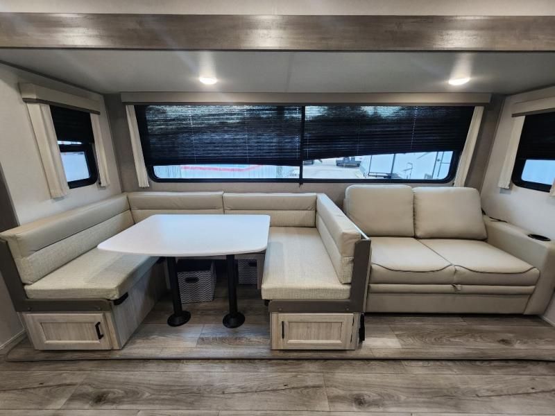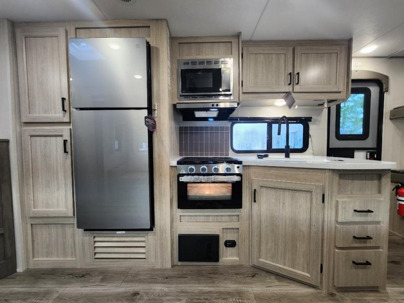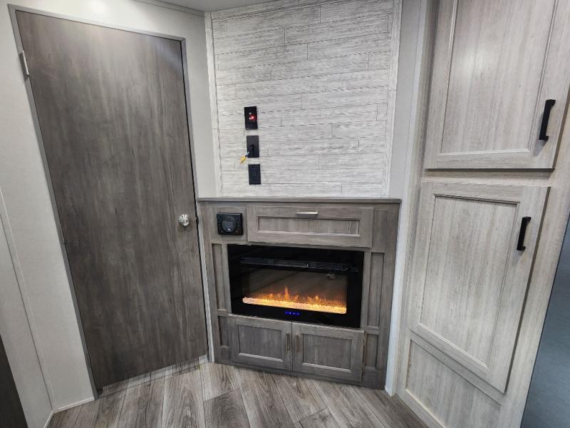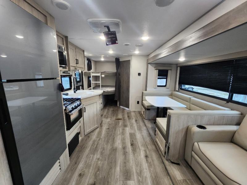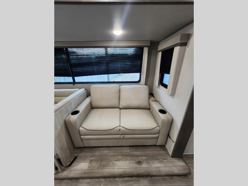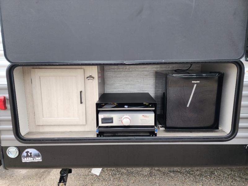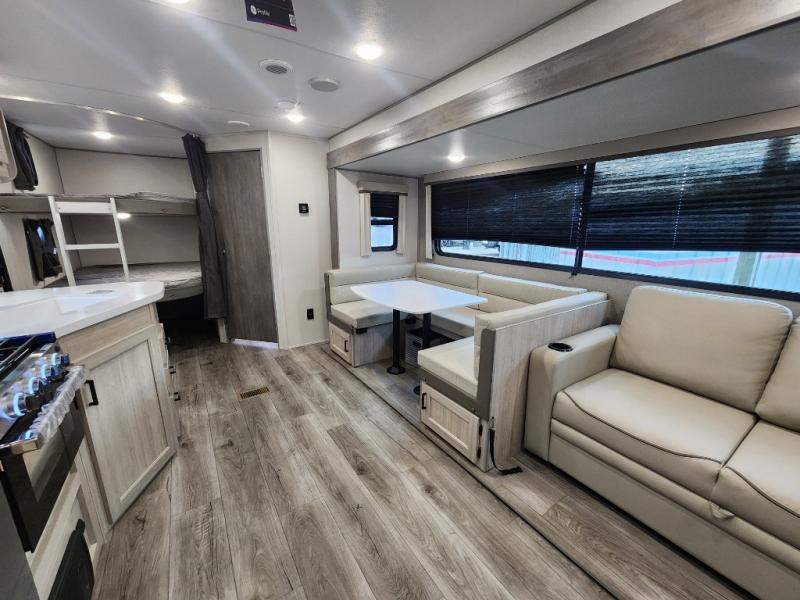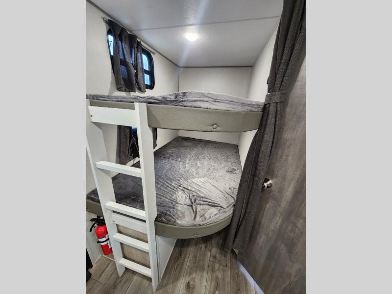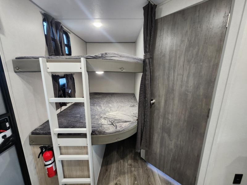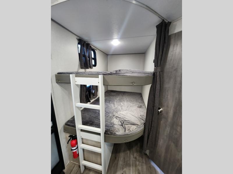 When you enjoy camping with your own accommodations and space for the whole crew, hitch this trailer up and head to the campgrounds! After loading everything easily thanks to the dual entry doors and all the interior and exterior storage, you will have no worries that you left anything behind. The electric awning is easy to set up, like the large slide out, and the awning offers multicolor LED lights to choose from by using the remote. When you are outside the cook might like to make a meal using the outside camper kitchen. The interior kitchen offers full amenities including a pantry, and everyone can enjoy the angled entertainment center. There are double-size bunks with a ladder for the kids and a walk-around queen bed for the owner to sleep on, plus furniture in the living area that doubles as additional sleeping space!