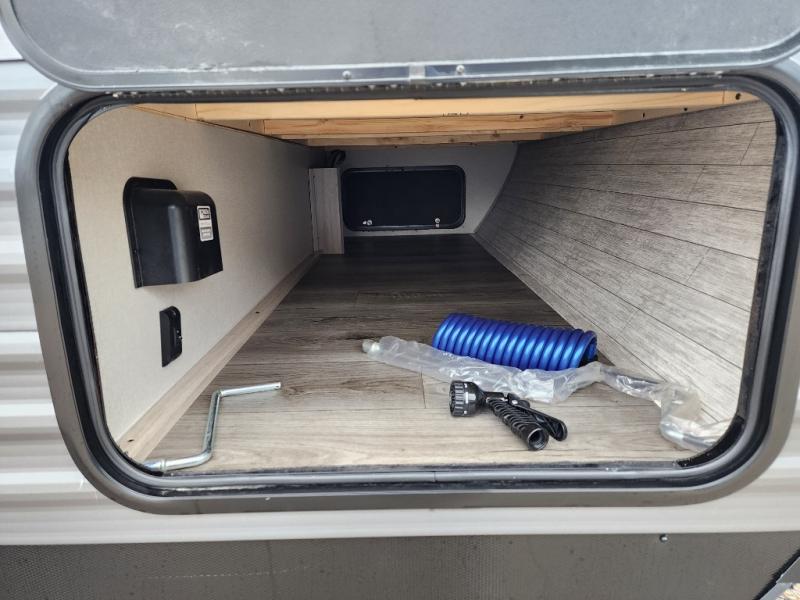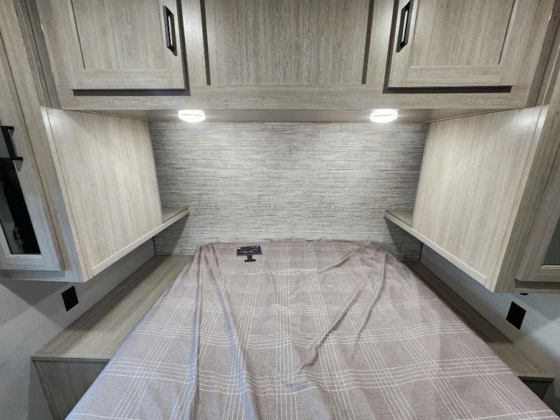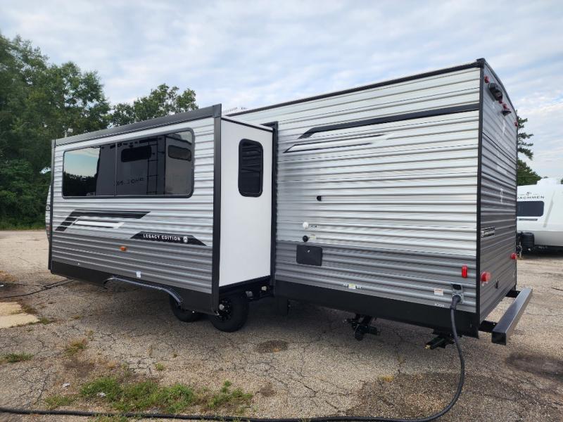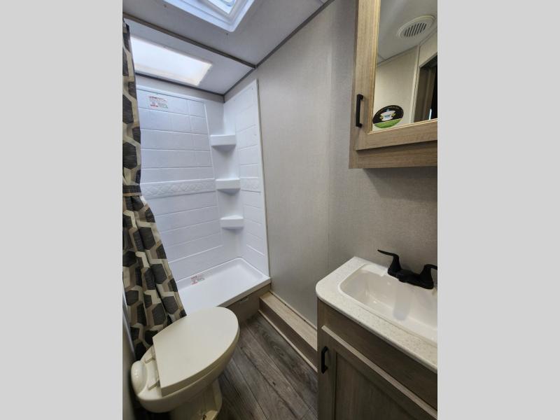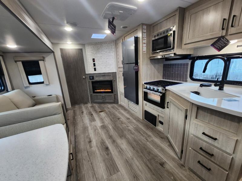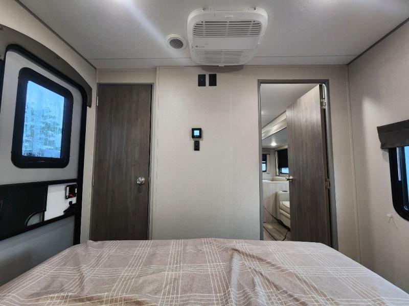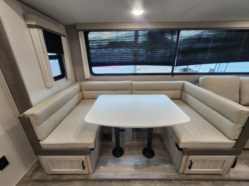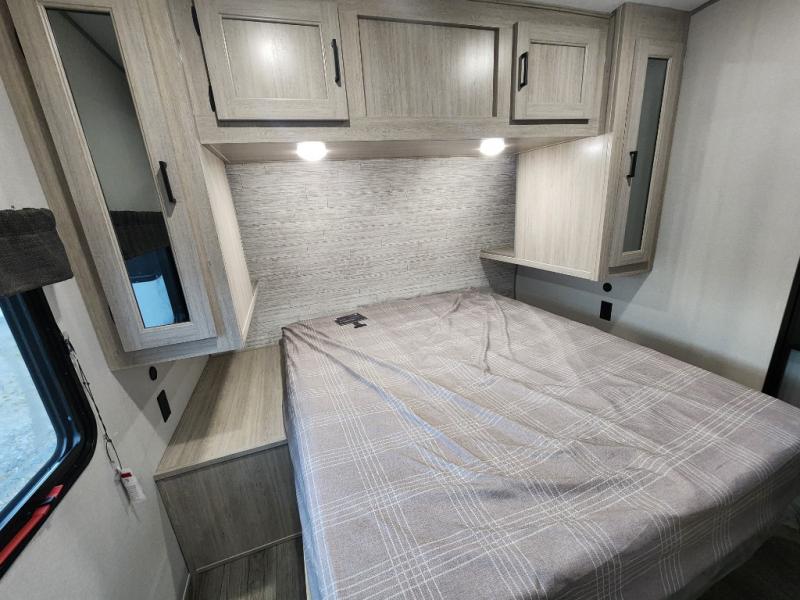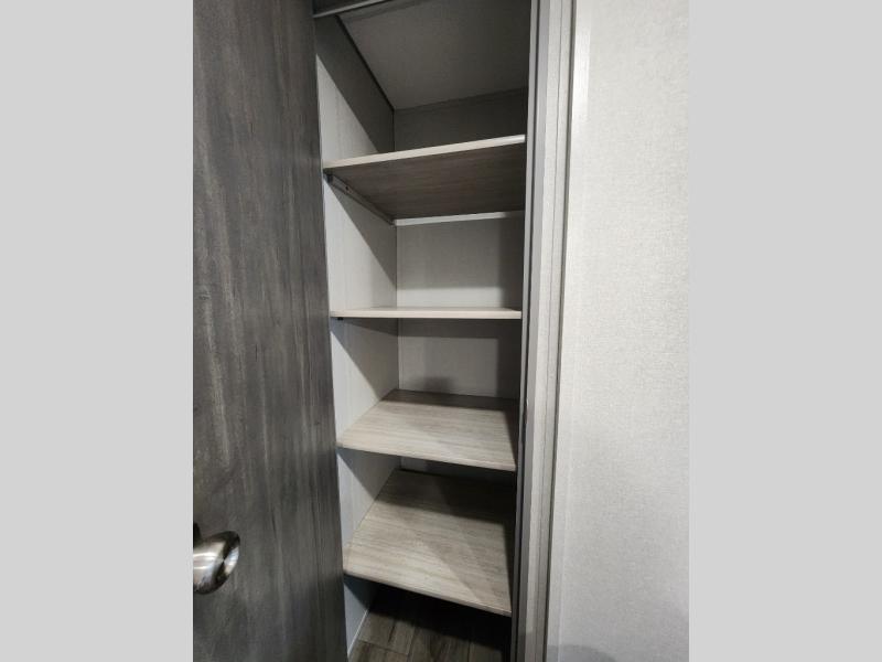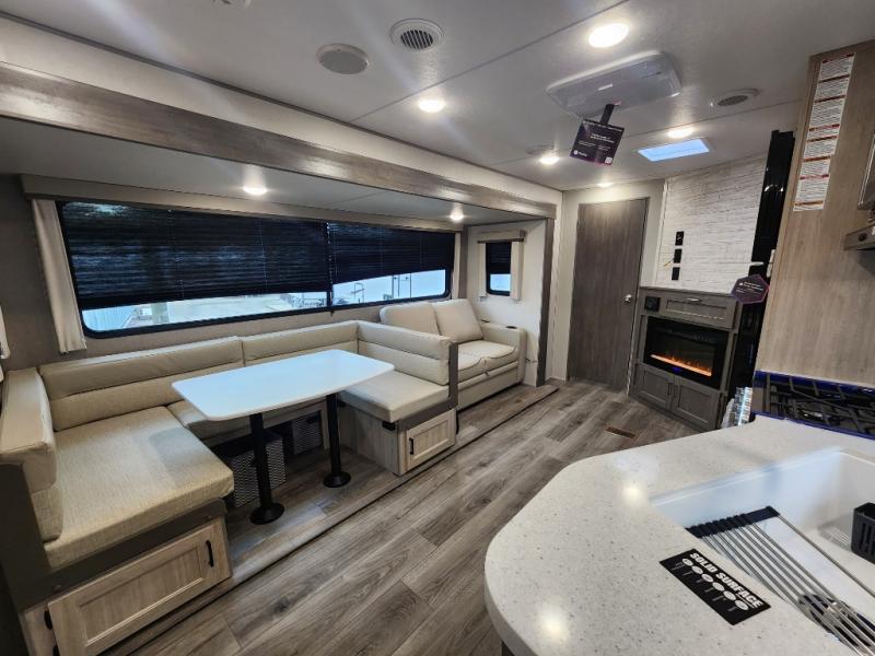 When you enjoy camping with your own accommodations and space for the whole crew, hitch this trailer up and head to the campgrounds! After loading everything easily thanks to the dual entry doors and all the interior and exterior storage, you will have no worries that you left anything behind. The electric awning is easy to set up, like the large slide out, and the awning offers multicolor LED lights to choose from by using the remote. When you are outside the cook might like to make a meal using the outside camper kitchen. The interior kitchen offers full amenities including a pantry, and everyone can enjoy the angled entertainment center. There are double-size bunks with a ladder for the kids and a walk-around queen bed for the owner to sleep on, plus furniture in the living area that doubles as additional sleeping space!