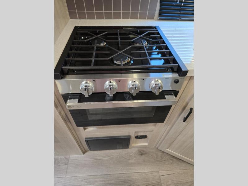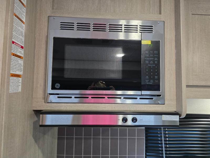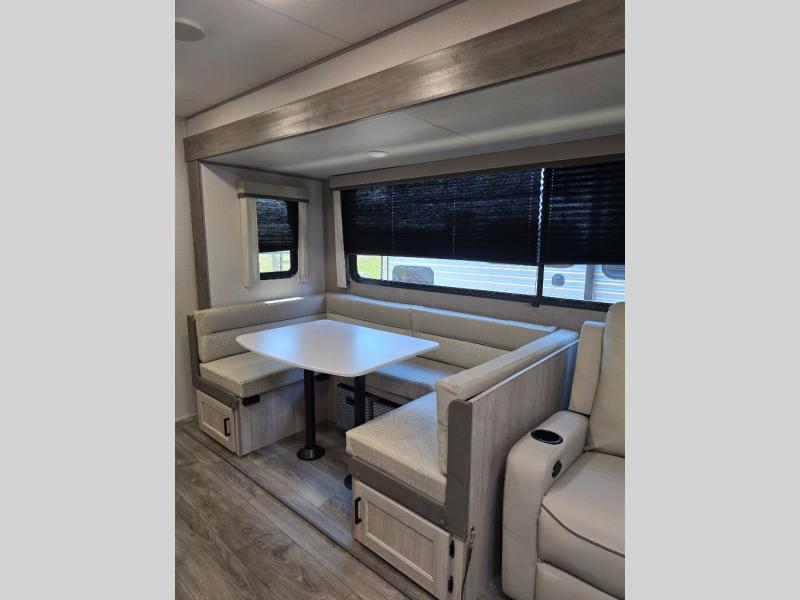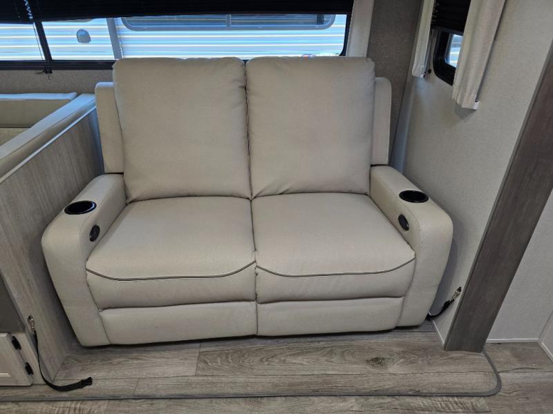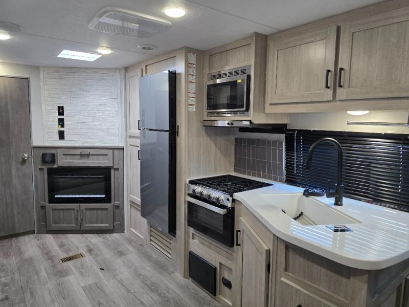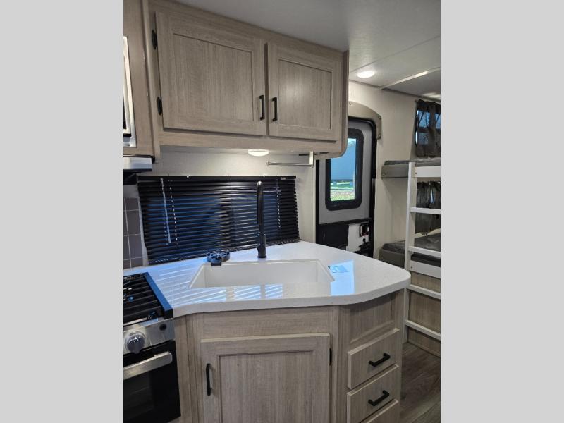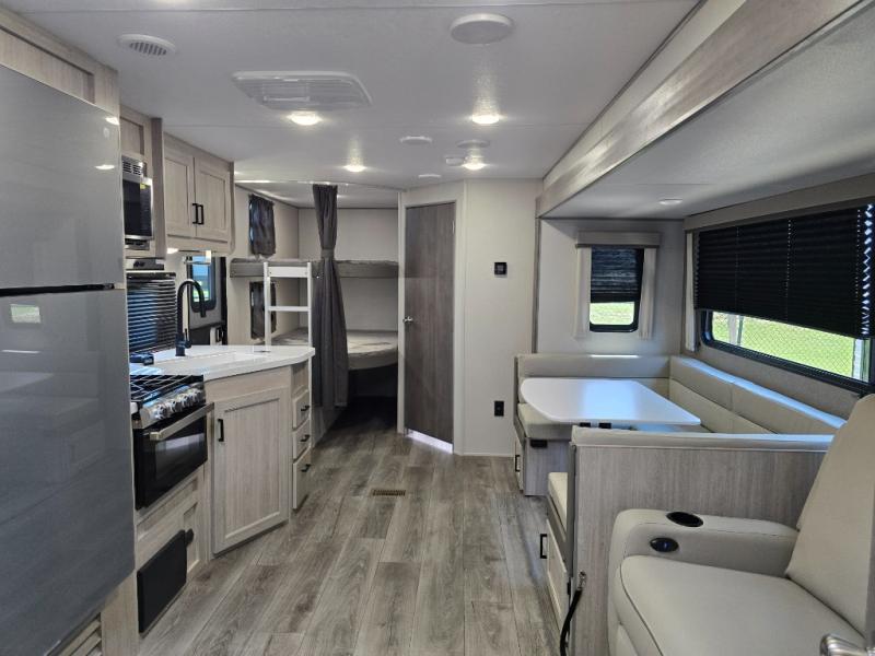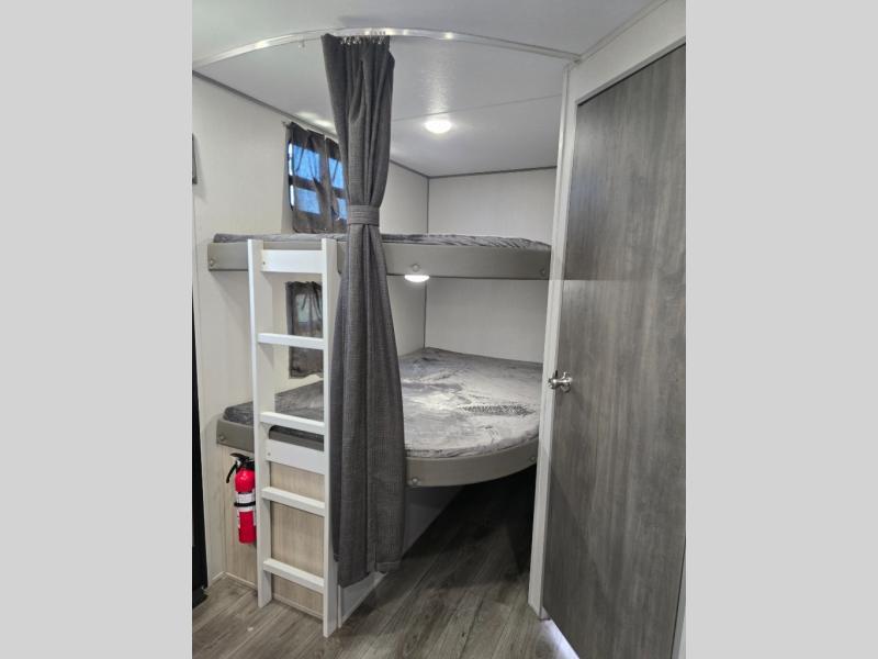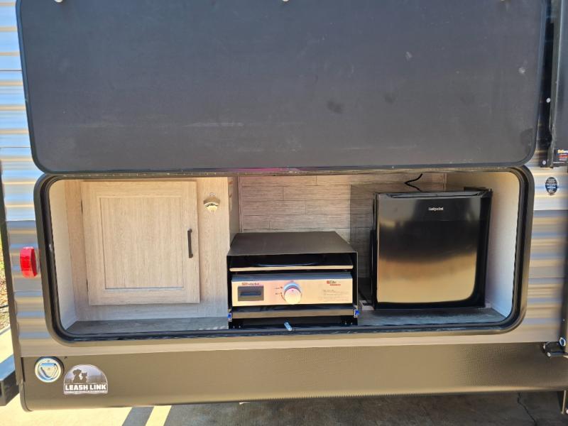 When you enjoy camping with your own accommodations and space for the whole crew, hitch this trailer up and head to the campgrounds! After loading everything easily thanks to the dual entry doors and all the interior and exterior storage, you will have no worries that you left anything behind. The electric awning is easy to set up, like the large slide out, and the awning offers multicolor LED lights to choose from by using the remote. When you are outside the cook might like to make a meal using the outside camper kitchen. The interior kitchen offers full amenities including a pantry, and everyone can enjoy the angled entertainment center. There are double-size bunks with a ladder for the kids and a walk-around queen bed for the owner to sleep on, plus furniture in the living area that doubles as additional sleeping space!