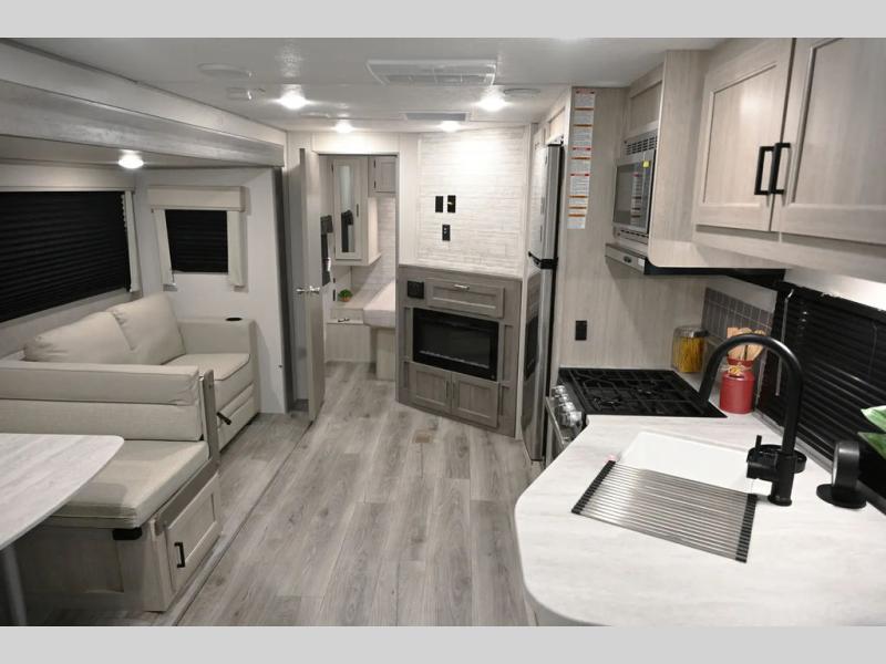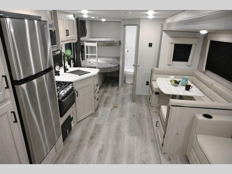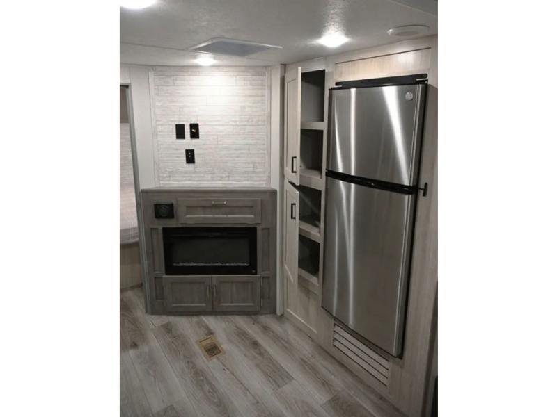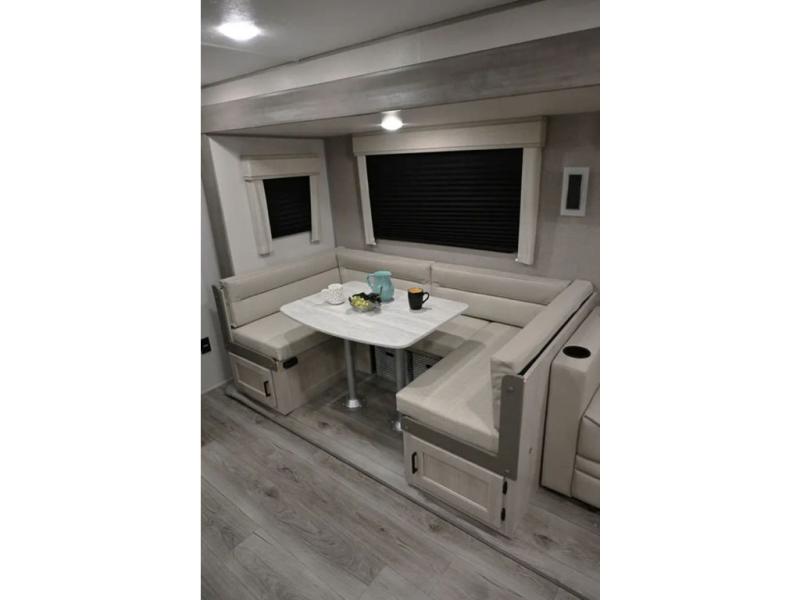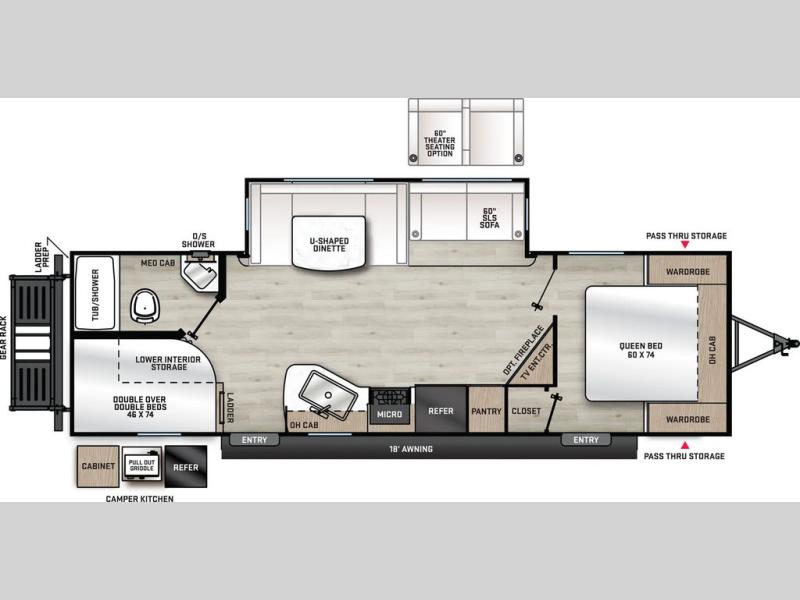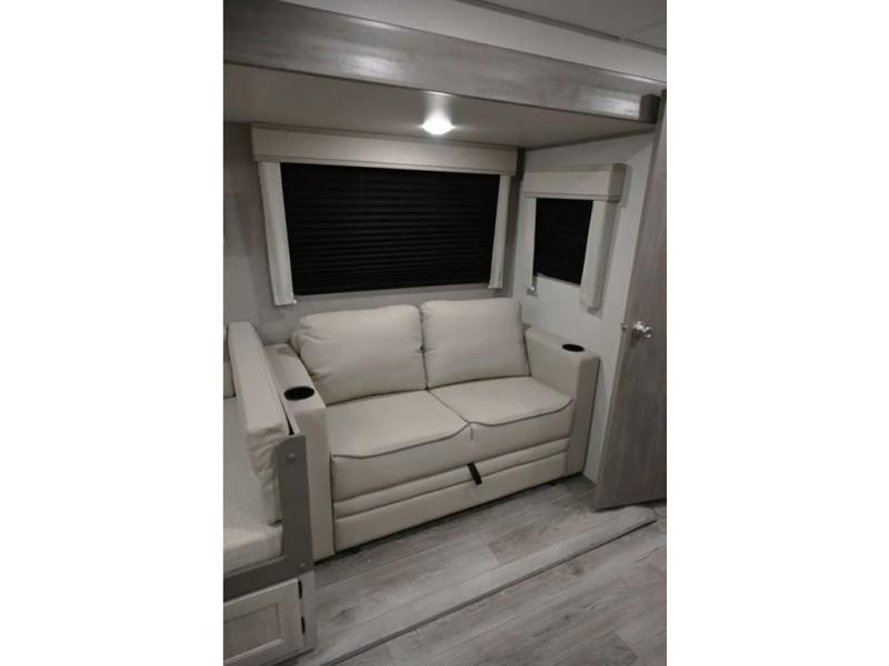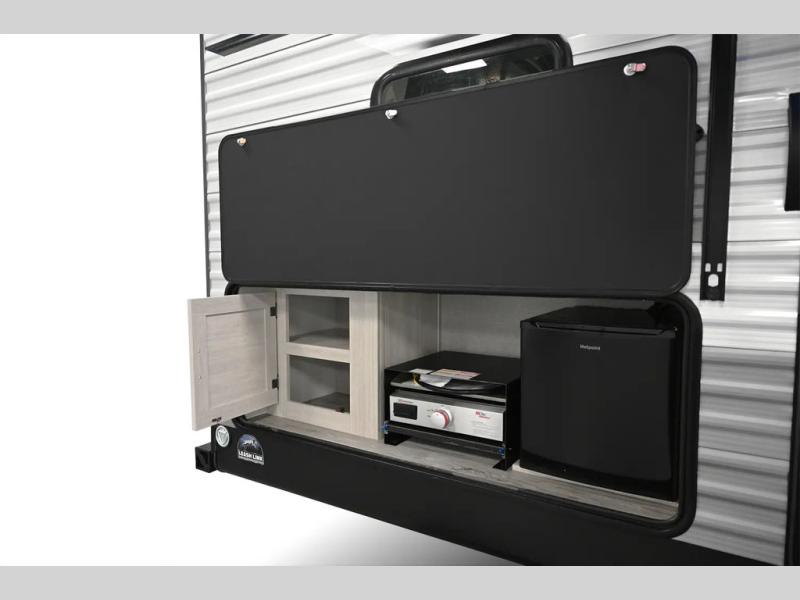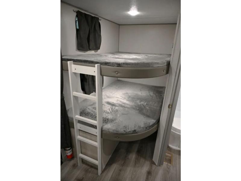 When you enjoy camping with your own accommodations and space for the whole crew, hitch this trailer up and head to the campgrounds! After loading everything easily thanks to the dual entry doors and all the interior and exterior storage, you will have no worries that you left anything behind. The electric awning is easy to set up, and the awning offers multicolor LED lights to choose from by using the remote. When you are outside the cook might like to make a meal using the outside camper kitchen. The interior kitchen offers full amenities including a pantry, and everyone can enjoy the angled entertainment center. There are double-size bunks with a ladder for the kids and a walk-around RV queen bed for the owner to sleep on, plus furniture in the living area that doubles as additional sleeping space!